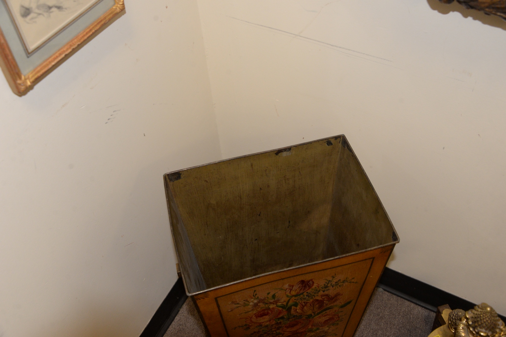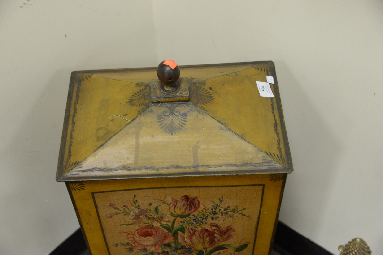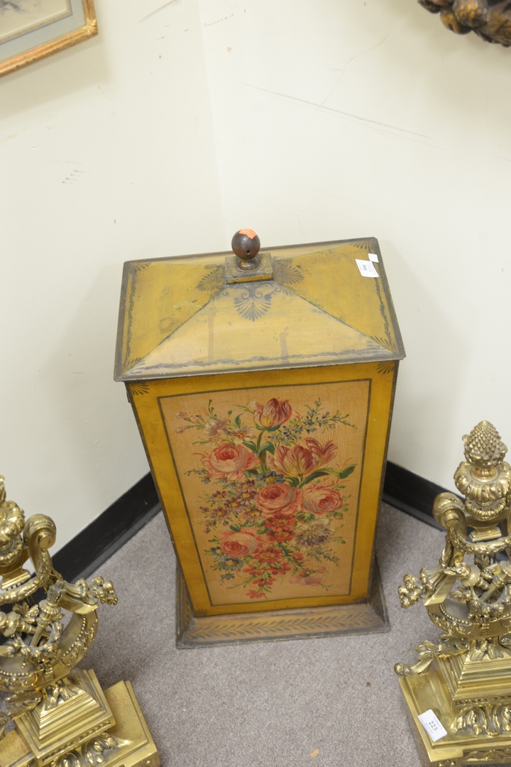 Victorian tole coal hod, painted yellow with flowers, height 27 inches, width 14 inches.