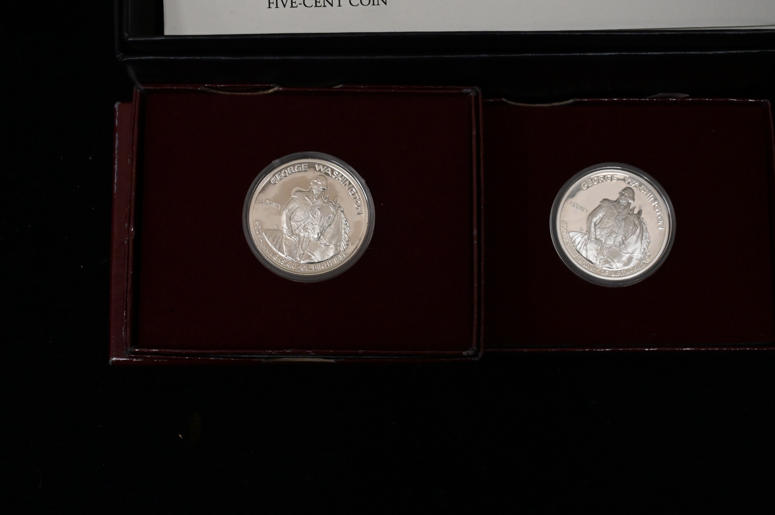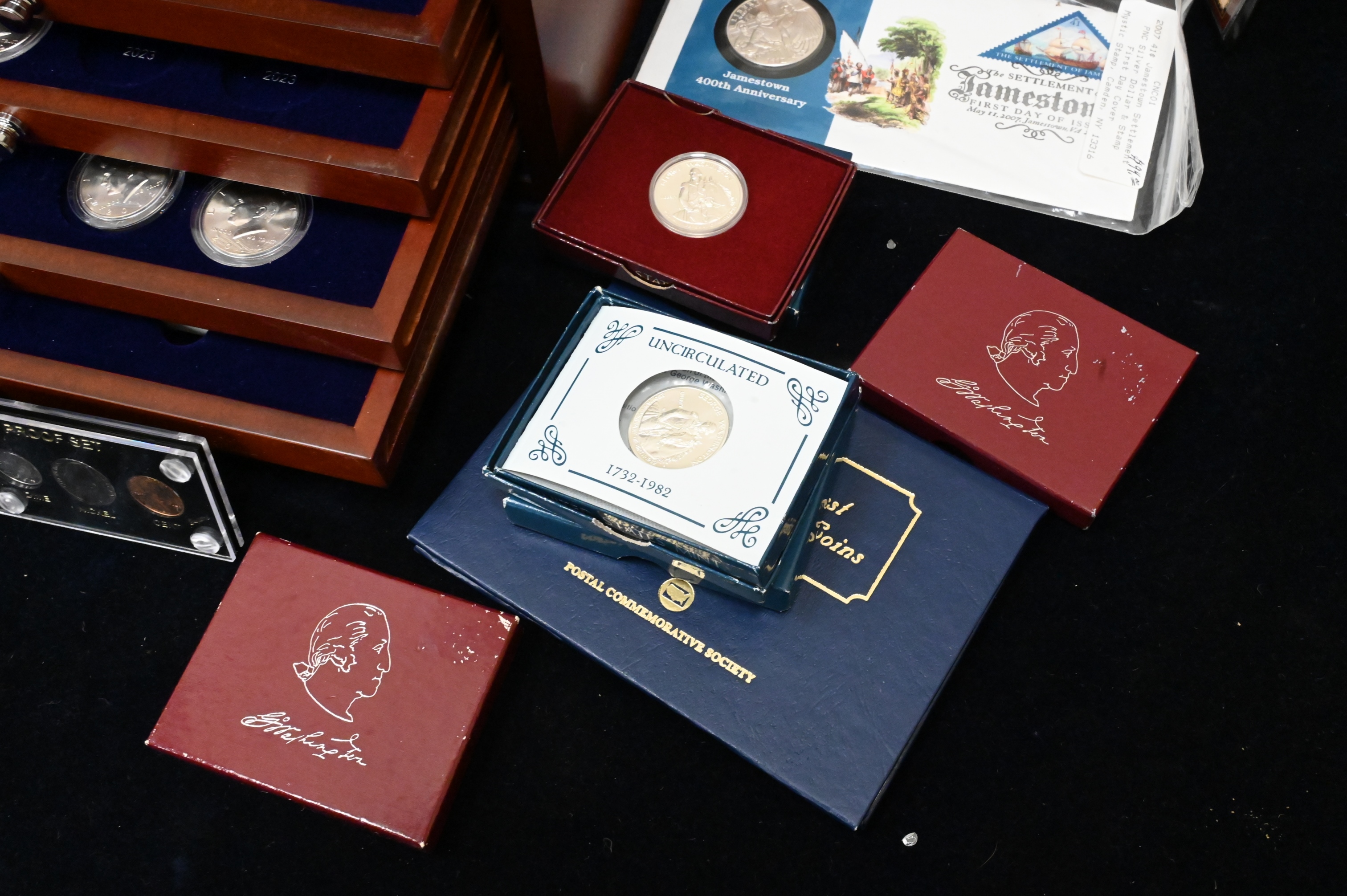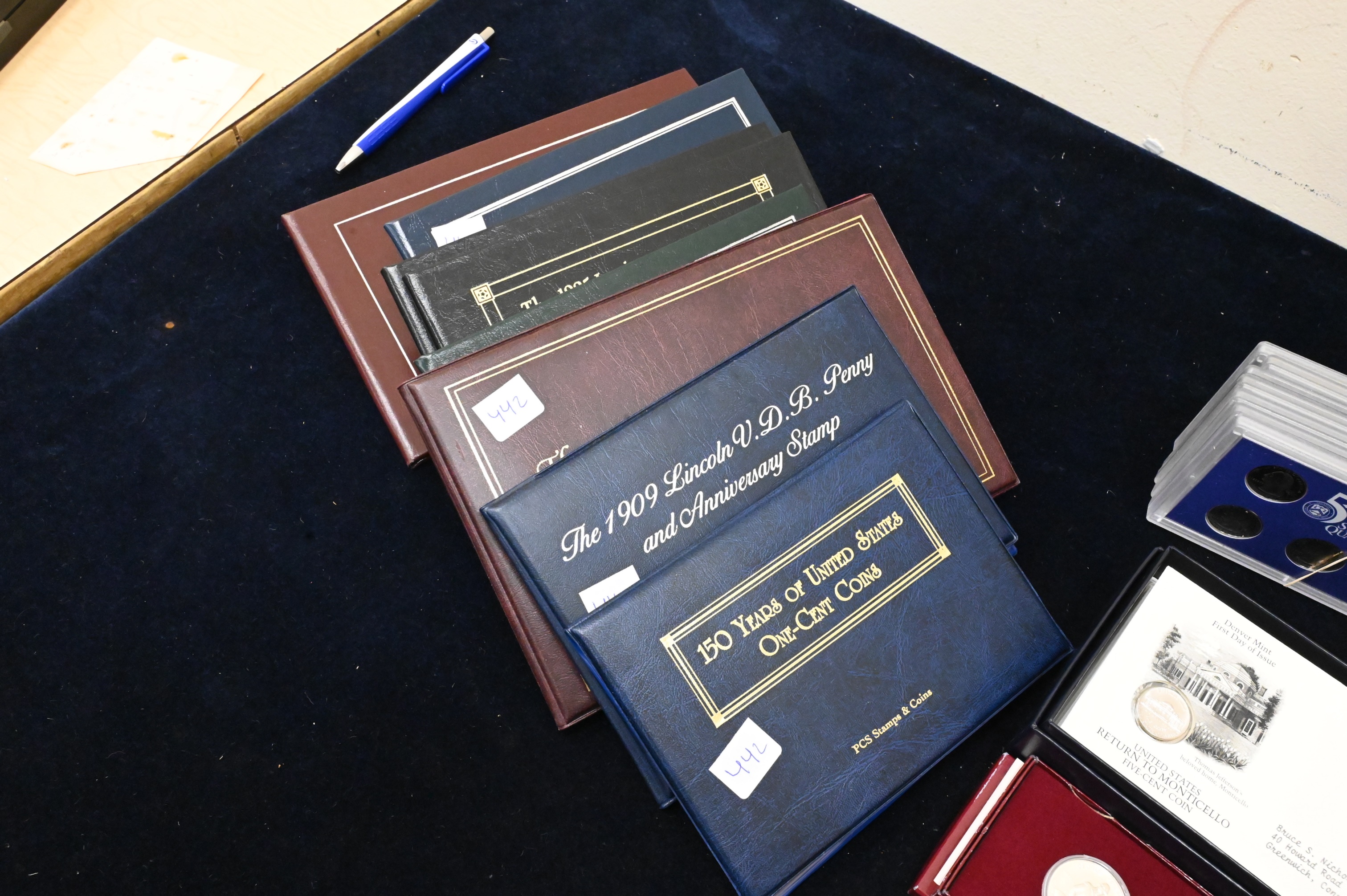 Box Lot of New Five Cent Coins, six proof George Washington halfs 90% proofs, three George Washington halfs, one Jamestown $1 proof, one 1828 half cent, one album of cents, one 1909 cent in holder, one album of 4 york pennies, one album of two Indian cents, one morgan 1890 CC dollar good 1 1918 illinois commem, one 1925 lexington, comemm, one 1922 Grant commem, and one 1920 pilgrim commem