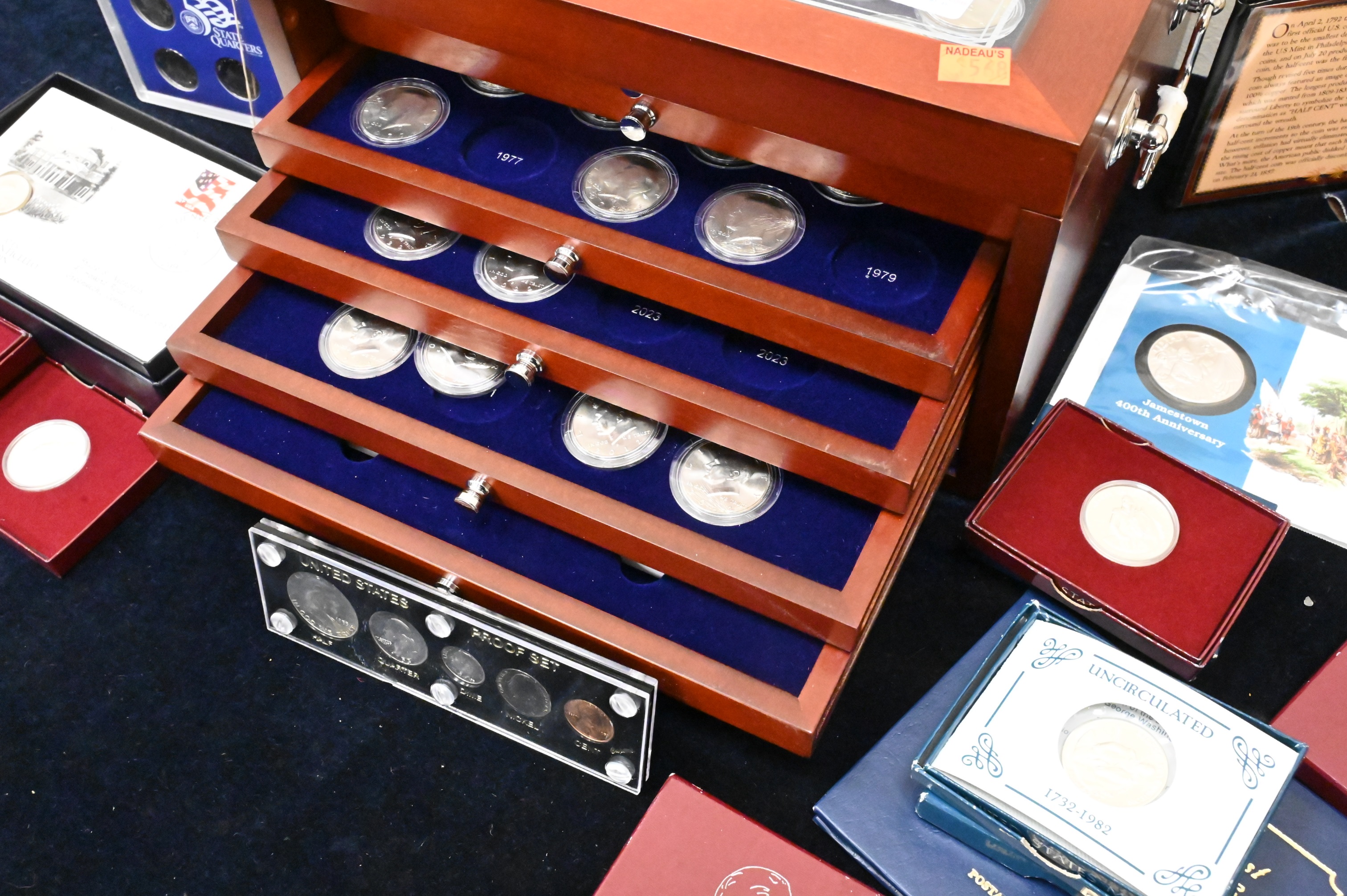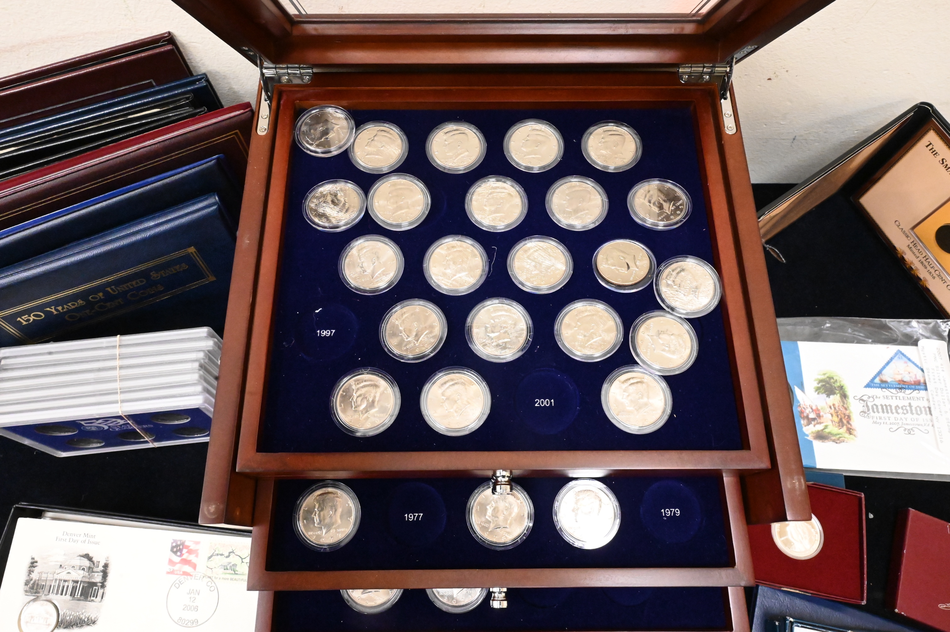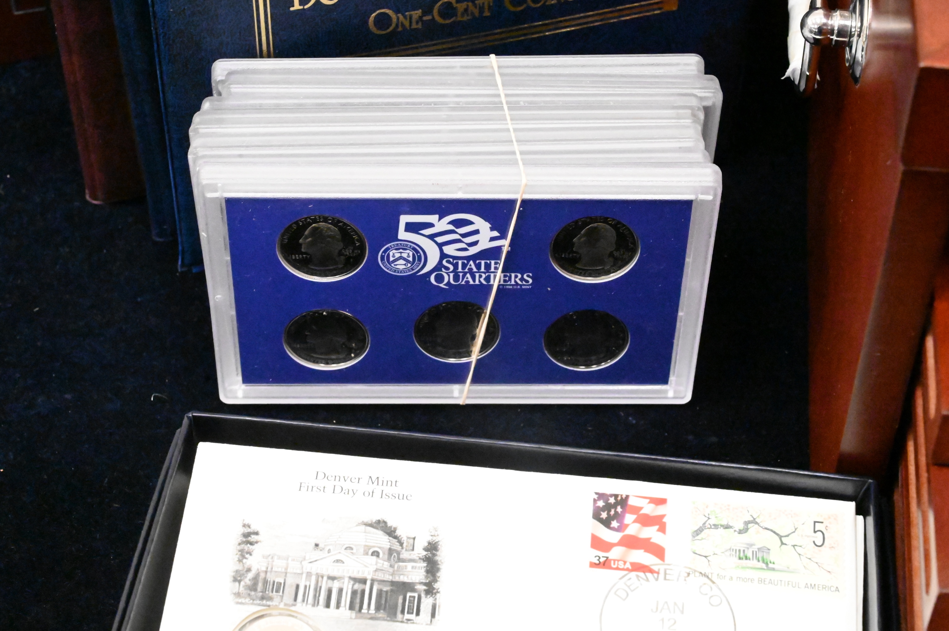 Box Lot of New Five Cent Coins, six proof George Washington halfs 90% proofs, three George Washington halfs, one Jamestown $1 proof, one 1828 half cent, one album of cents, one 1909 cent in holder, one album of 4 york pennies, one album of two Indian cents, one morgan 1890 CC dollar good 1 1918 illinois commem, one 1925 lexington, comemm, one 1922 Grant commem, and one 1920 pilgrim commem