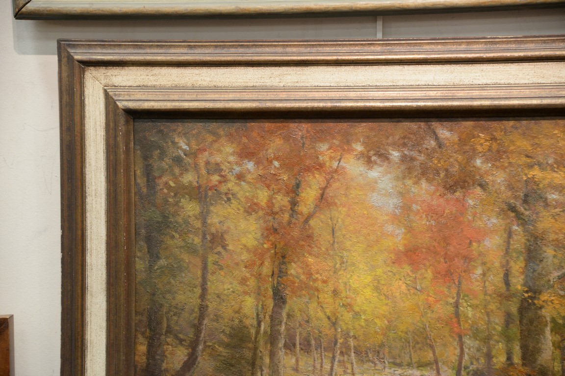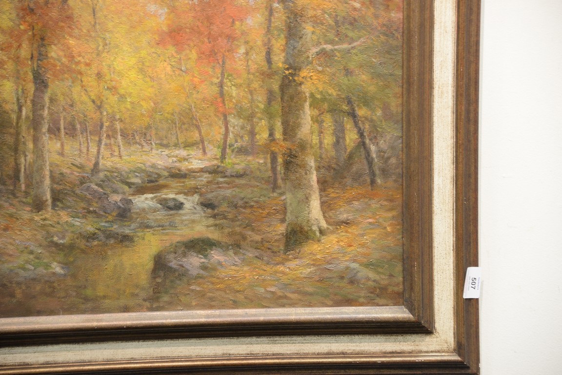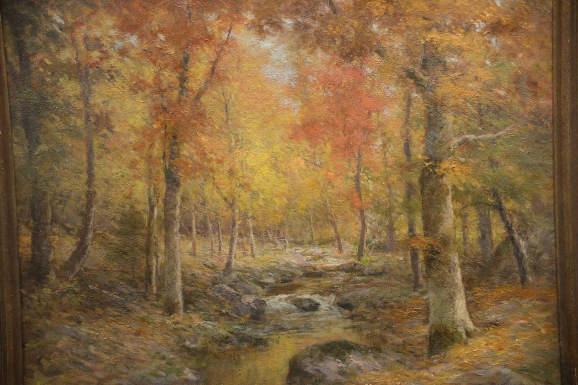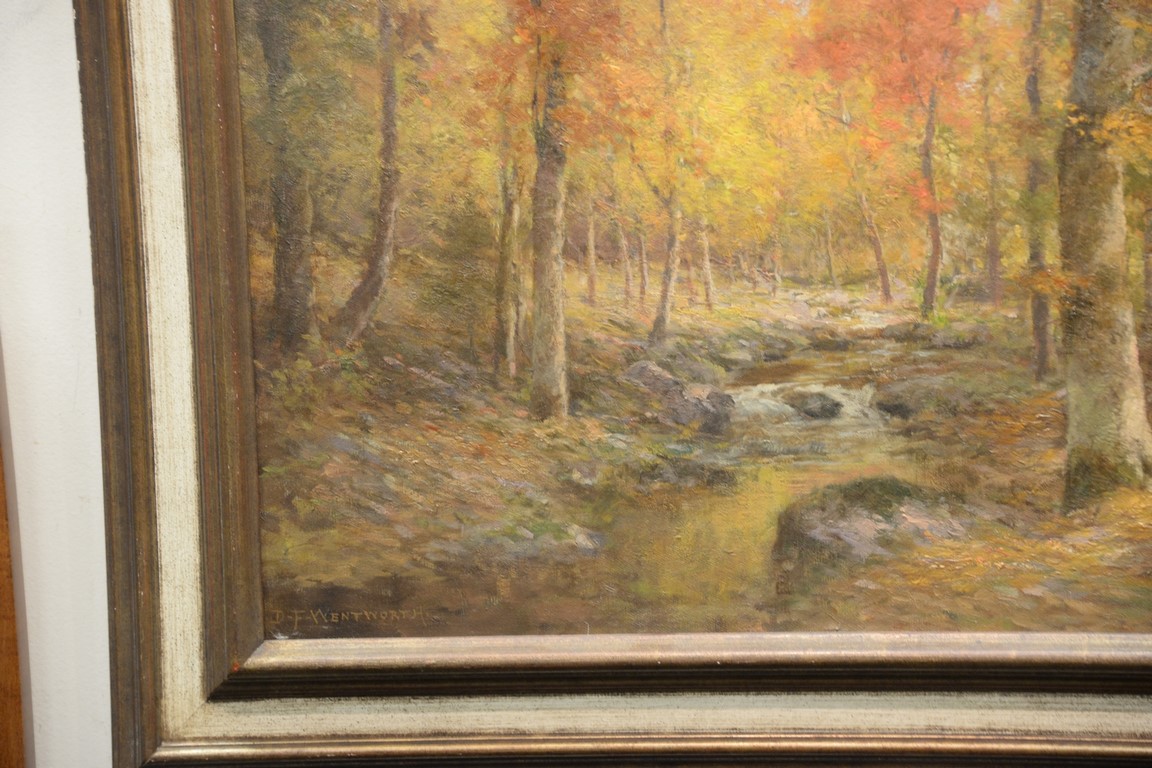 Lot 507: Daniel F. Wentworth 1850-1934, oil on canvas, Fall Wood Landscape with Stream, signed lower left: D.F. Wentworth, 20 x 24