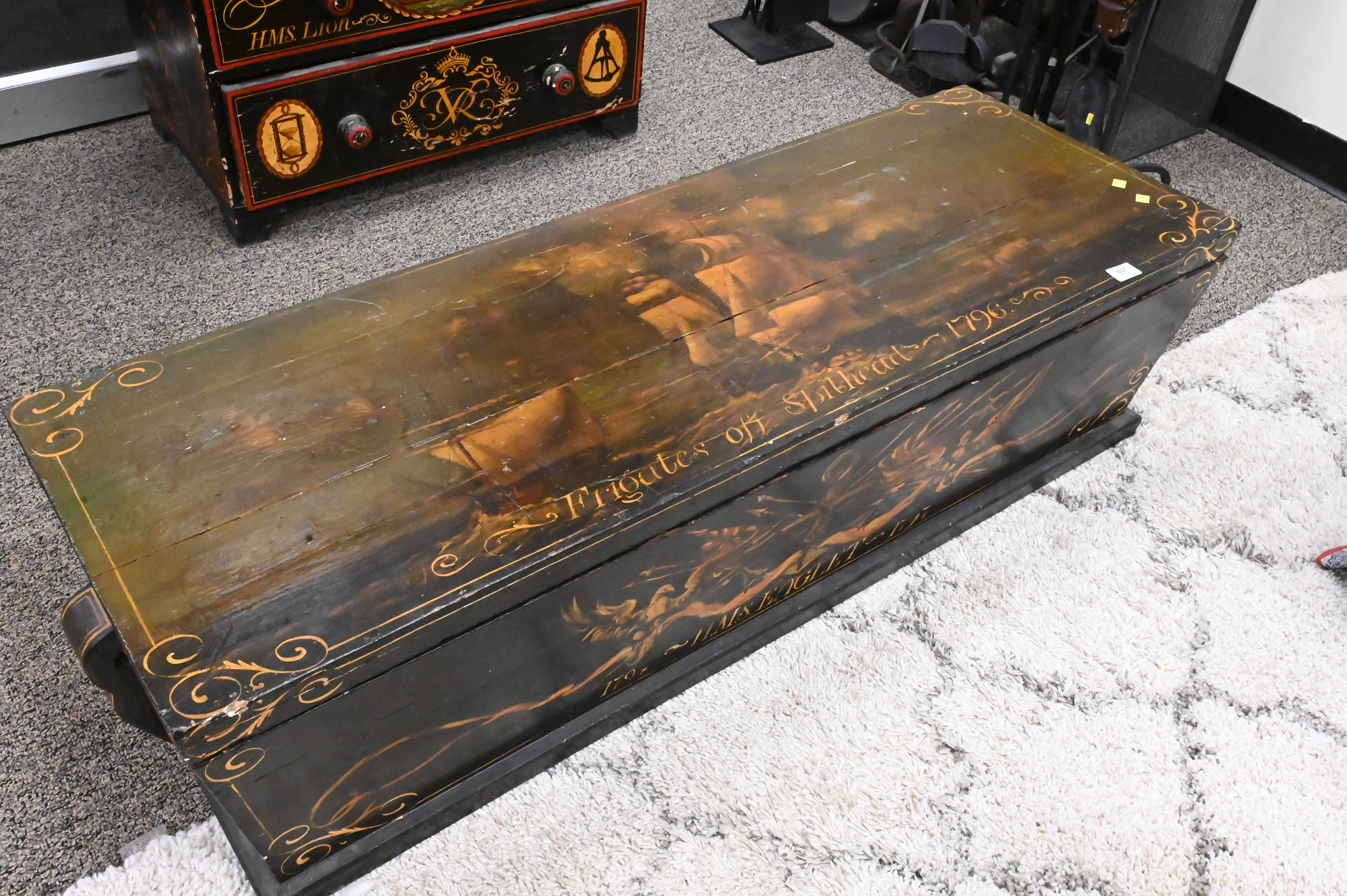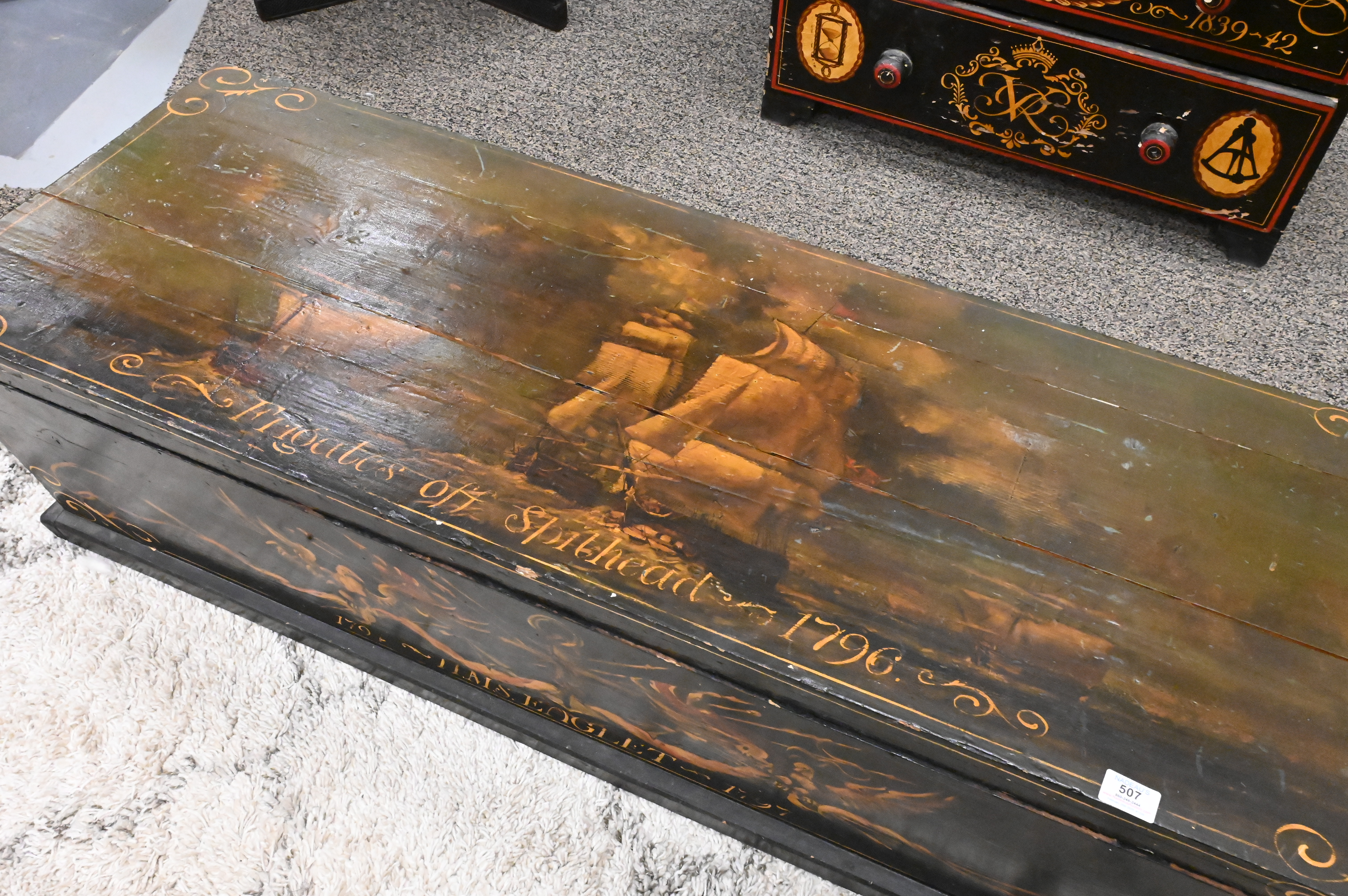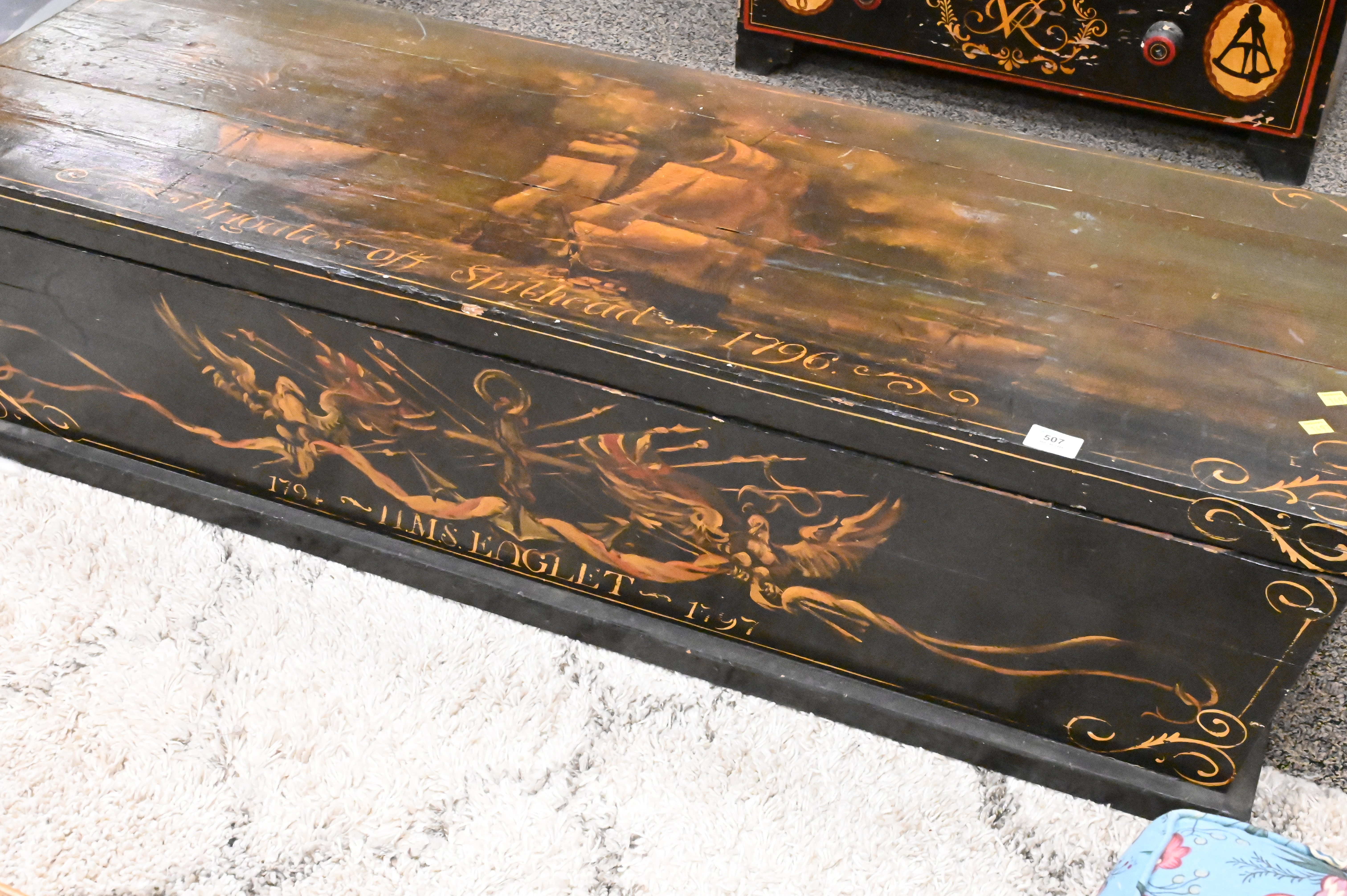 Nautical Paint Decorated Lift Top Chest, height 15 inches, top 19″ x 54″.