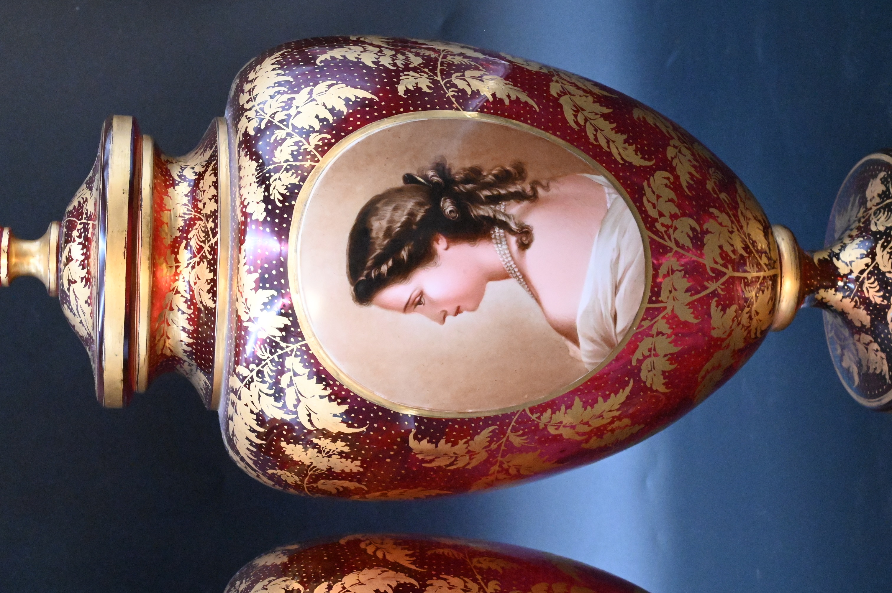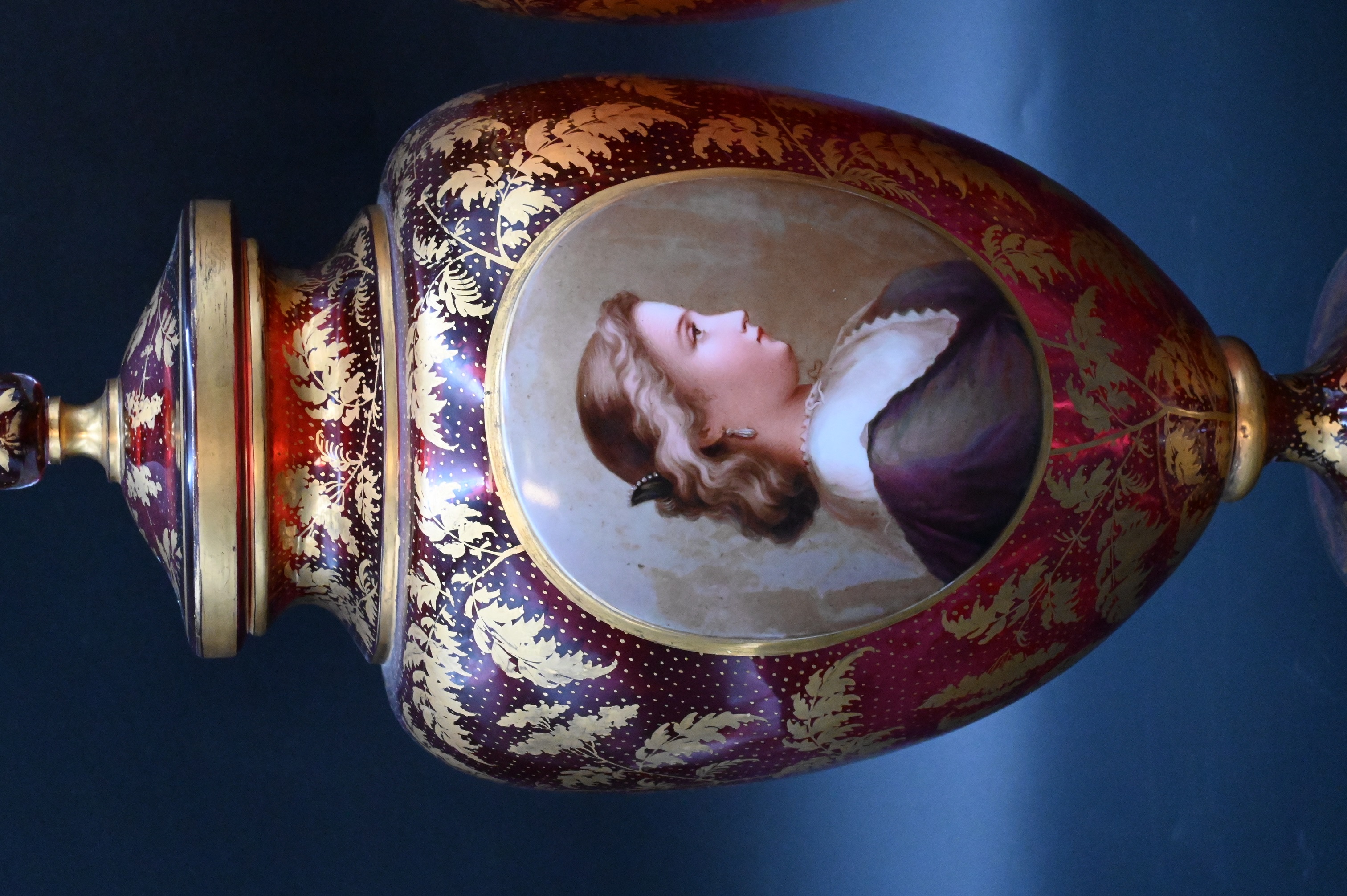 each having finial tops and gilt decorated bodies with oval porcelain female portrait panels, set on round footed base