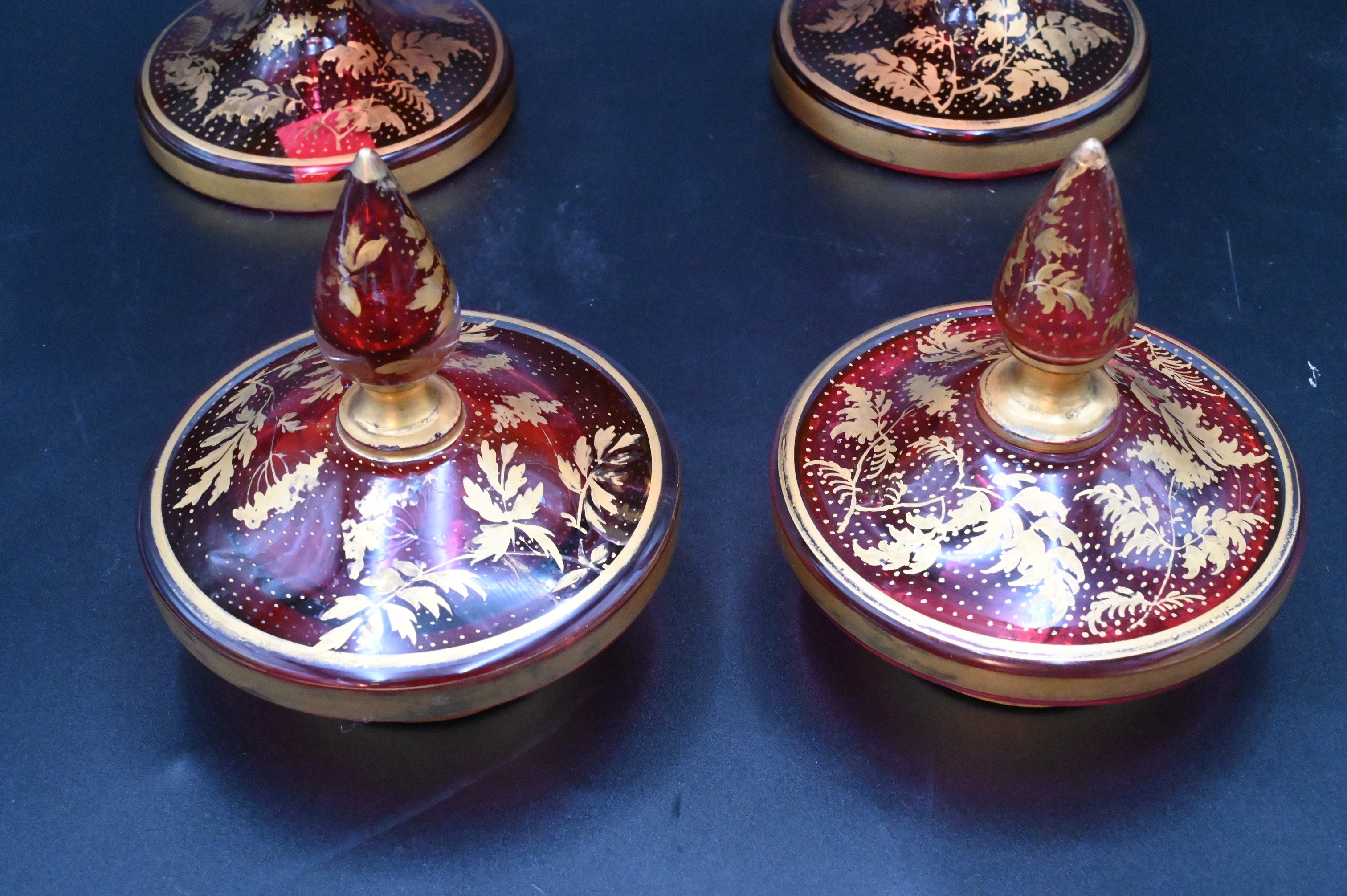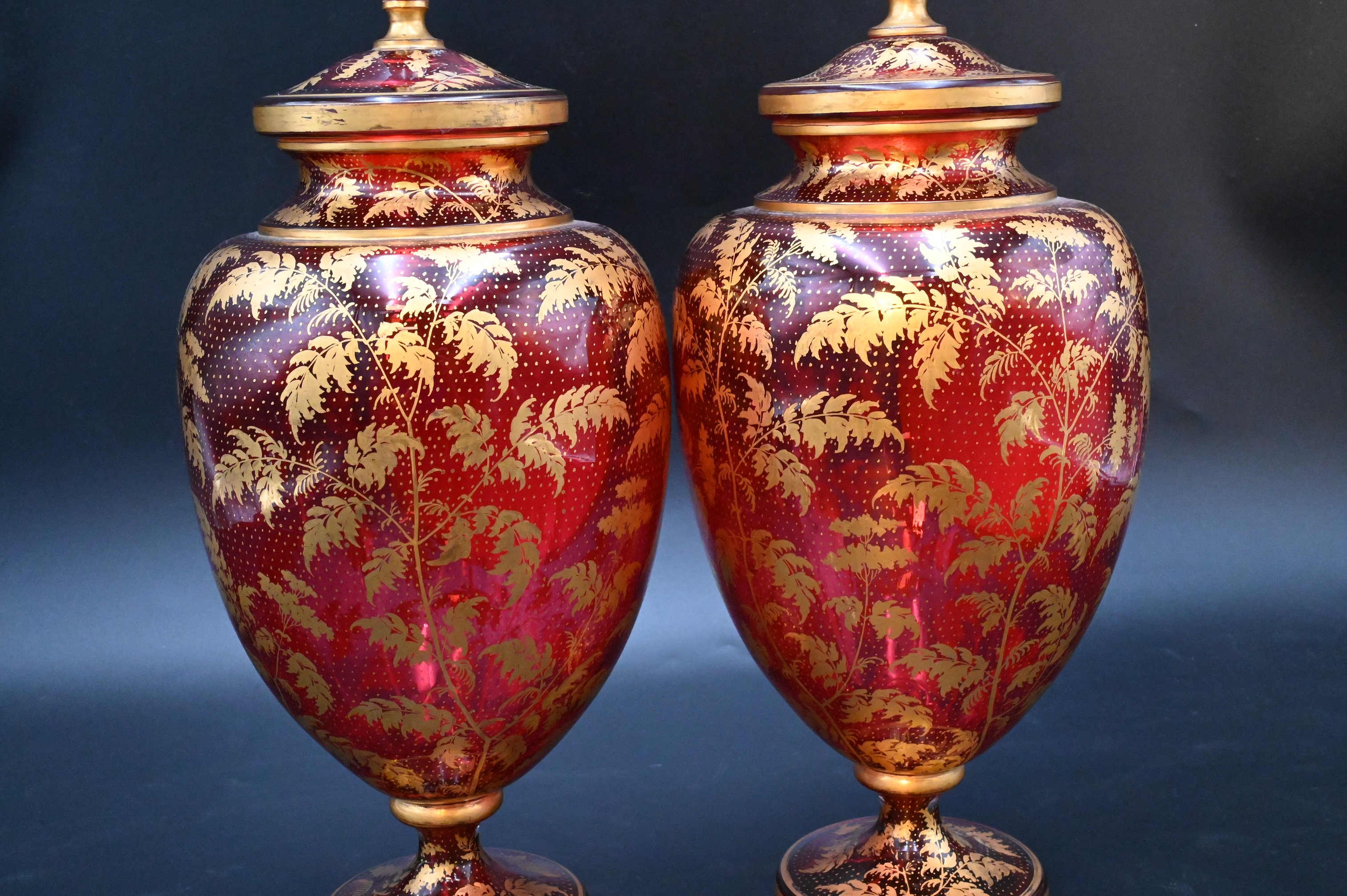 Pair of Cranberry Glass Covered Urns