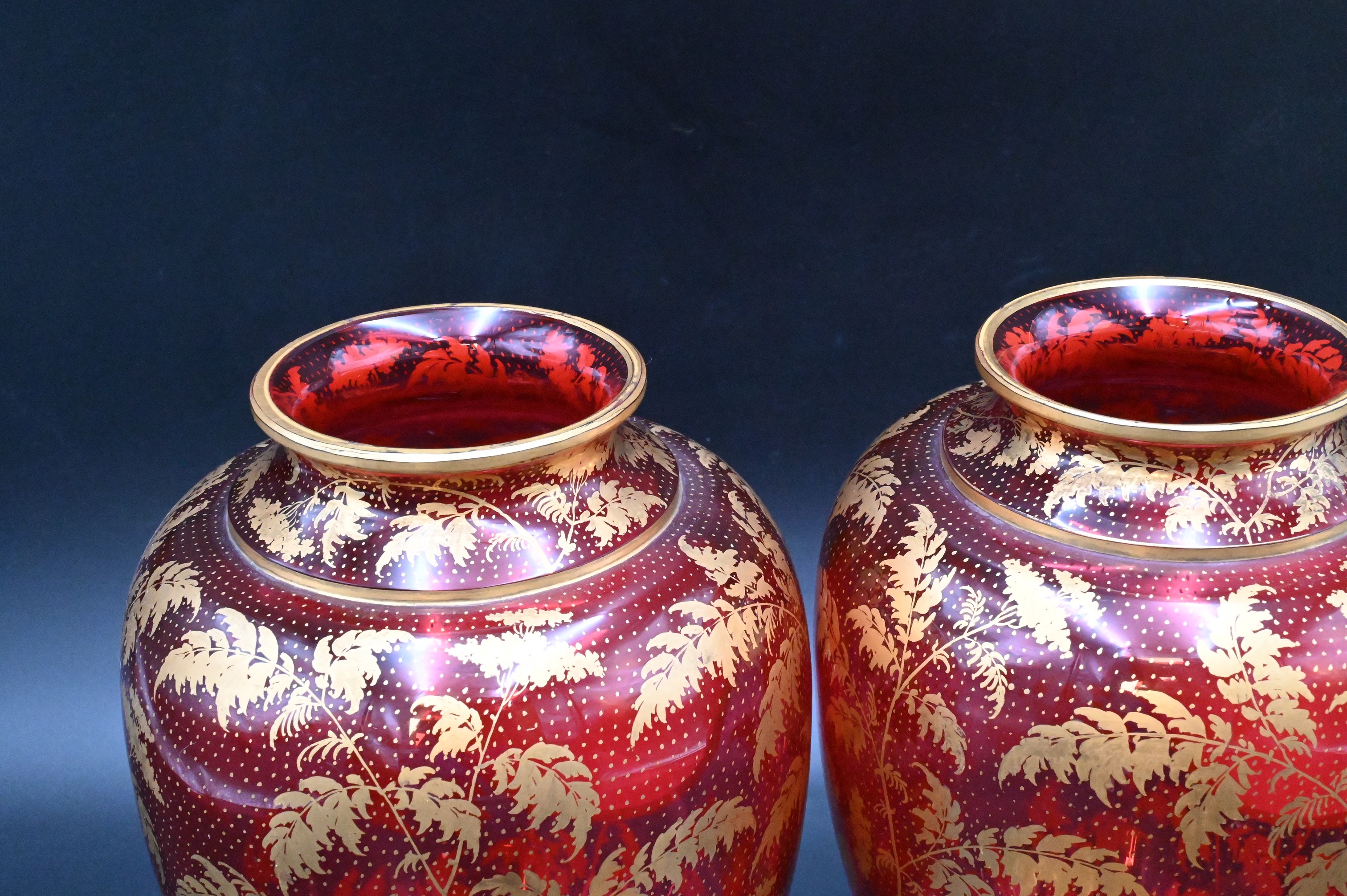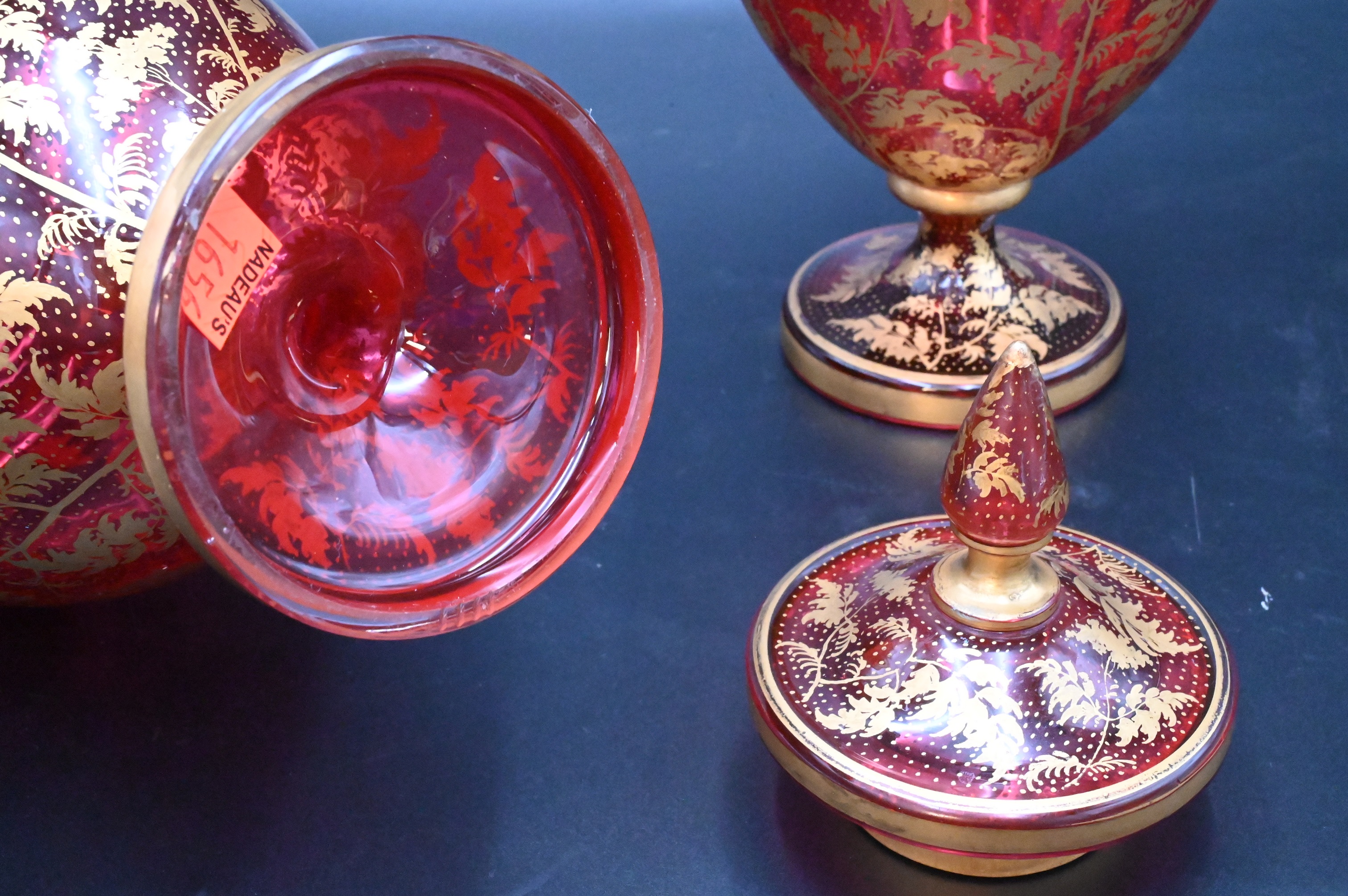 Lot 507: Pair of Cranberry Glass Covered Urns