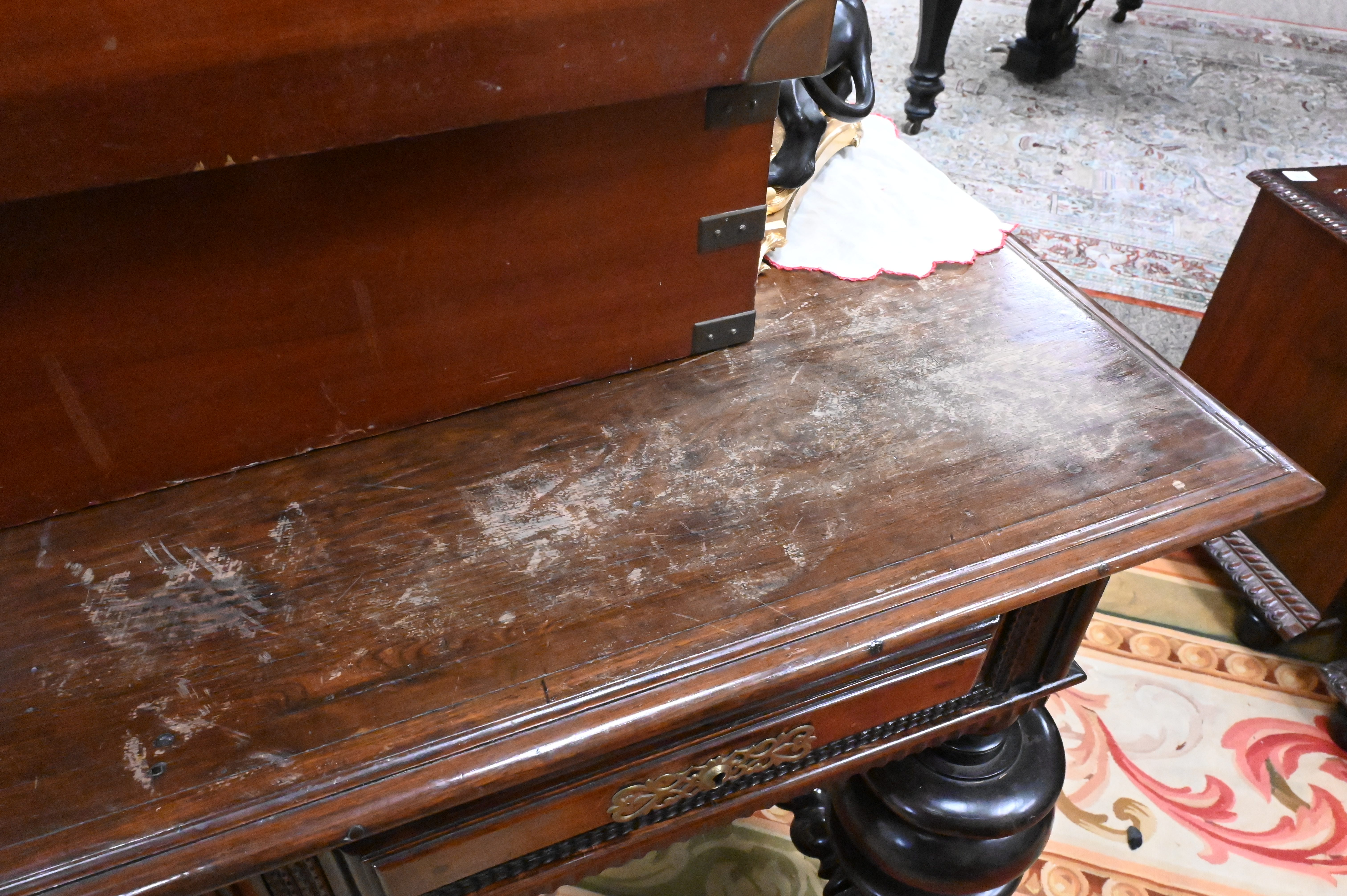 rectangular top having a molded edge over two frieze drawers carved with ripple panels, above a conforming apron and four large turned urn form legs joined by spirally-carved box stretcher, 18th century