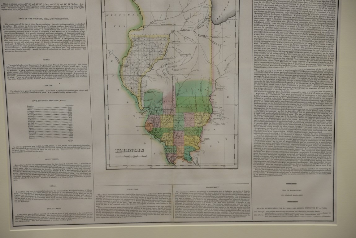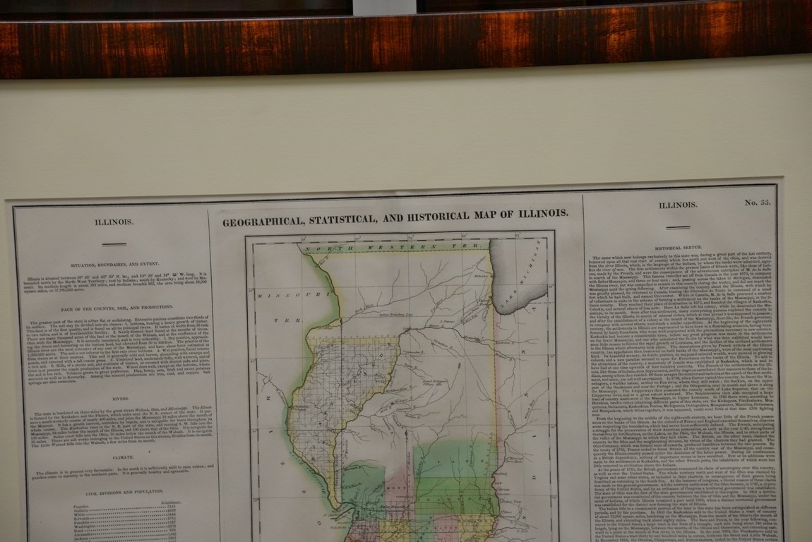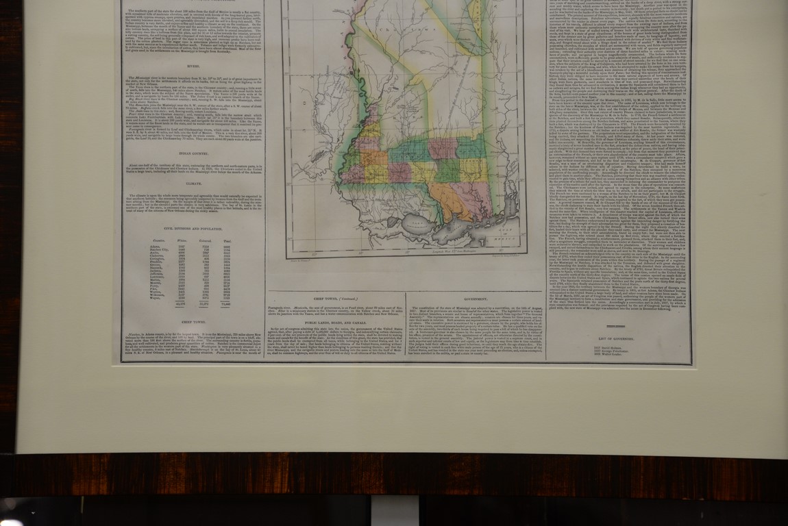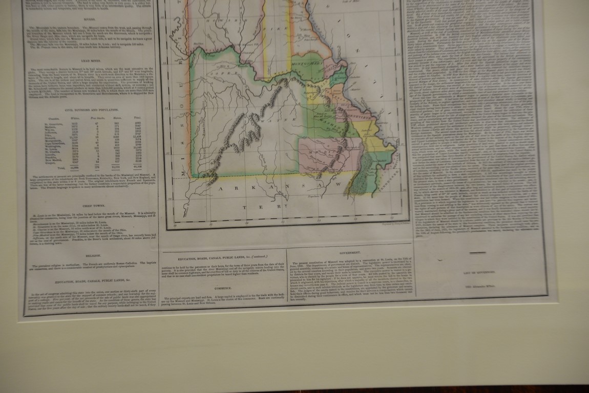 Set of three maps Geographical, Statistical, and Historical Maps of Missouri, Illinois, and Mississippi Plate #’s 34, 33, & 29 hand colored copper engravings having information text in borders engraved by James H. Young and George Delleker framed by W. Graham Arader III sight size: 17 x 21 1/4 Provenance: Property from Credit Suisse’s Americana Collection