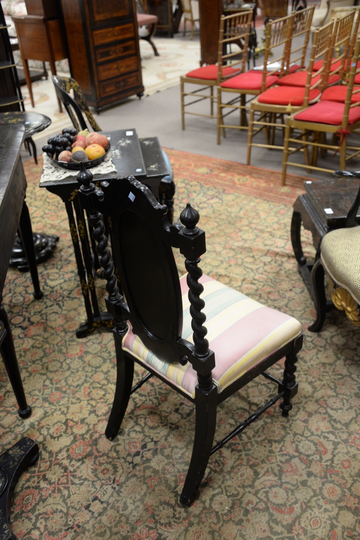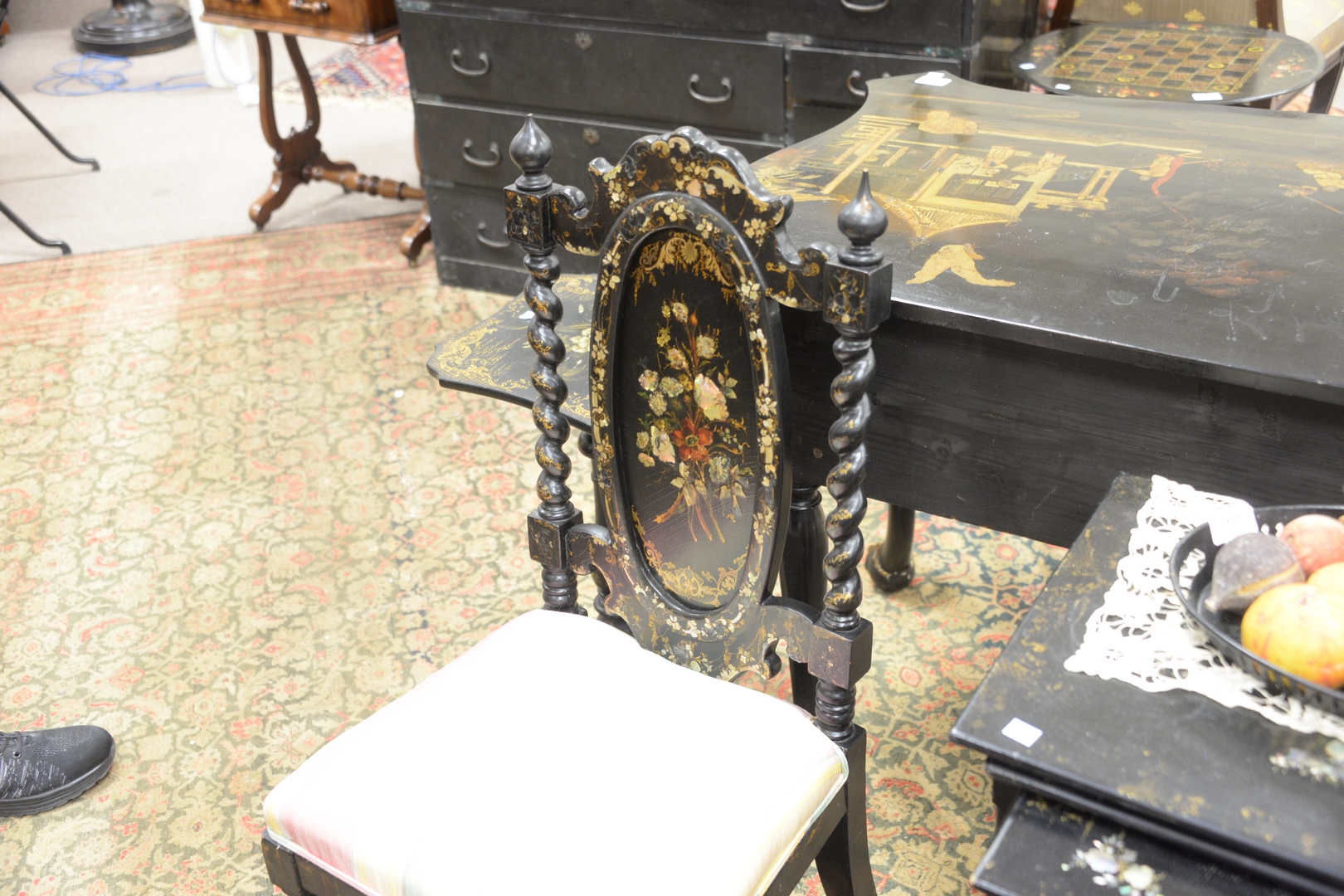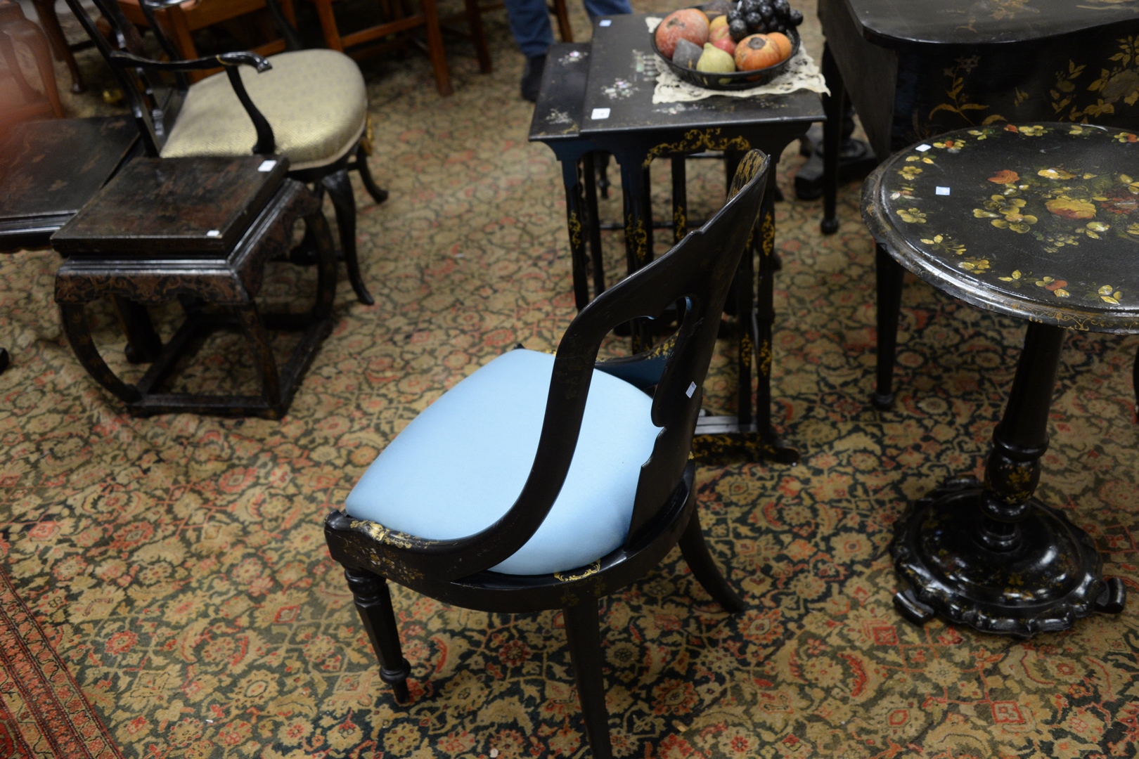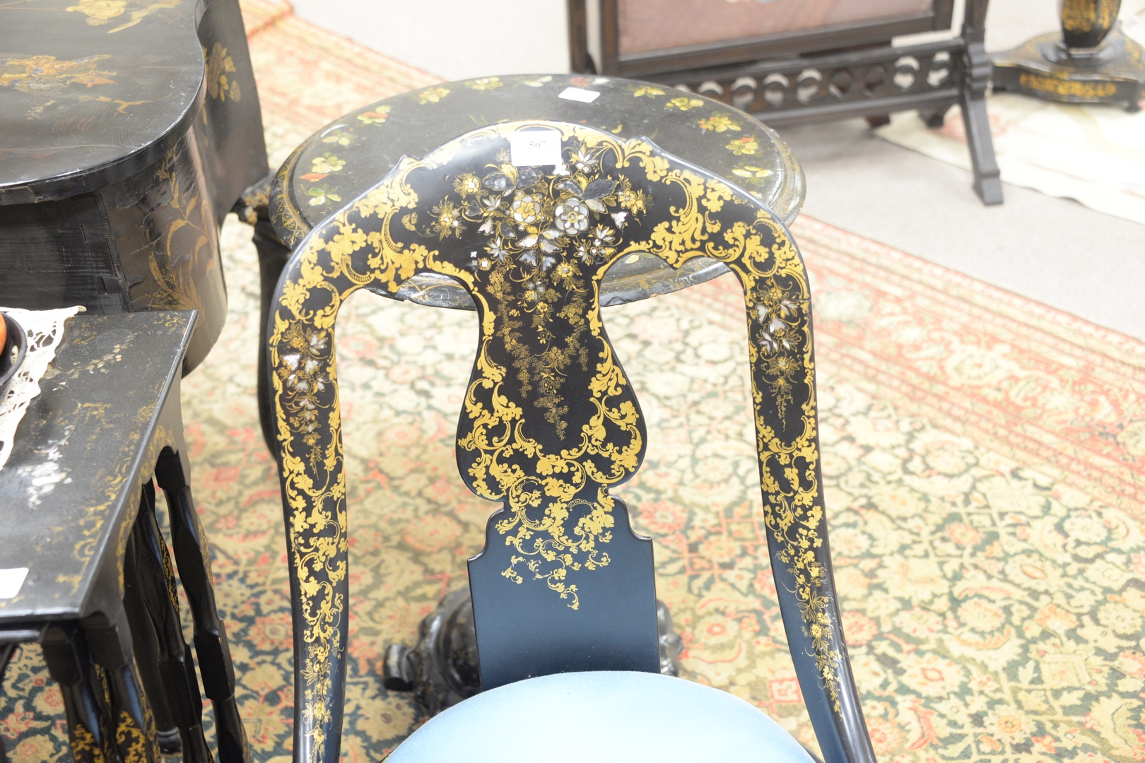 Lot 507: Two Victorian Black Lacquered Ladies Chairs, having mother of pearl inlay, and gilt decoration, upholstered seat cushion, seat heigh…