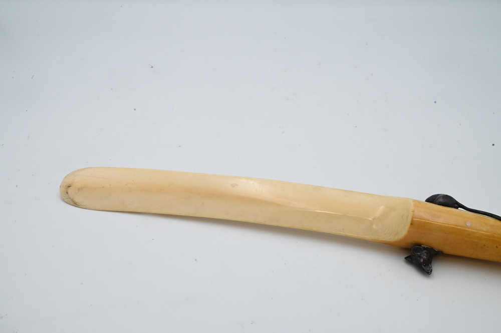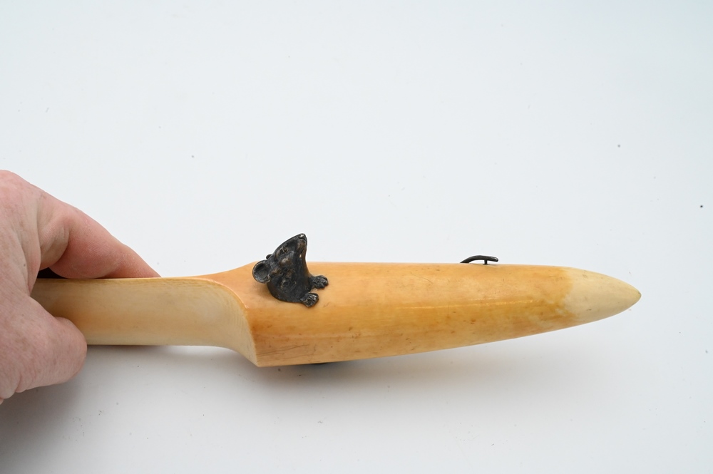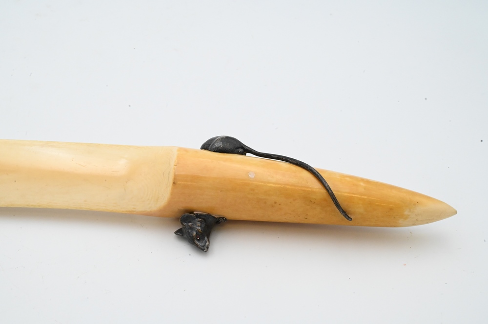 Lot 508: Carved Ivory Page Turner, having silver mouse burrowed through on handle, length 18 inches. Please note: Items containing ivory cannot be purchased or shipped by bidders residing outside of the United States or California, Hawaii, Nevada, New Jersey, New York, Washington, Oregon, or District of Columbia. If an ivory item is purchased by a bidder in one of the above mentioned locations or attempts to ship ivory to one of the above mentioned locations, bidder will forfeit the item and be responsible for any incurred fees such as a restocking fee.