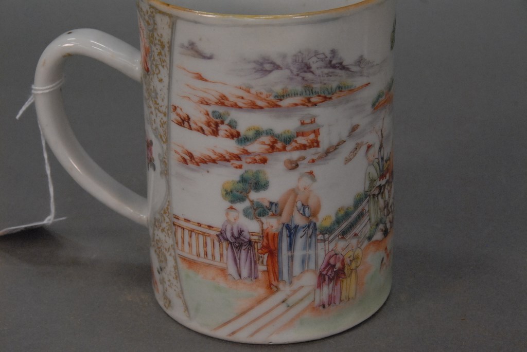 Chinese strap handle mug with intricately painted exterior view with twelve figures in lush landscape surroundings, mug having polychrome trim, late 18th century. ht. 5 3/8in. dia. 3 7/8in.