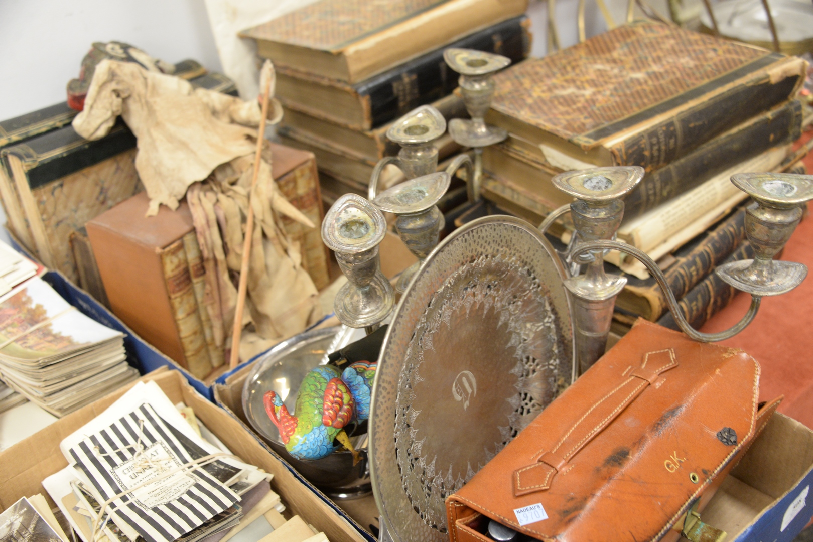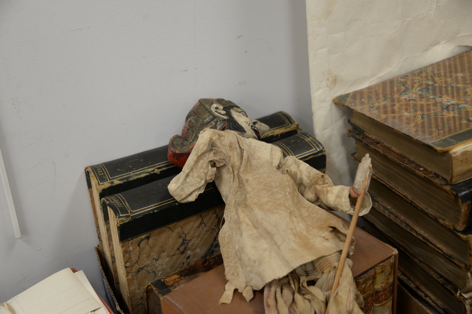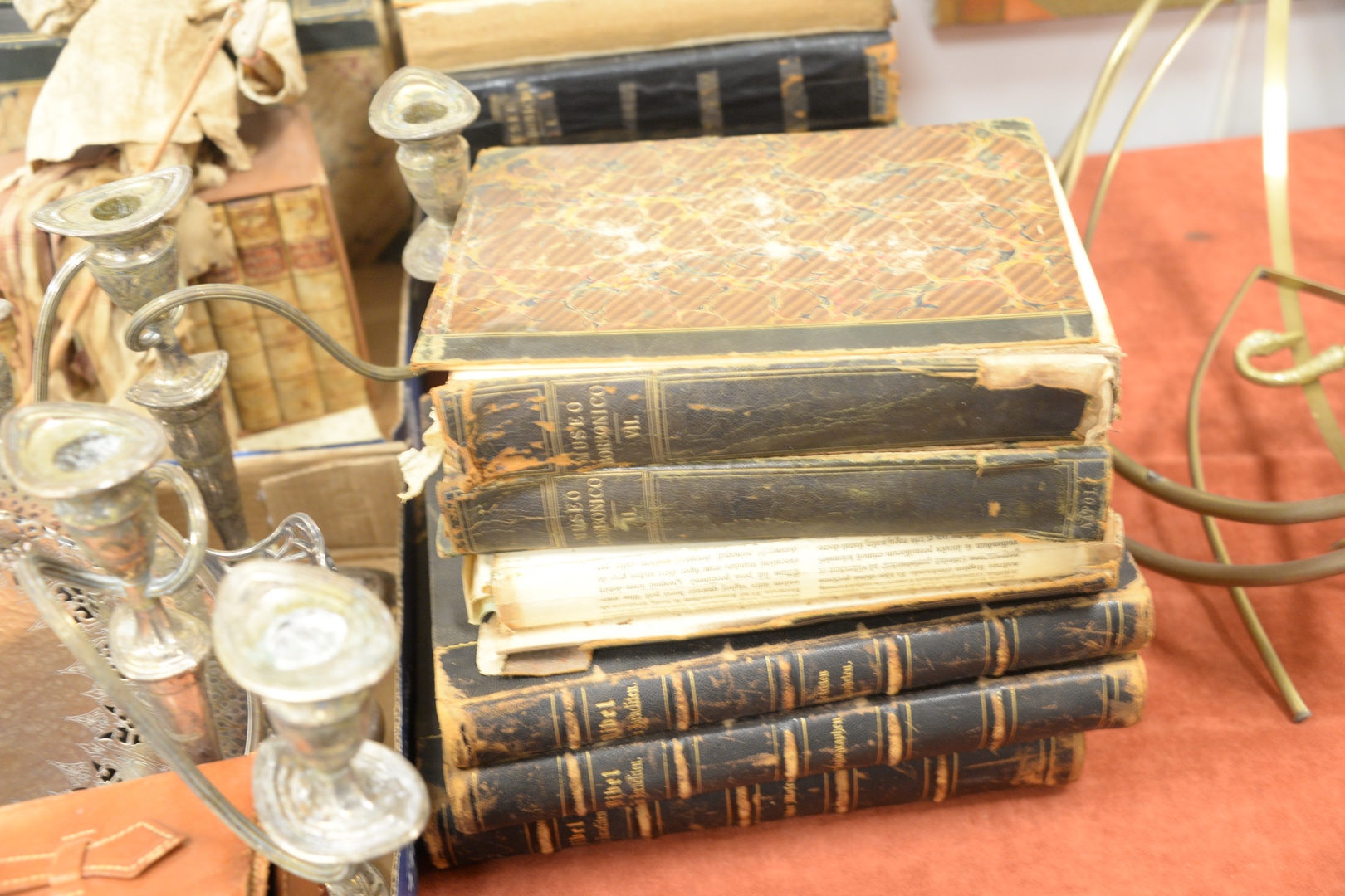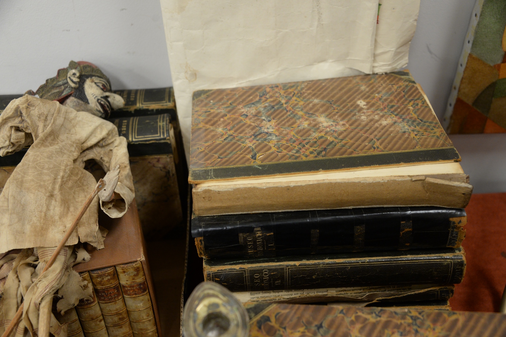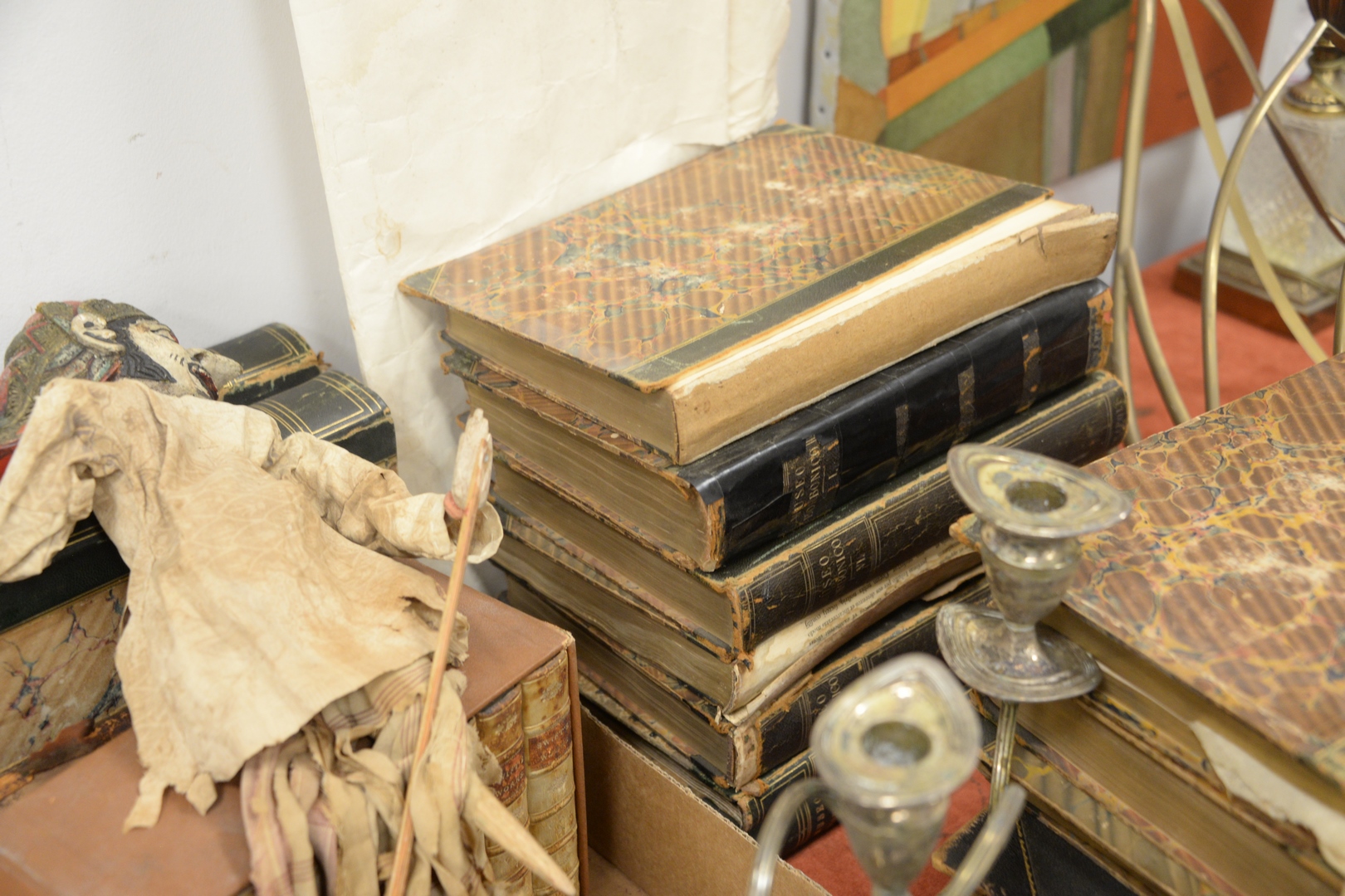 Lot 508: Grouping to Include Russian Poster, (1870 – 1970), (as is), carved hand muppet figure, silverplate; along with two Museo Borbonico Napoli Books, set of Swift’s Works Books, 1756. Provenance: The Estate of Alan Gans, Mulberry Point, Guilford.