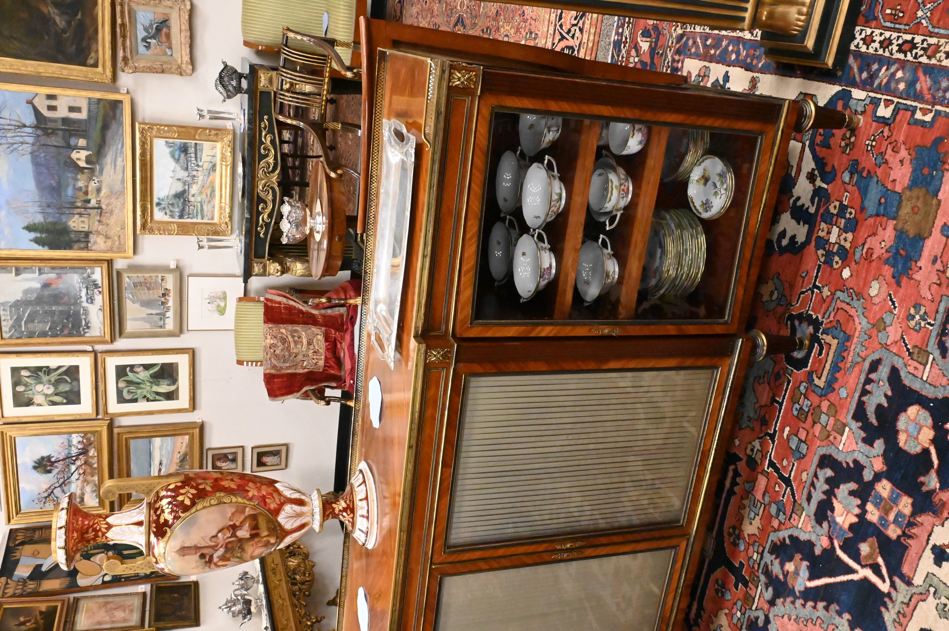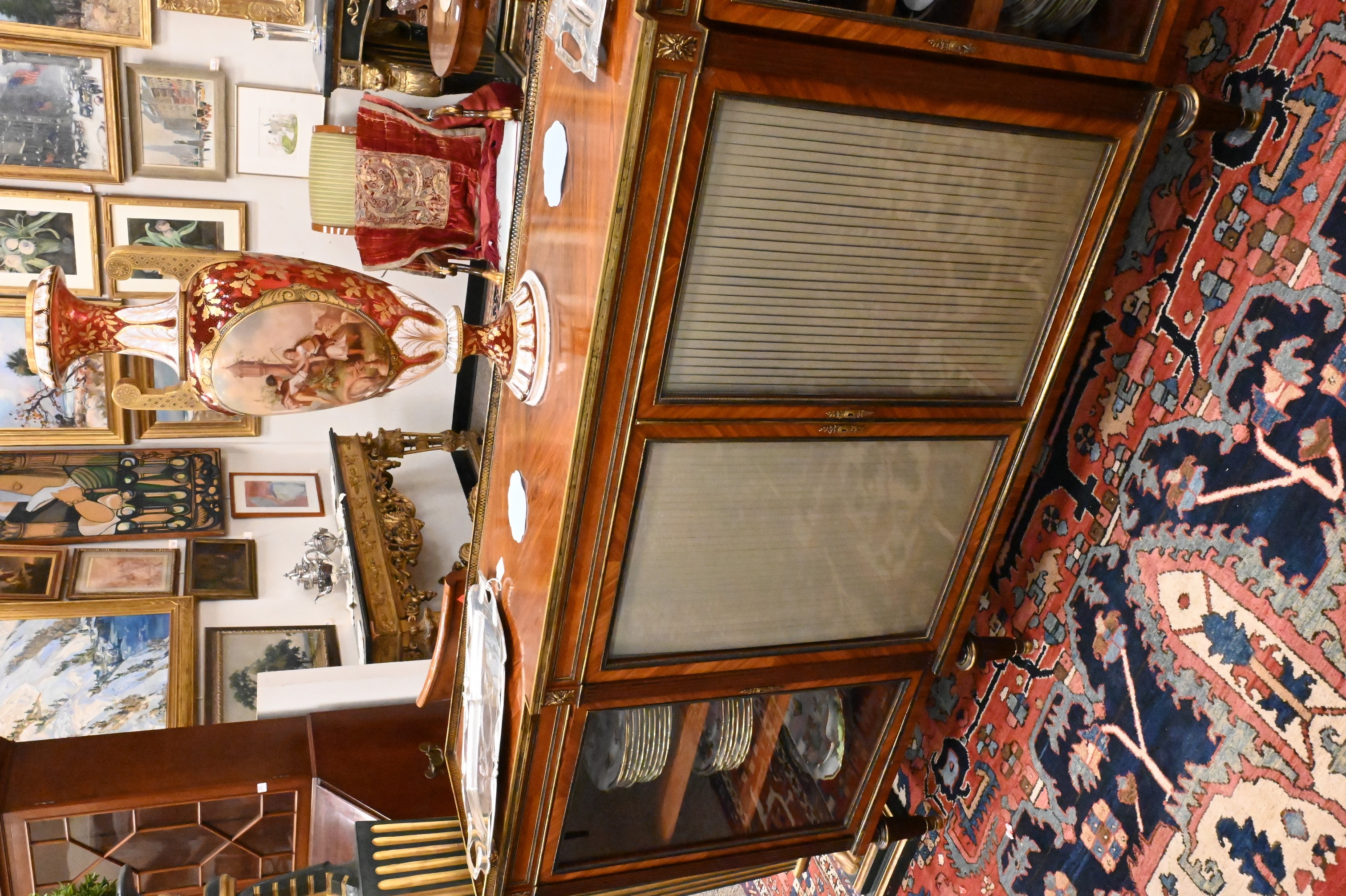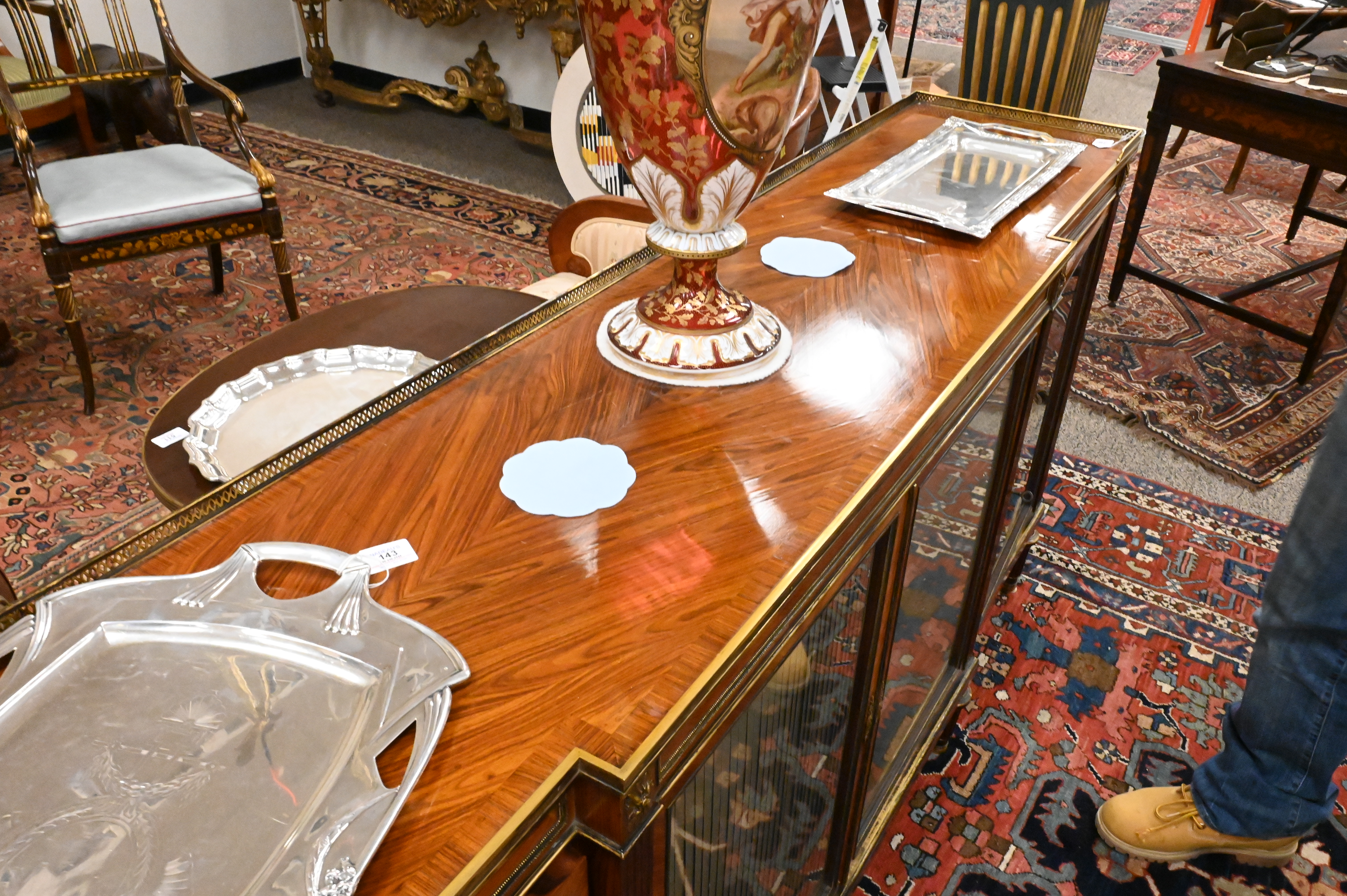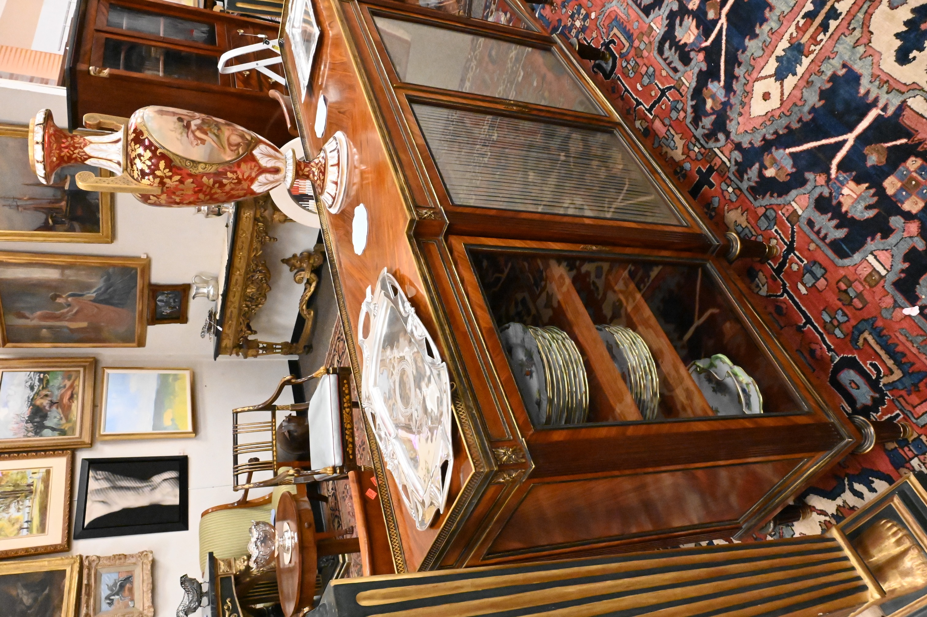 having pierced metal gallery top, four glass paneled doors flanked by fluted pilasters bronze mounts, 19th century