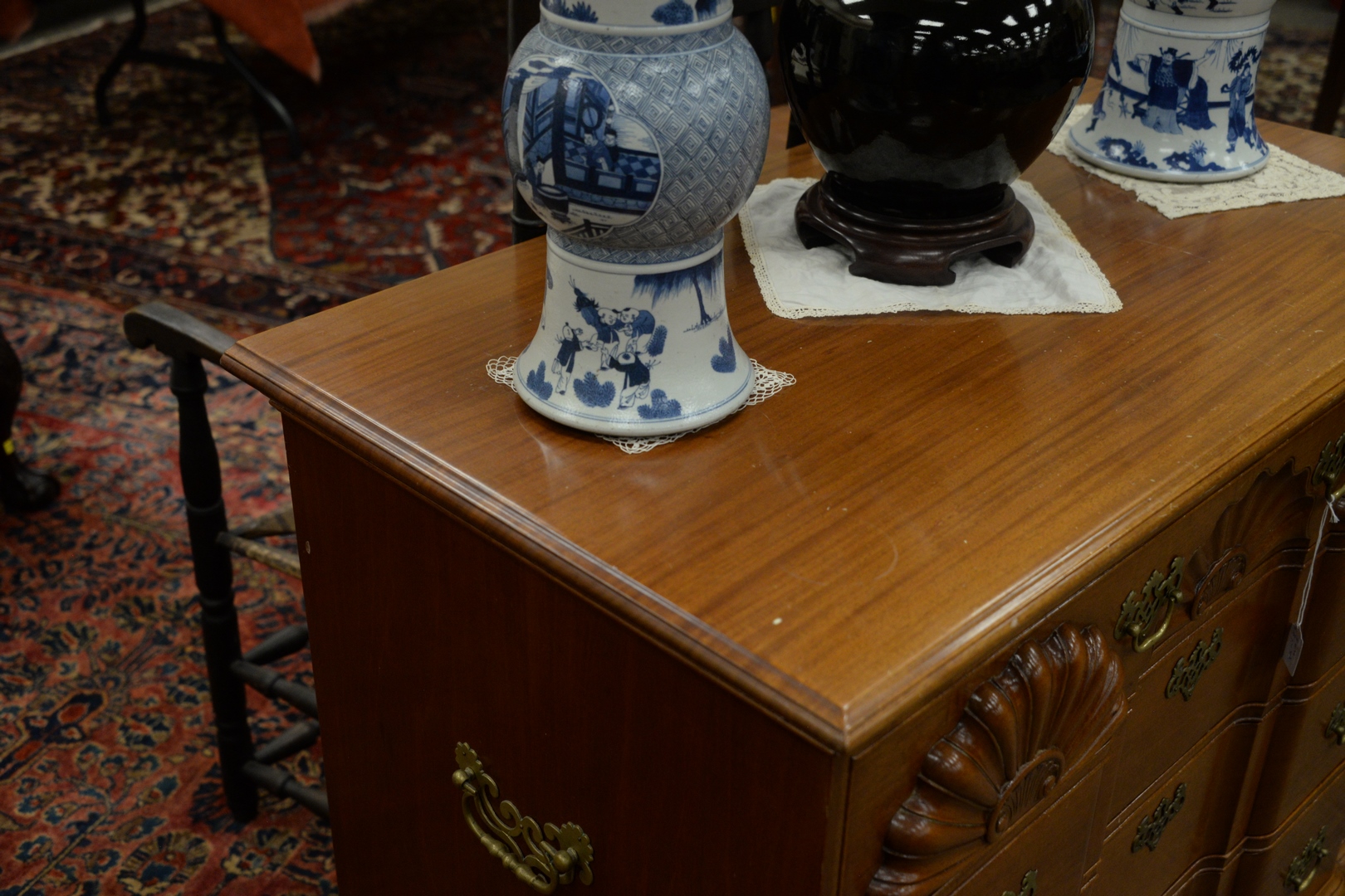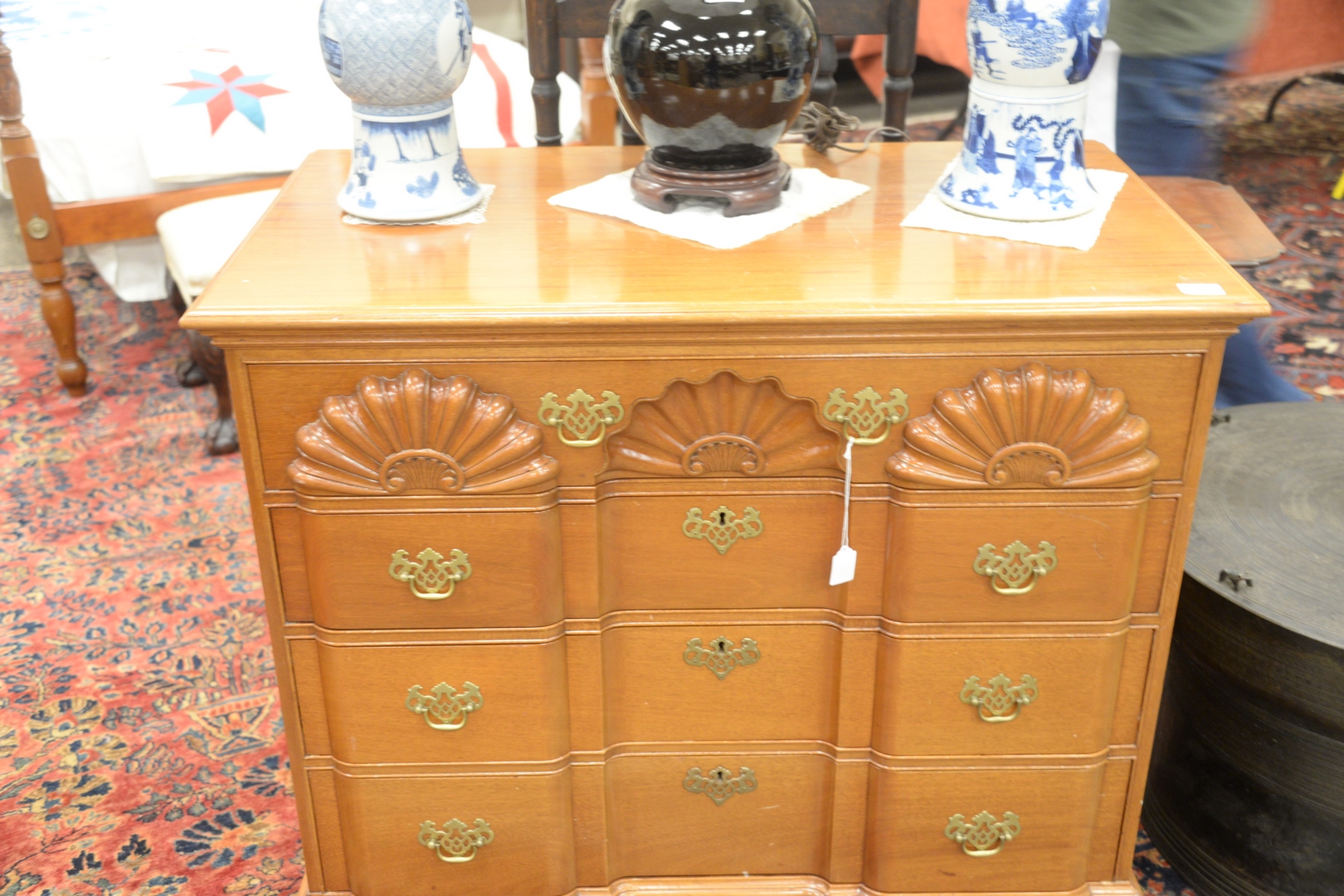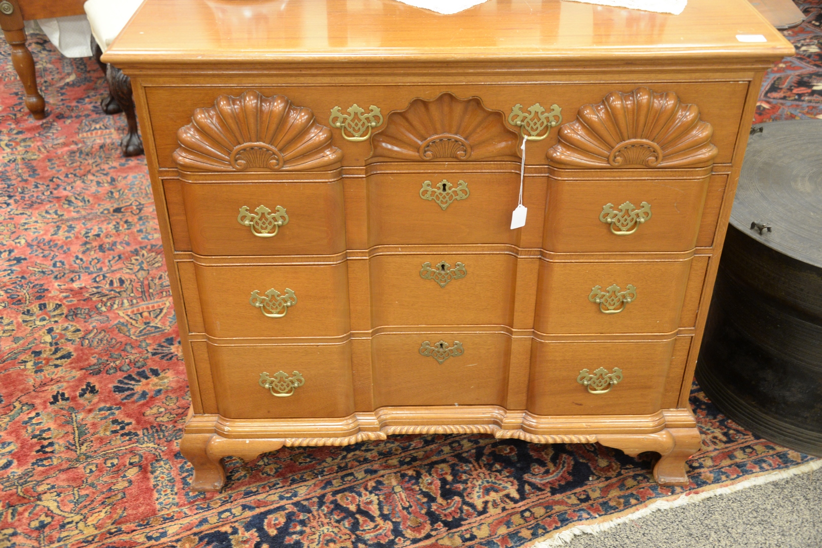 Lot 508: Margolis Mahogany Block Front Chest, with triple shell carved top drawer set on ogee feet, sides having brass handles, signed with brand mark, sun faded, height 36 1/2 inches, width 37 3/4 inches, top 22 x 40.