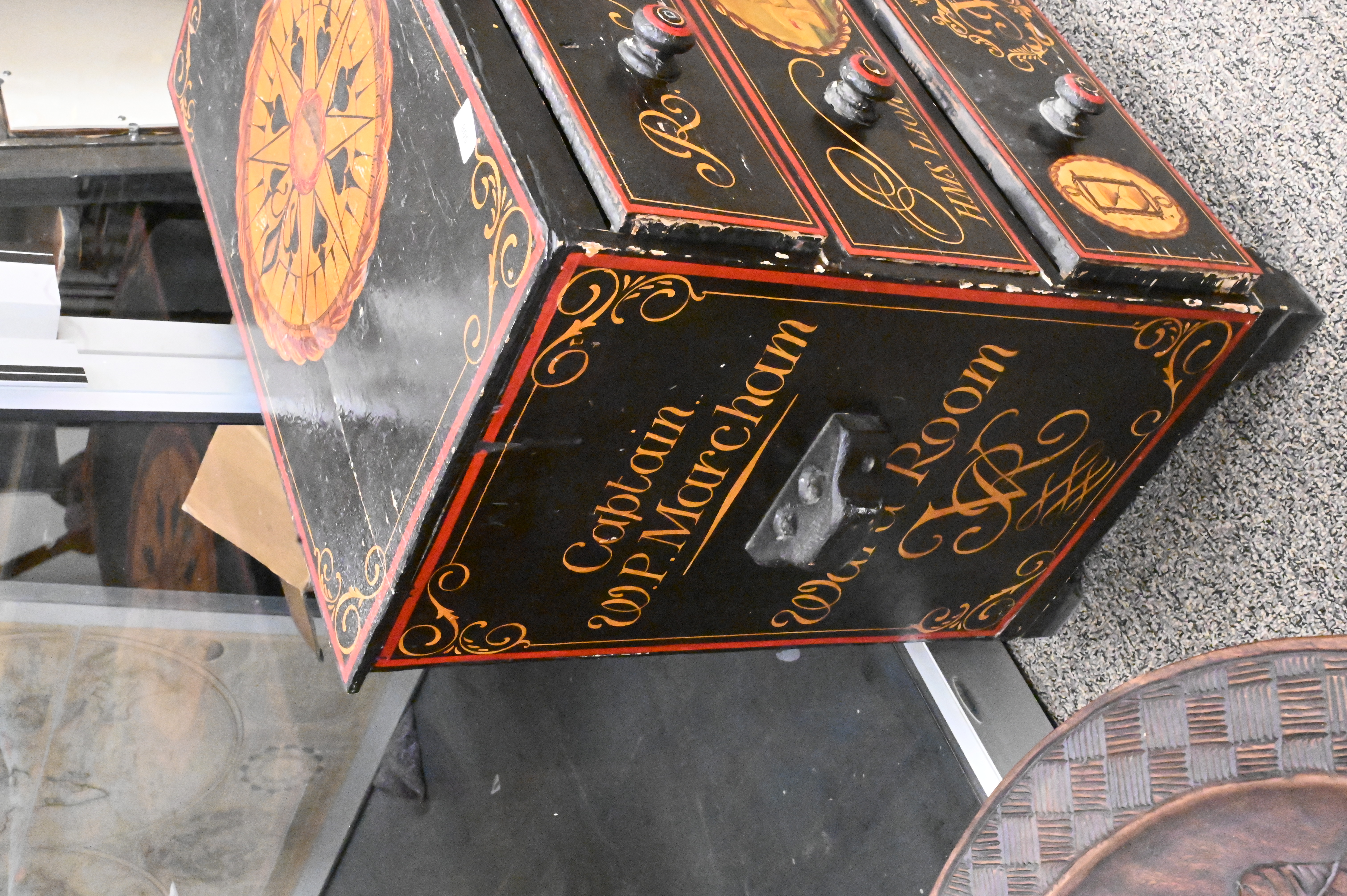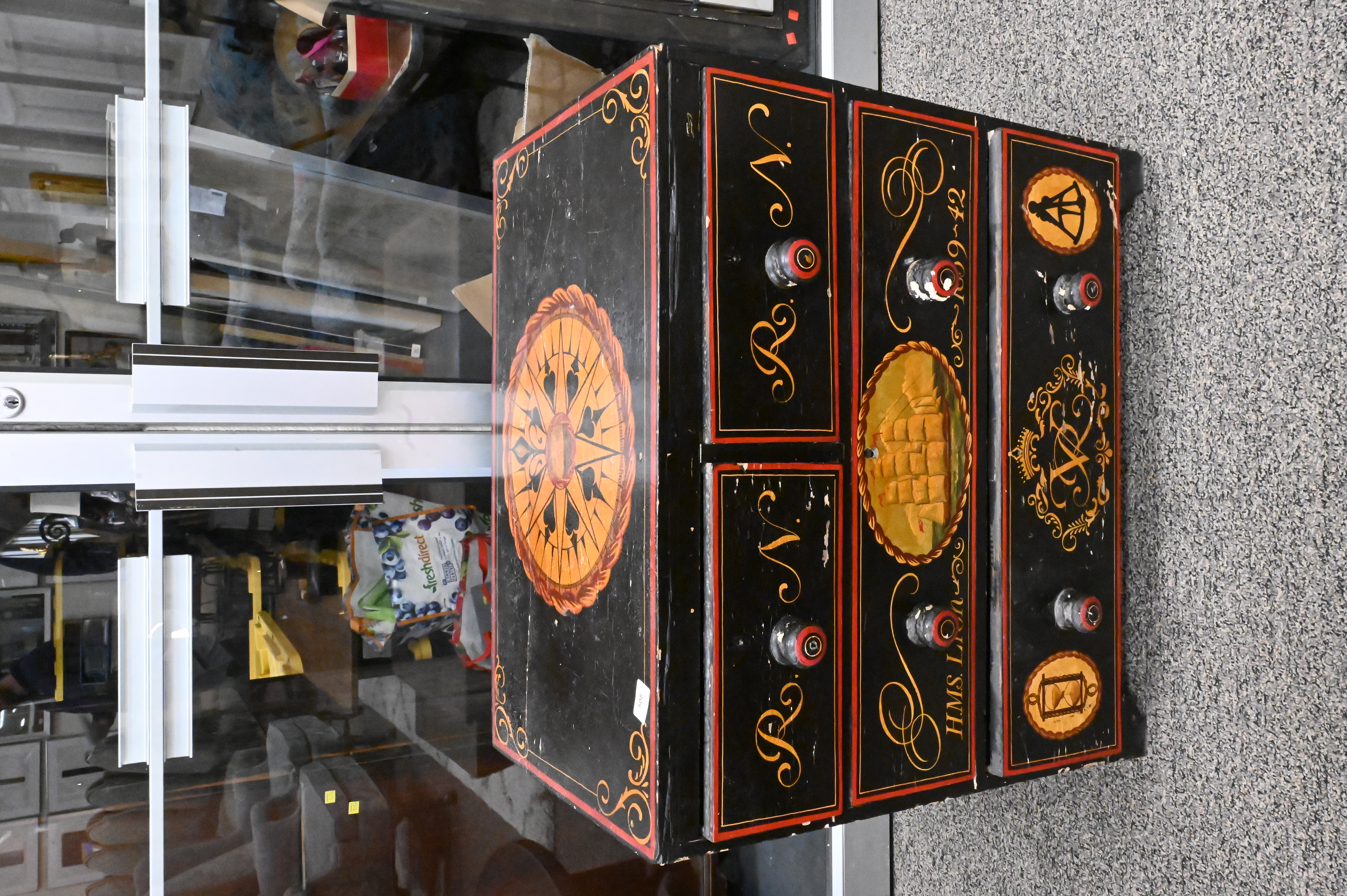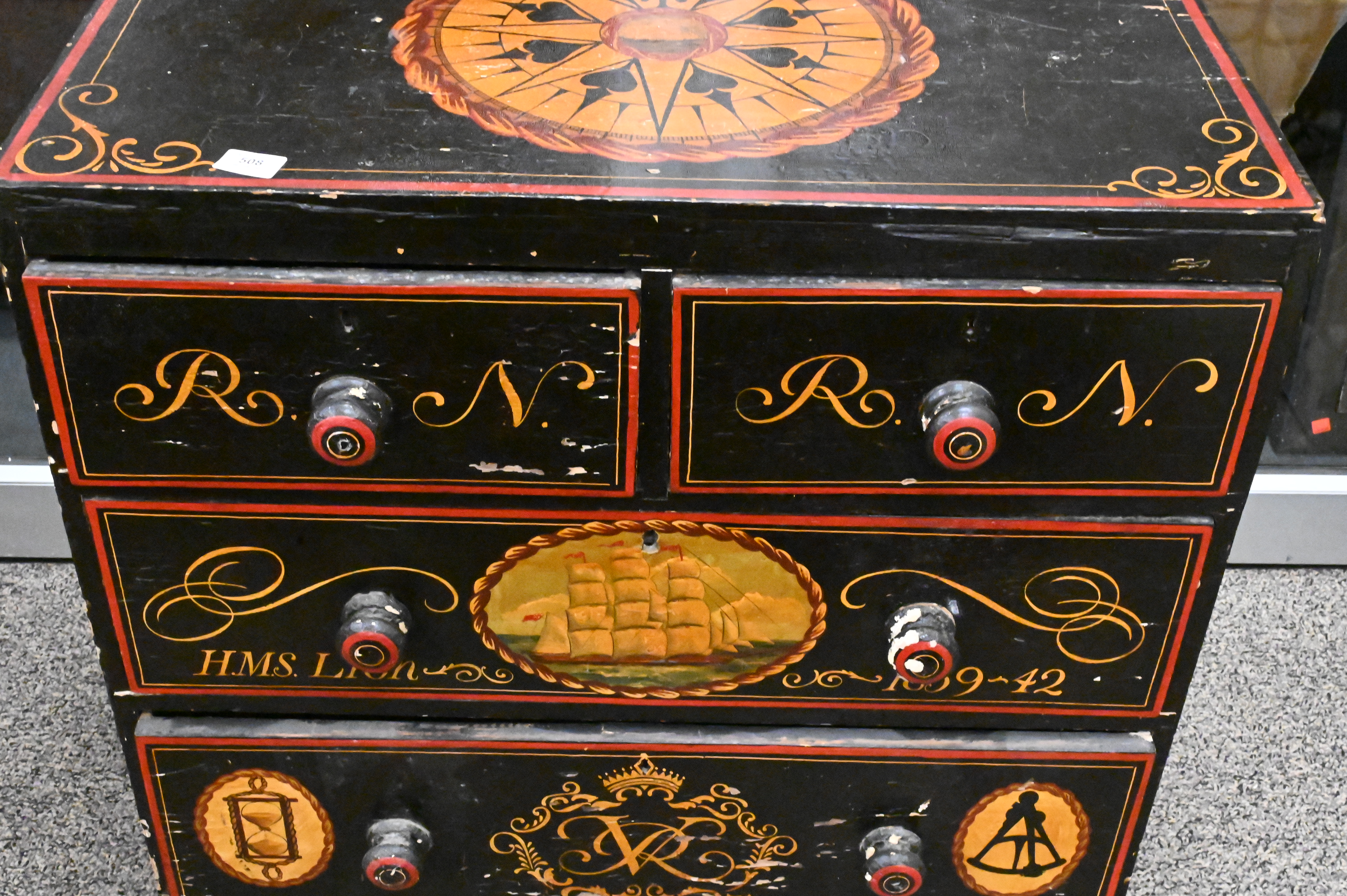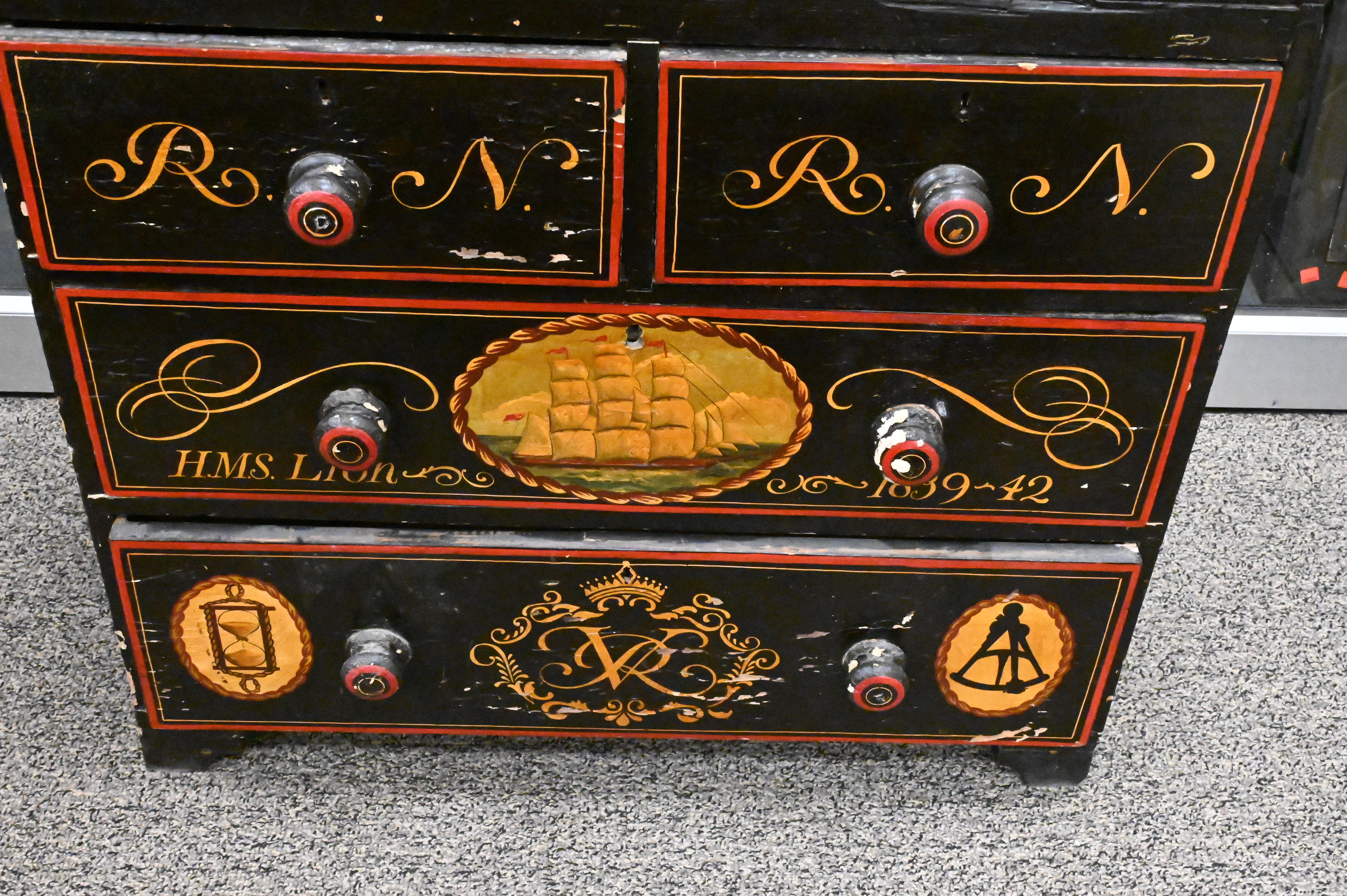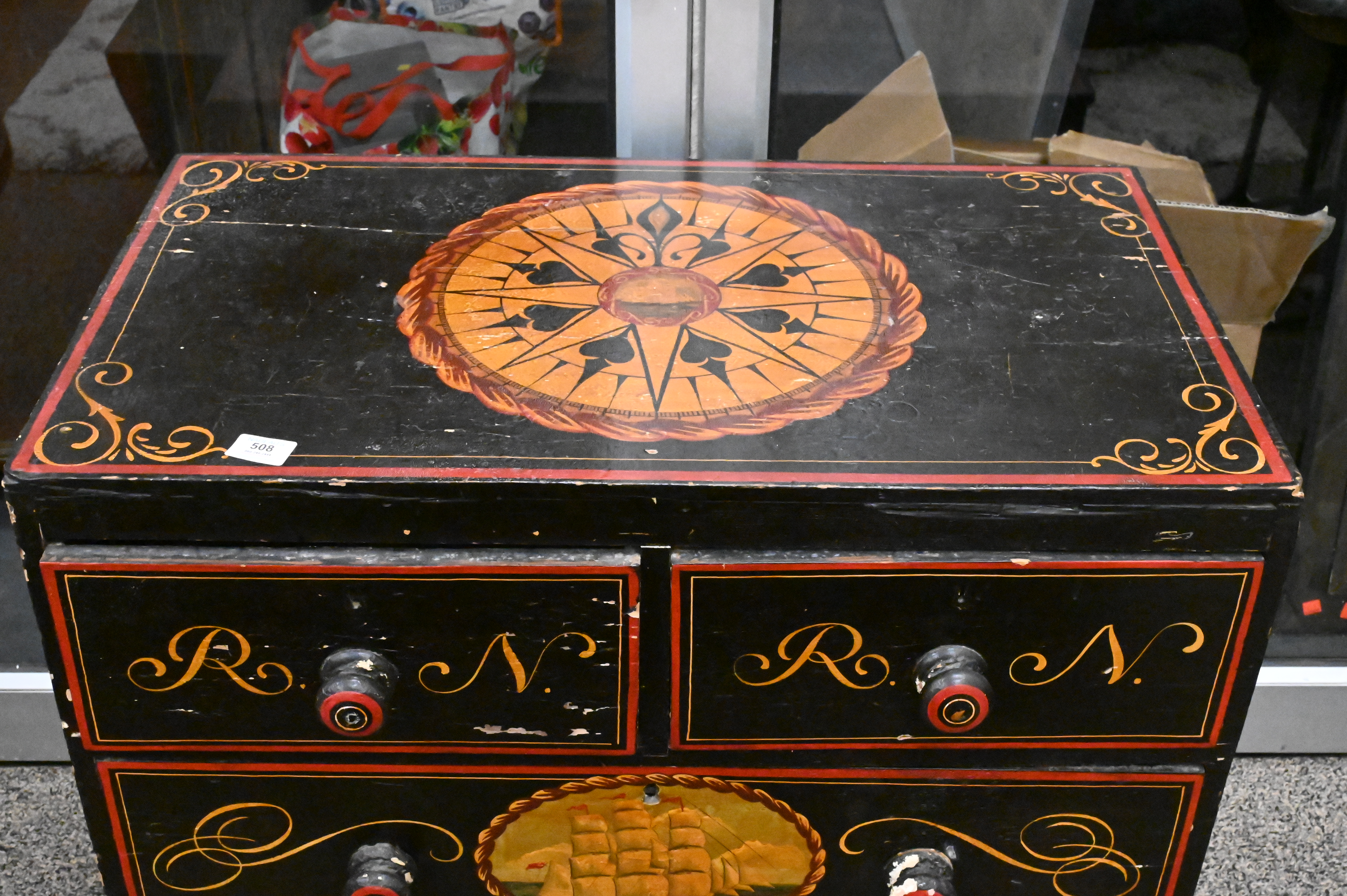 Nautical Paint Decorated Chest, two over two drawers, height 29 inches, top 18″ x 31 1/2″.