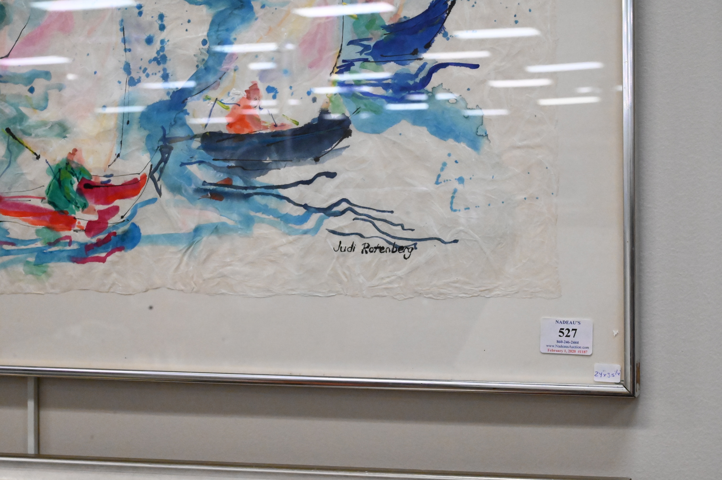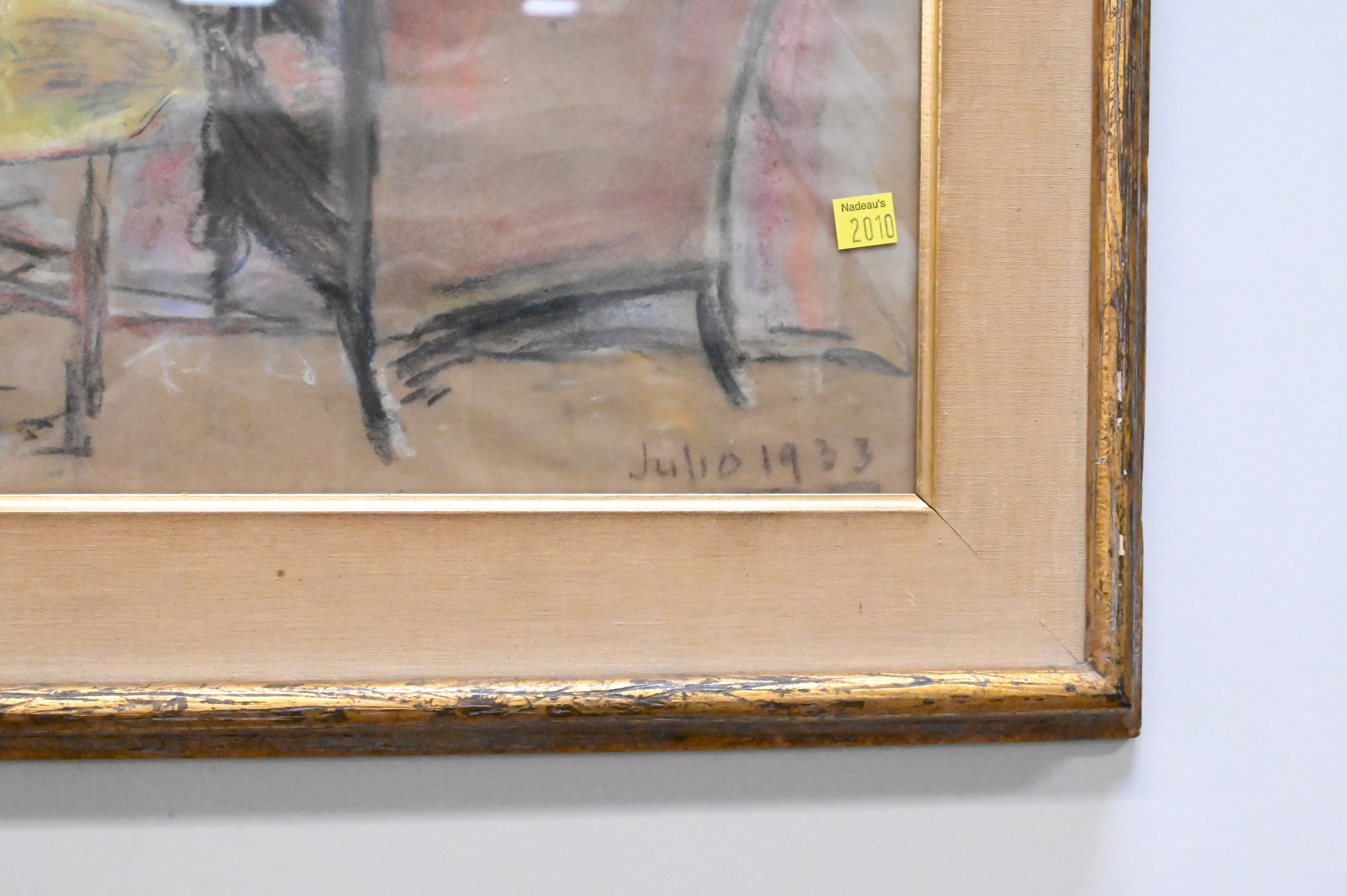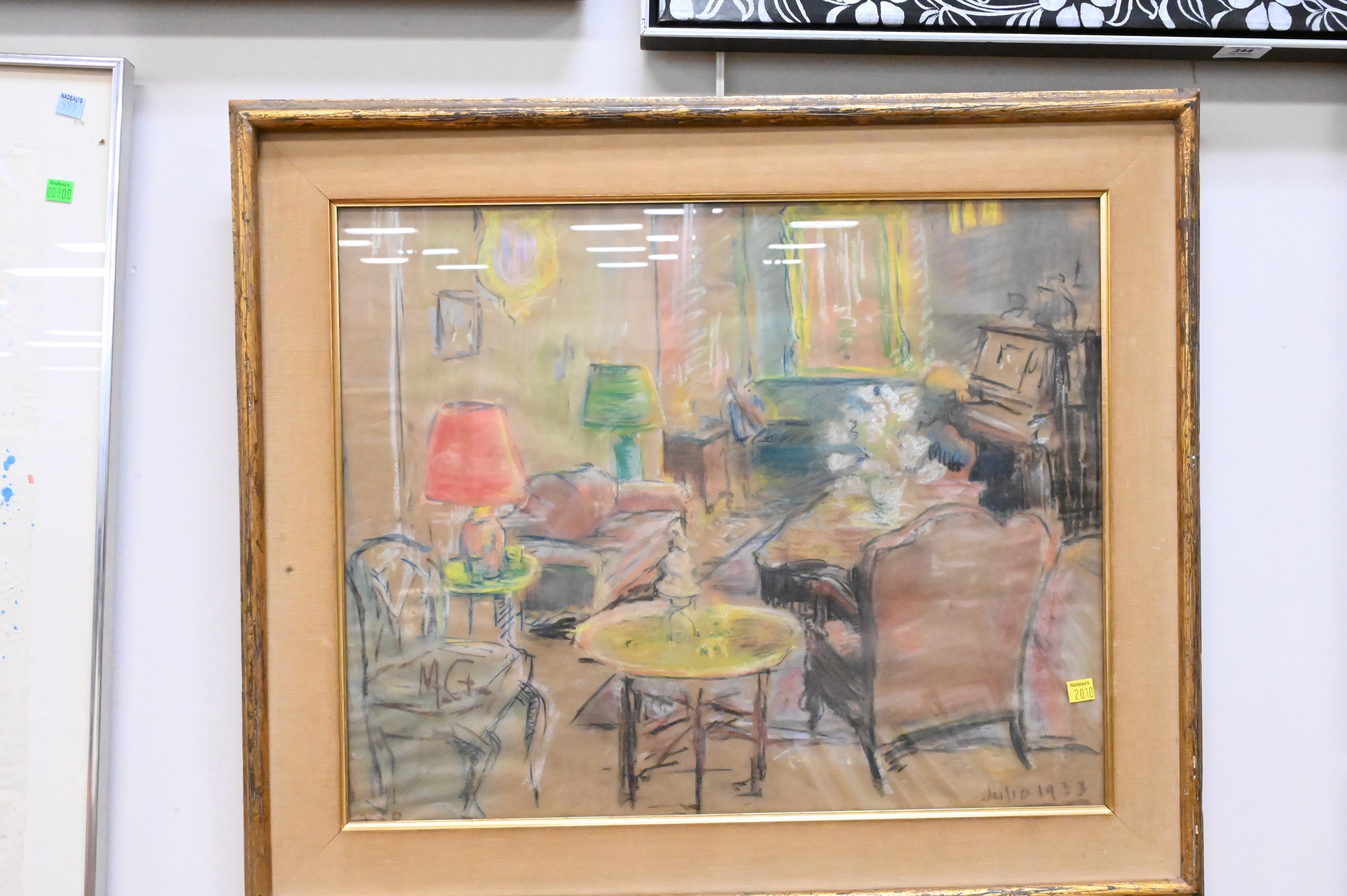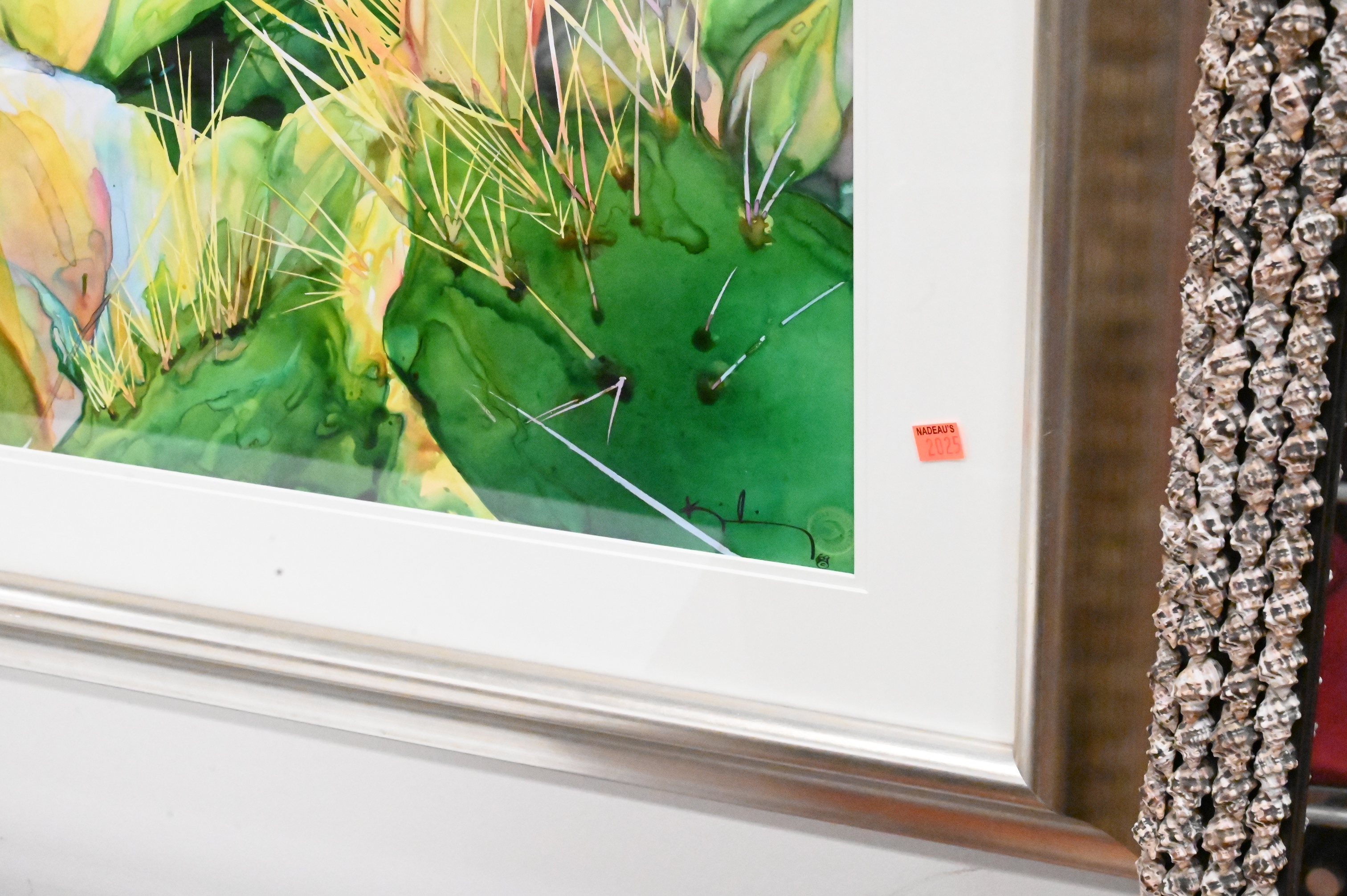 Three Framed Paintings, to include Mike King-Prine, watercolor, “Cactus Flower”, 20″ x 30″, having El Presidio Galleries label on back; Judi Rotenberg, watercolor on paper, signed, 24″ x 35″; along with a pastel interior scene signed Julio 1933; largest 24″ x 36″.