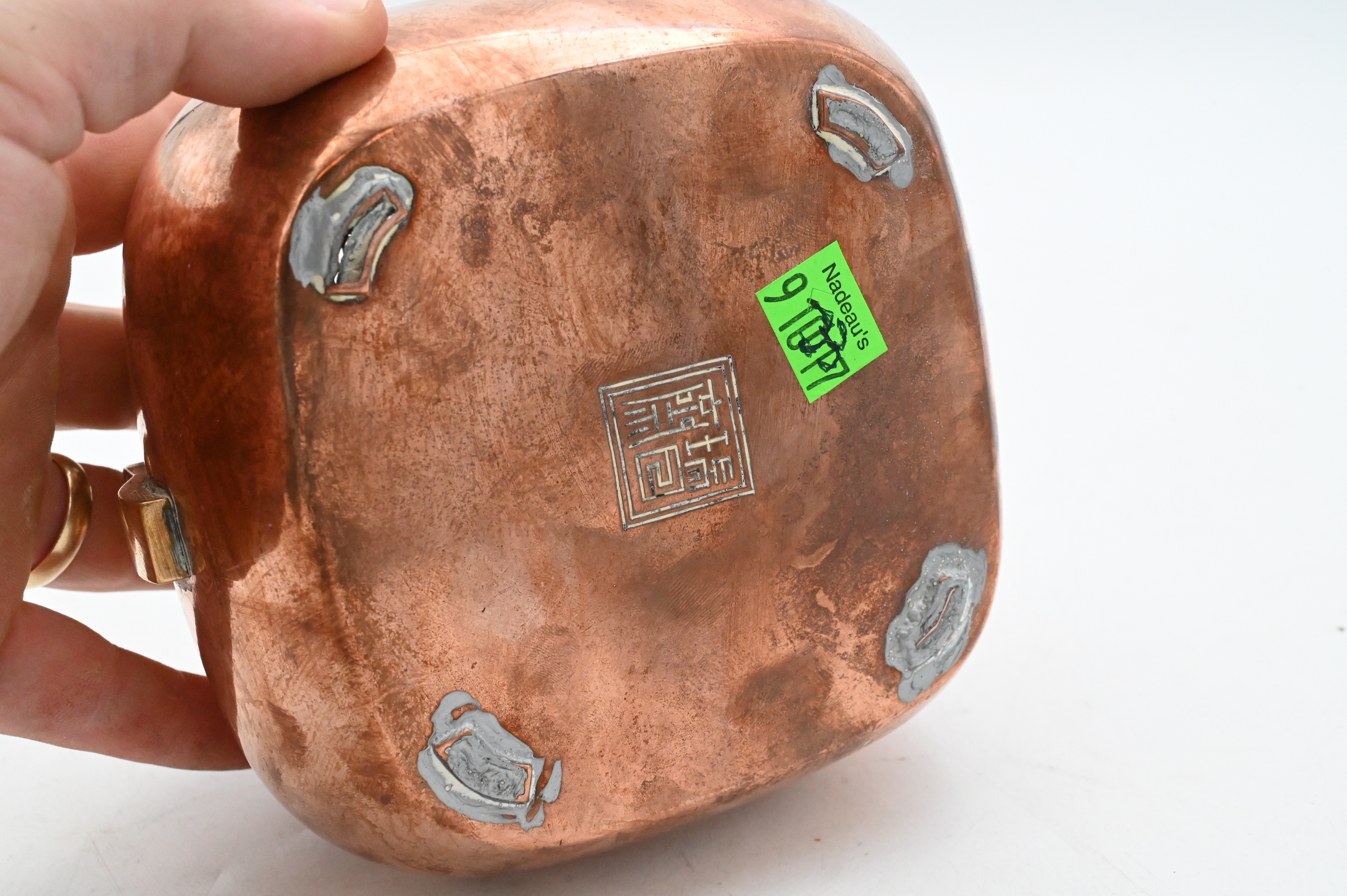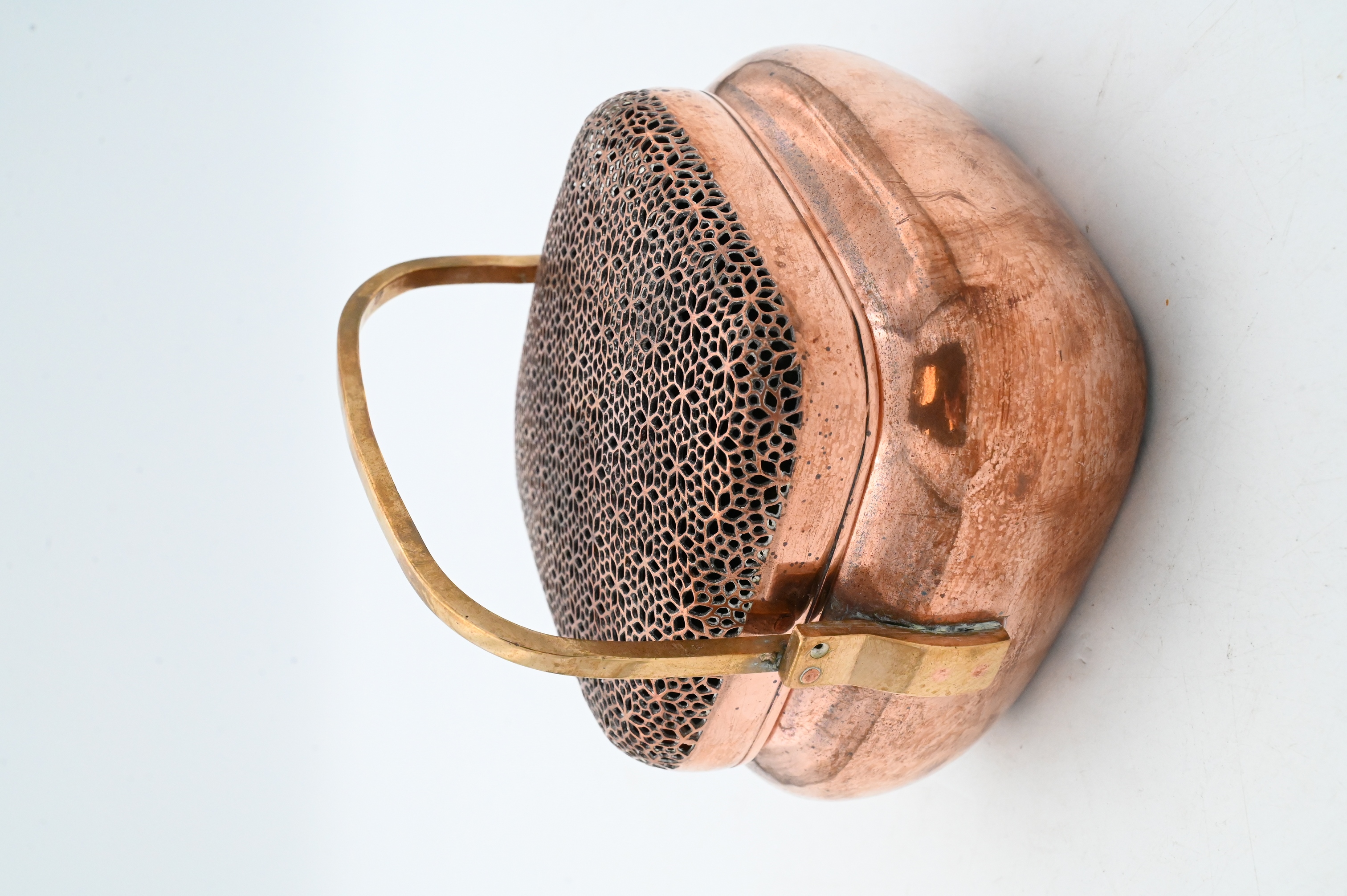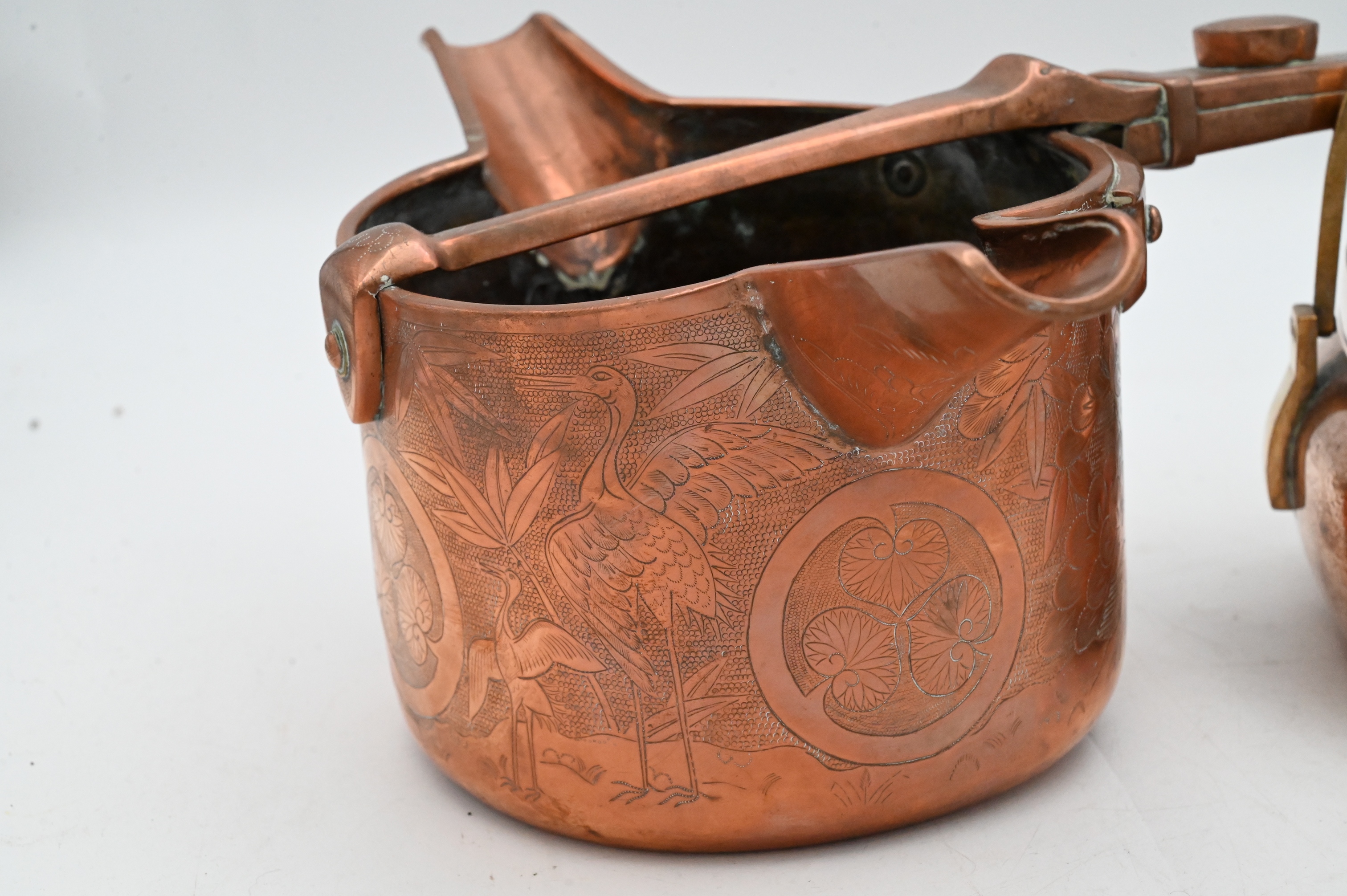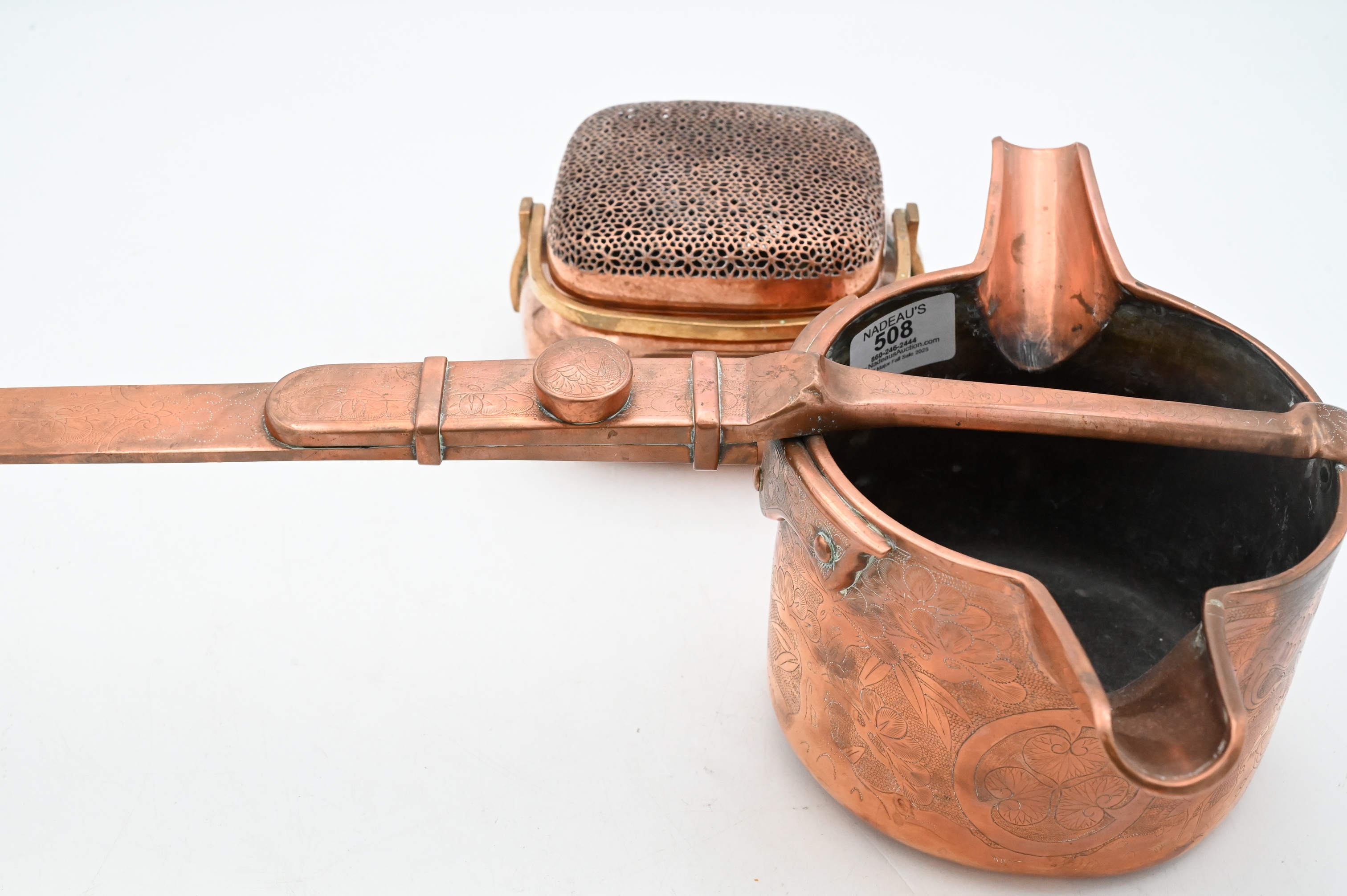Comprising a Buddhist ritual vessel with long engraved handle, together with a copper brazier having a pierced cover and swing handle.