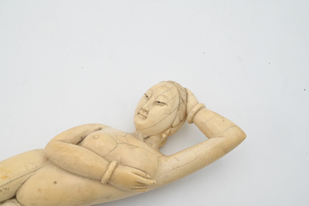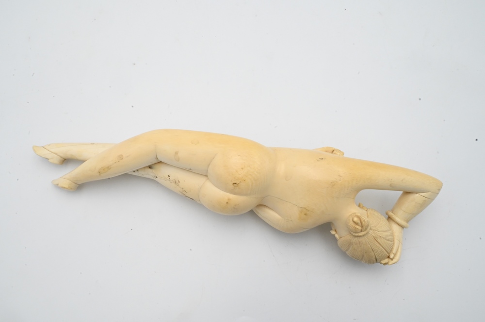 Chinese Carved Ivory Doctor’s Doll, late 19th century, length 12 inches, splits. Please note: Items containing ivory cannot be purchased or shipped by bidders residing outside of the United States or California, Hawaii, Nevada, New Jersey, New York, Washington, Oregon, or District of Columbia. If an ivory item is purchased by a bidder in one of the above mentioned locations or attempts to ship ivory to one of the above mentioned locations, bidder will forfeit the item and be responsible for any incurred fees such as a restocking fee.