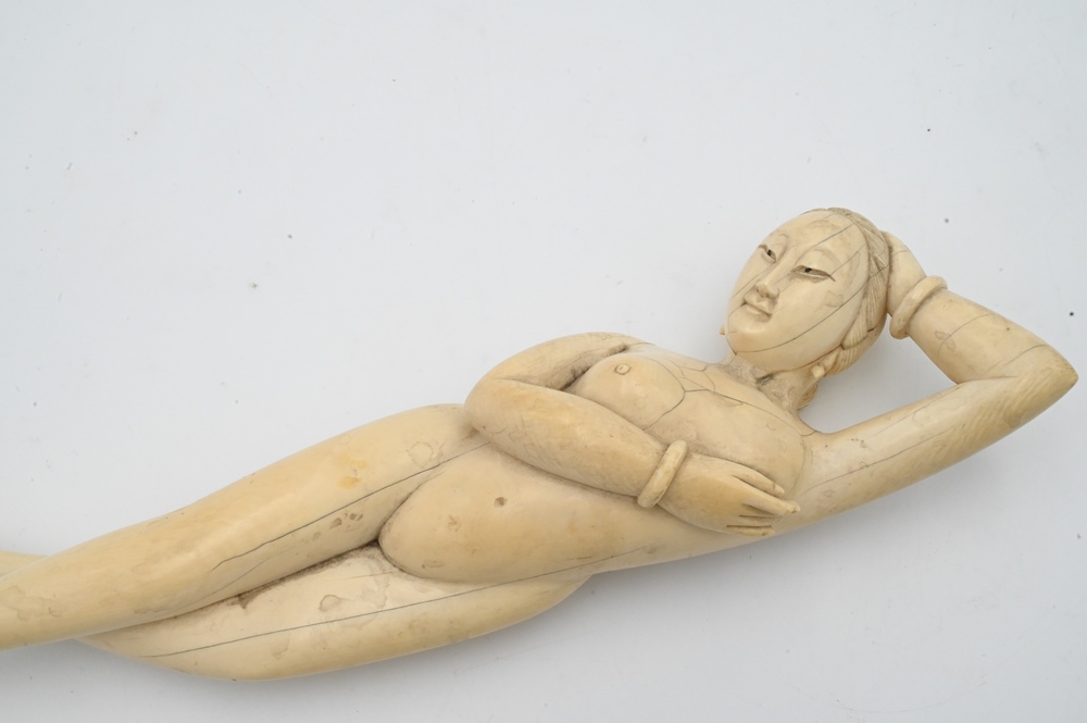 Lot 509: Chinese Carved Ivory Doctor’s Doll, late 19th century, length 12 inches, splits. Please note: Items containing ivory cannot be purchased or shipped by bidders residing outside of the United States or California, Hawaii, Nevada, New Jersey, New York, Washington, Oregon, or District of Columbia. If an ivory item is purchased by a bidder in one of the above mentioned locations or attempts to ship ivory to one of the above mentioned locations, bidder will forfeit the item and be responsible for any incurred fees such as a restocking fee.
