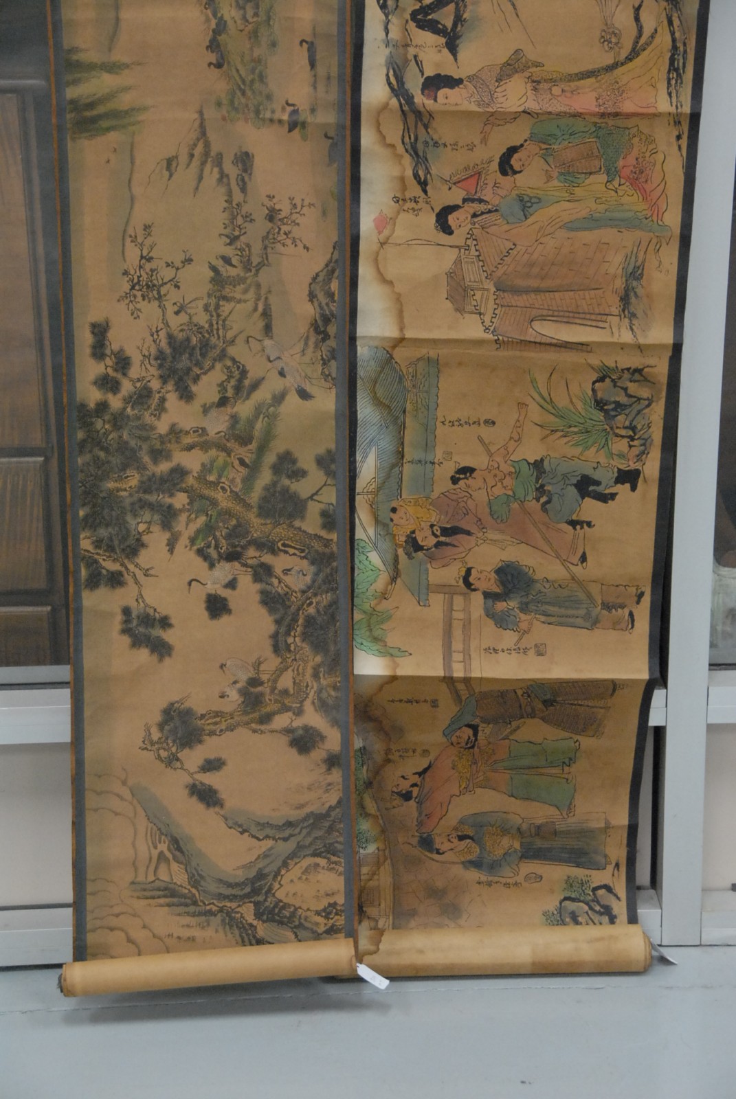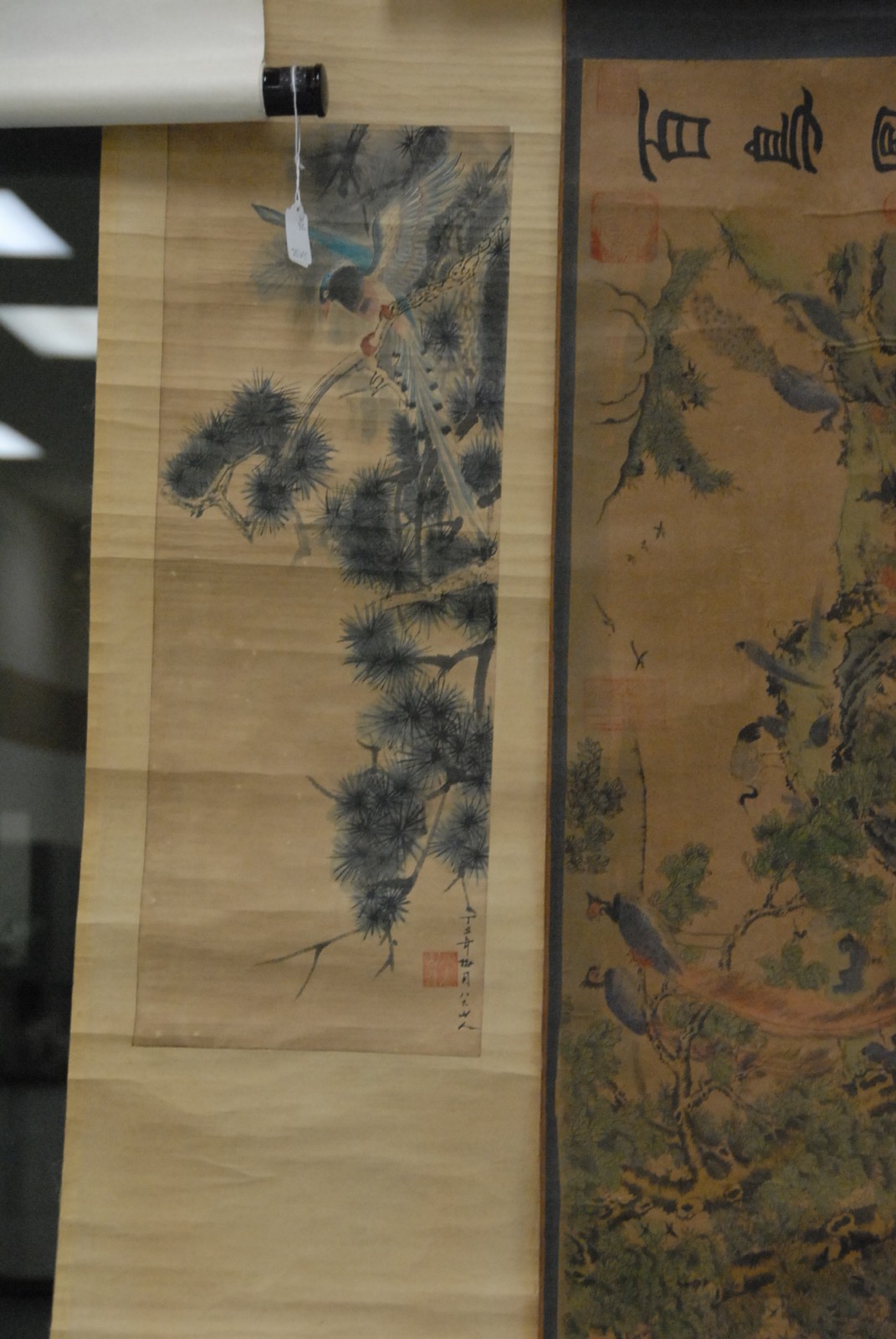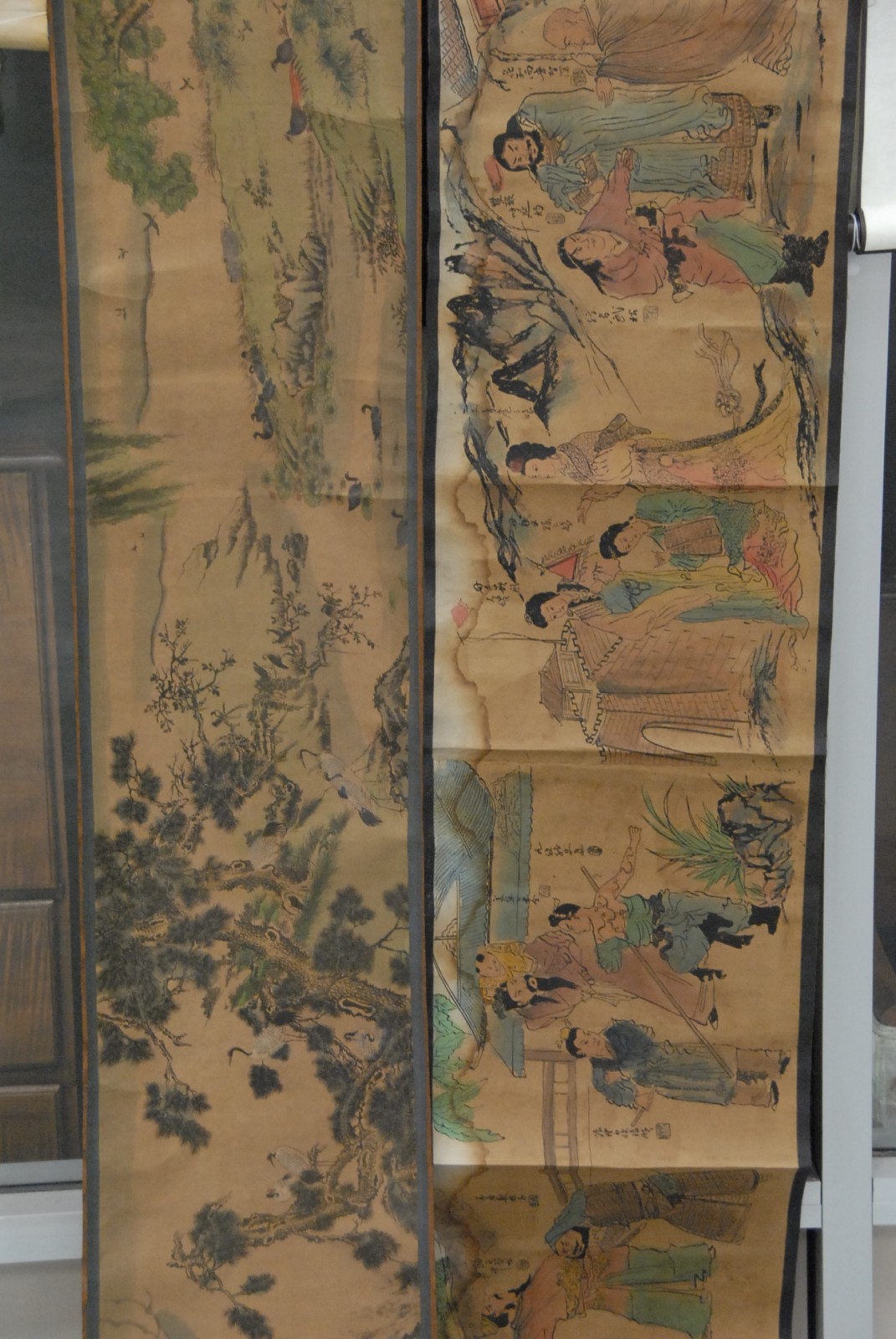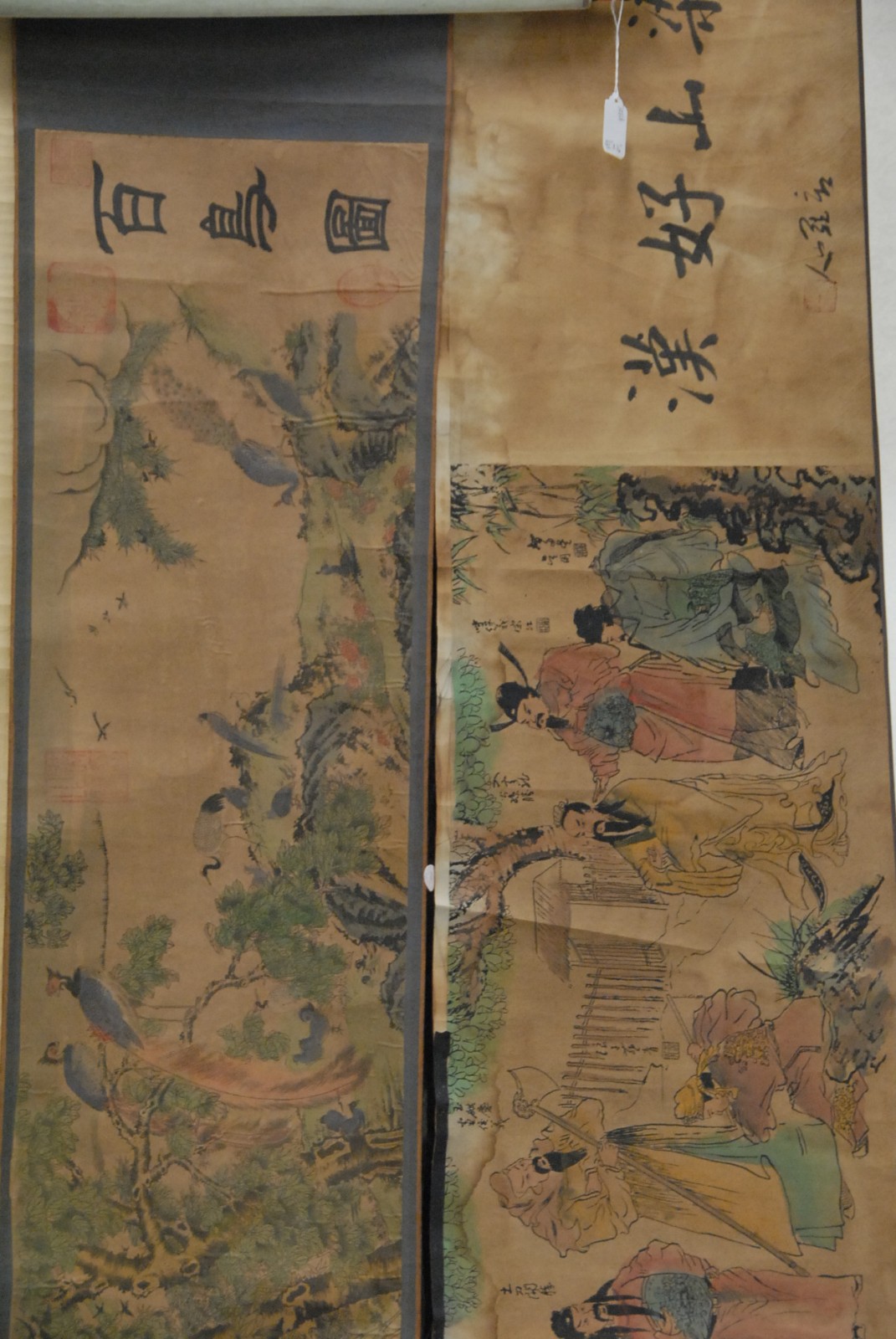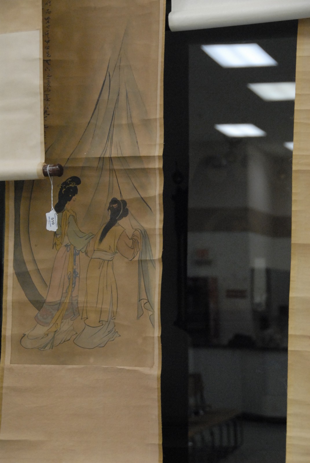 Four scrolls , two are horizontal, one is of two women, one is a tree and a bird.