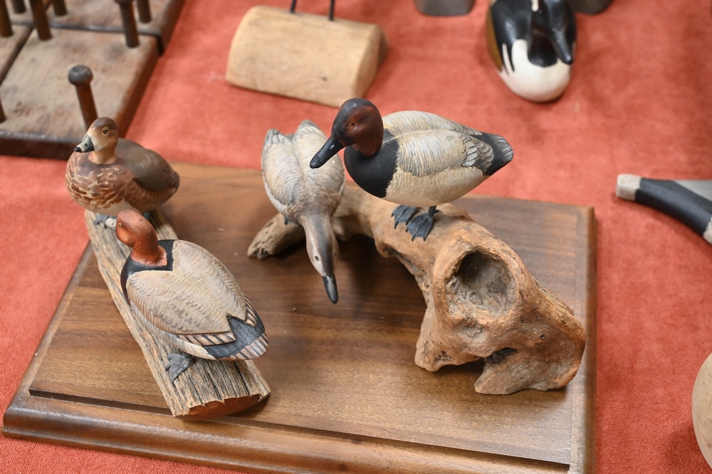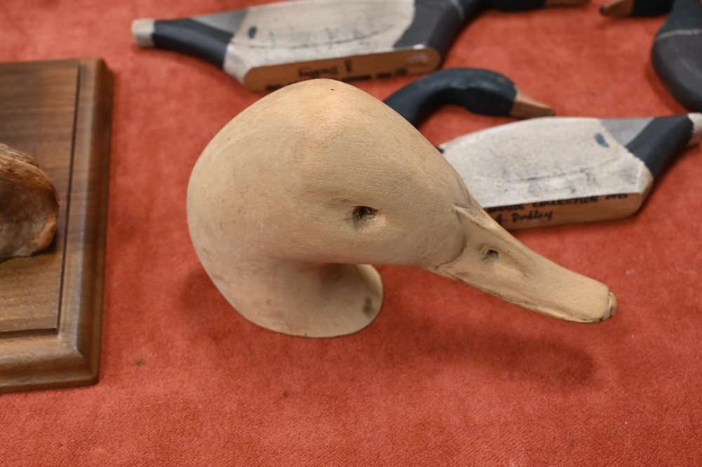 to include a Lemuel Ward duck head; Harold Morse, 1967 Best in Show; 1942 one of a kind James Ahearn mini redheads; Boyds Collection Dudley; 2 H.V. Shourds; Robert Turk; 7 Shorebirds, signed; 2 Herb Cigar Daisey waterfield black crow