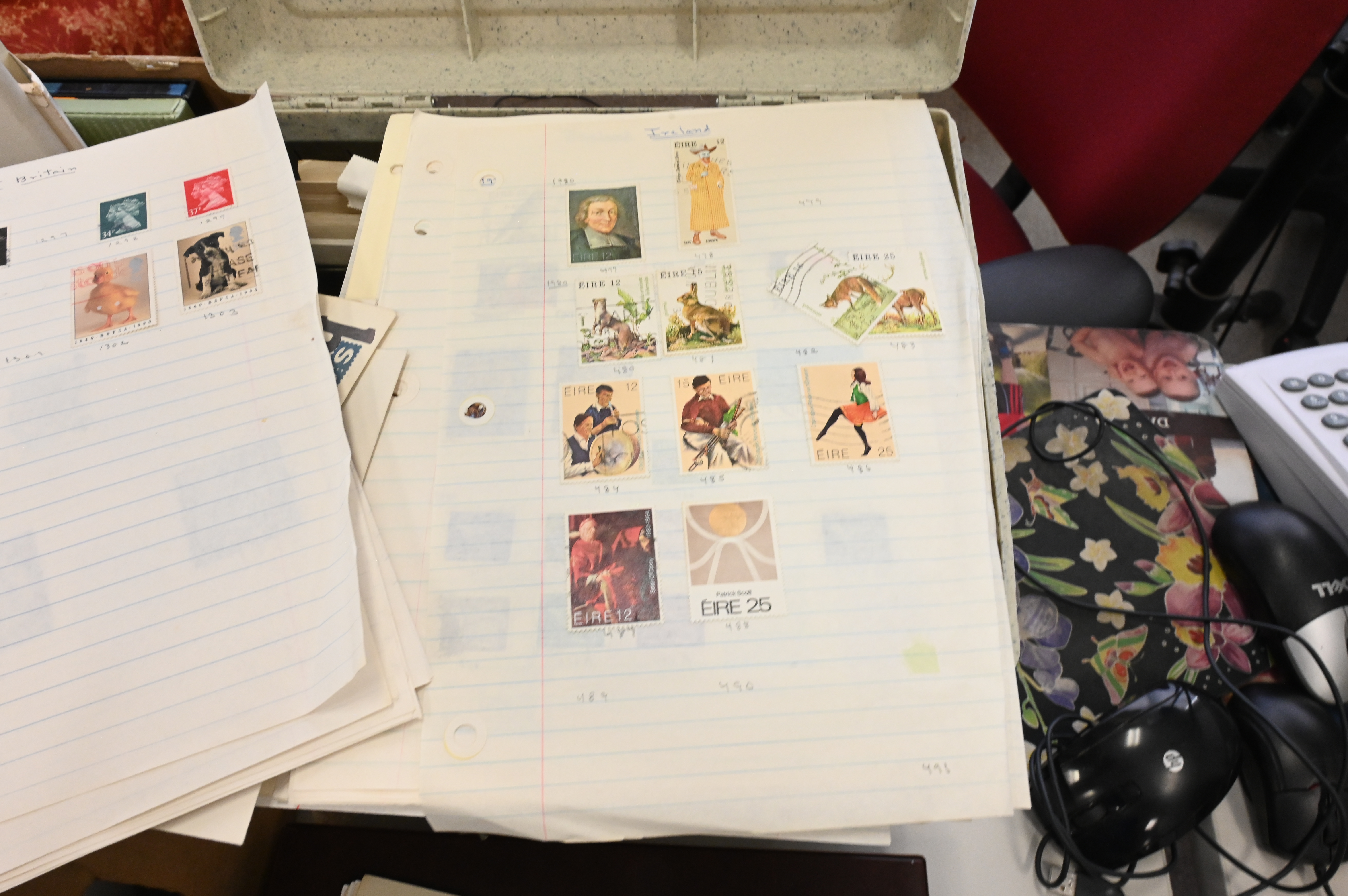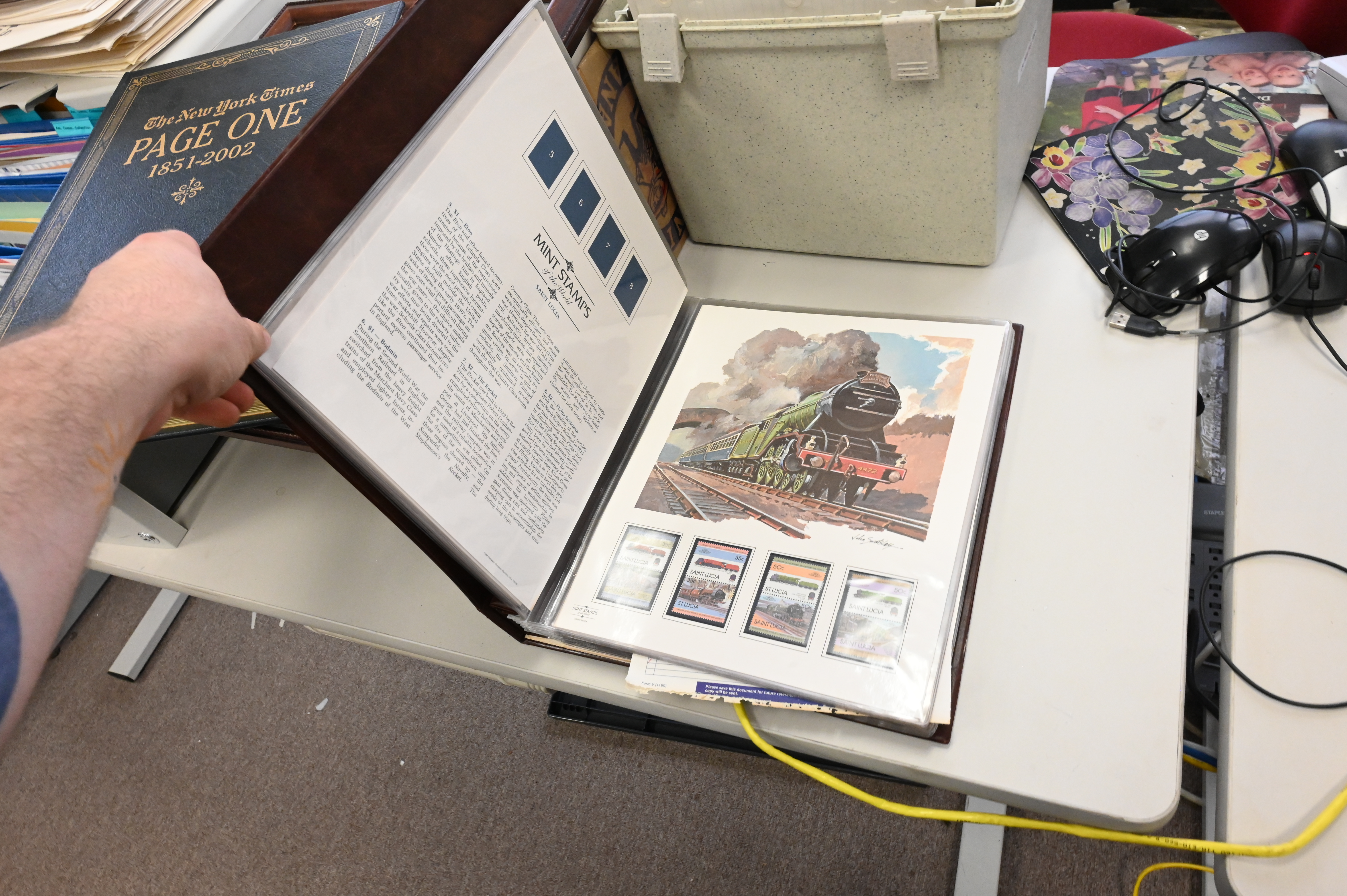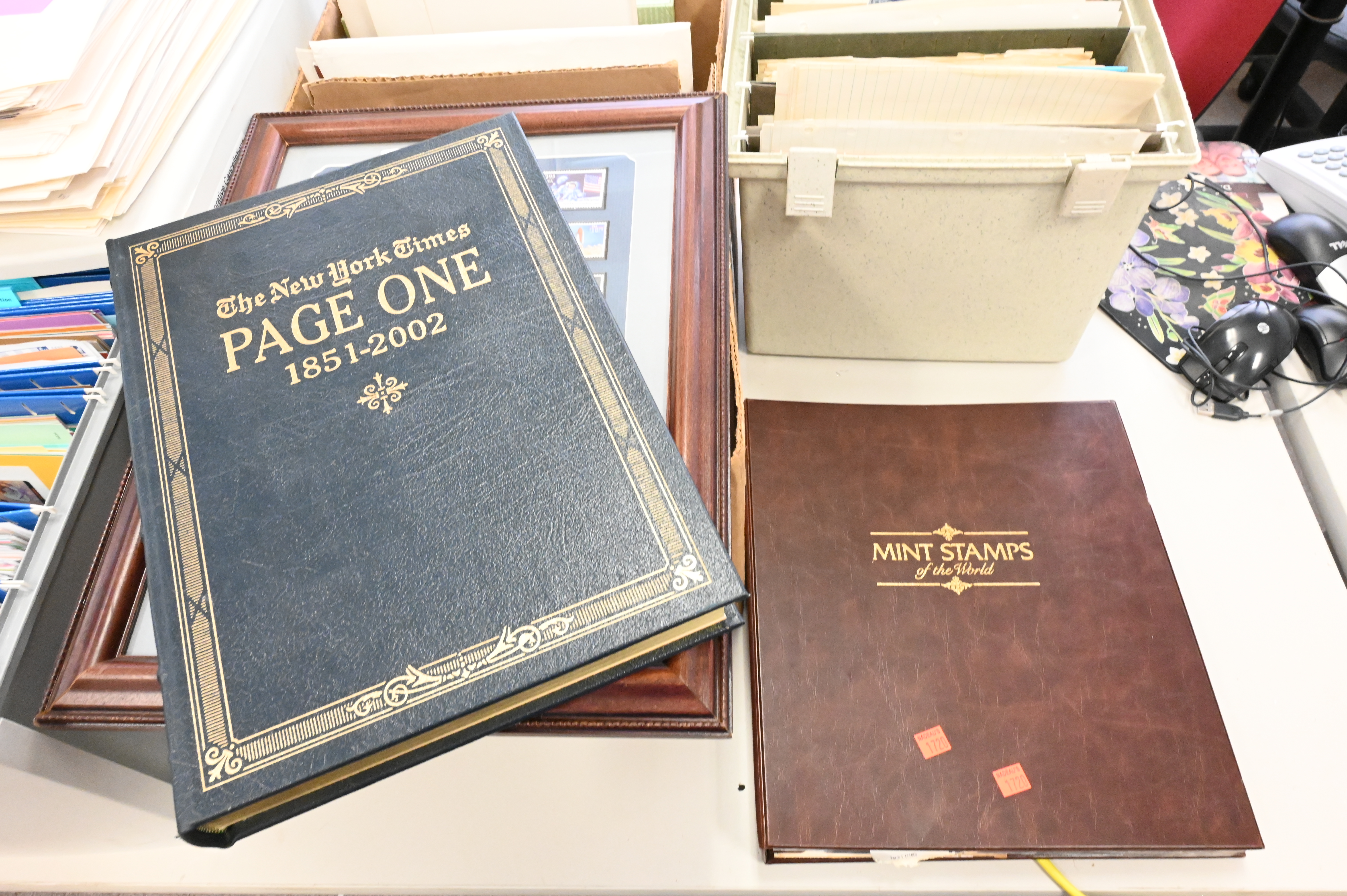 Large Lot of Stamps, from “Around the World Tour” to include Canada, Australia, Spain, U.S., Norway etc.. with a “Mint Stamps of the World” book and “The New York Times Page one 1851-2002” book.