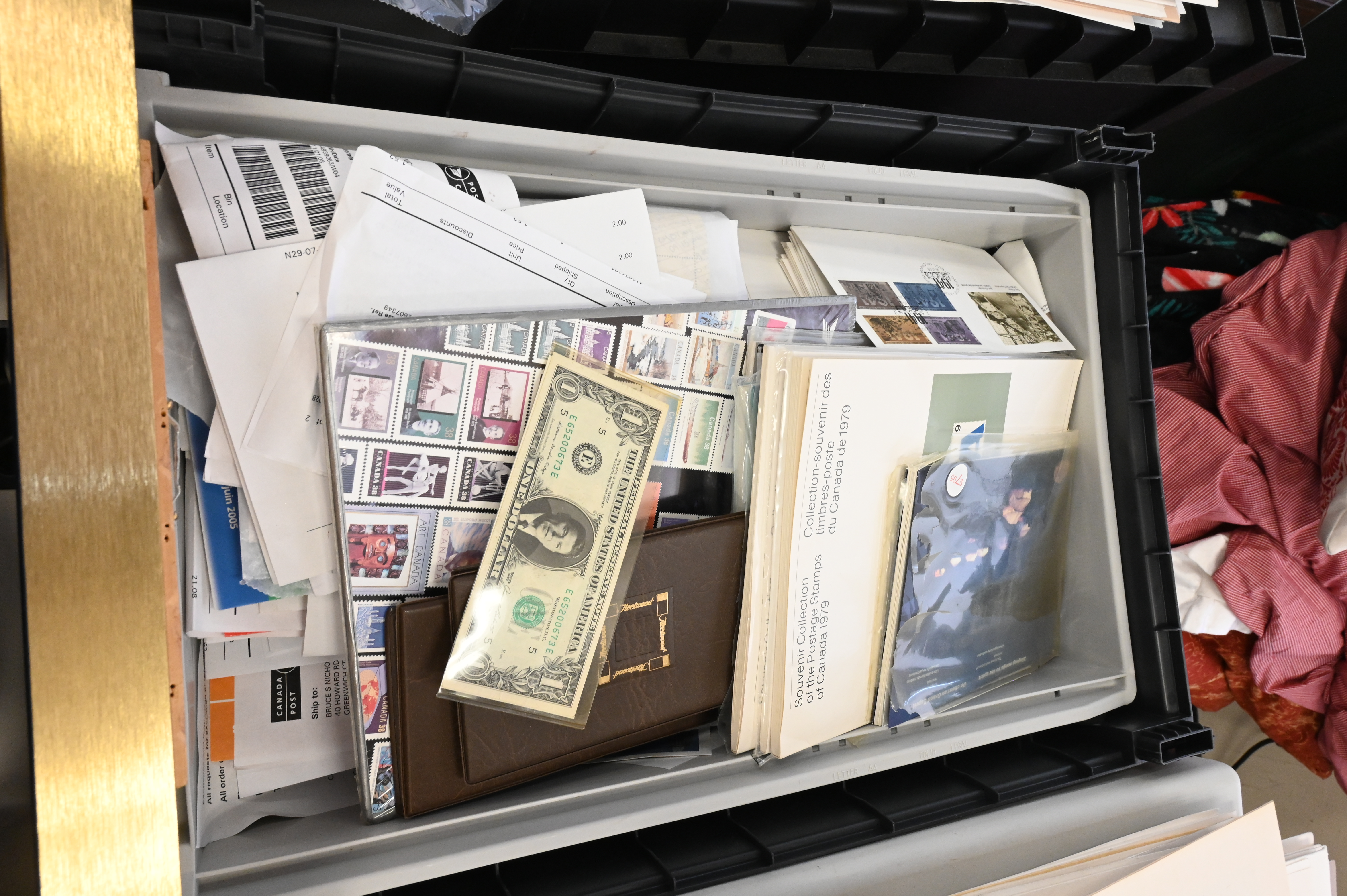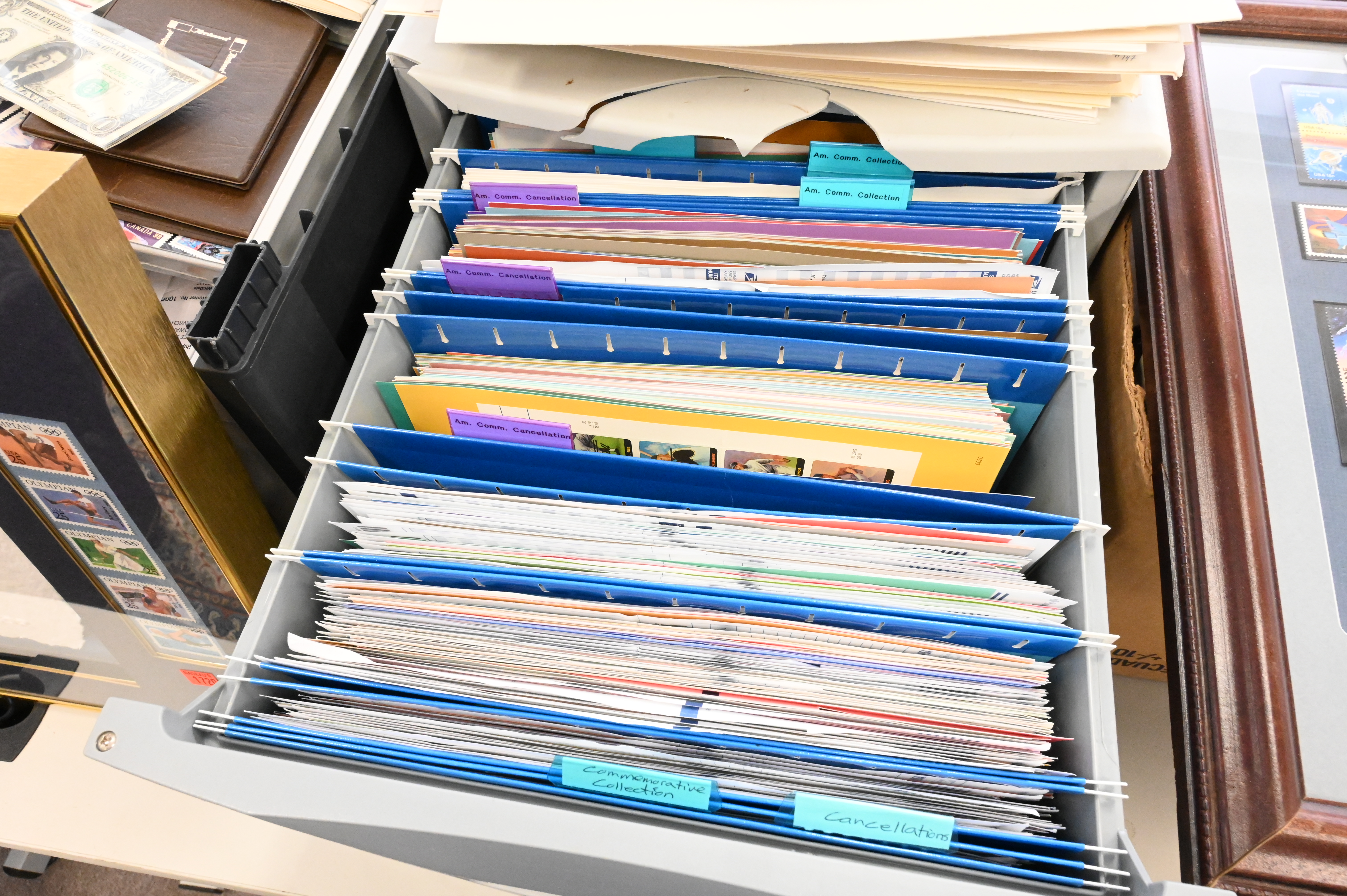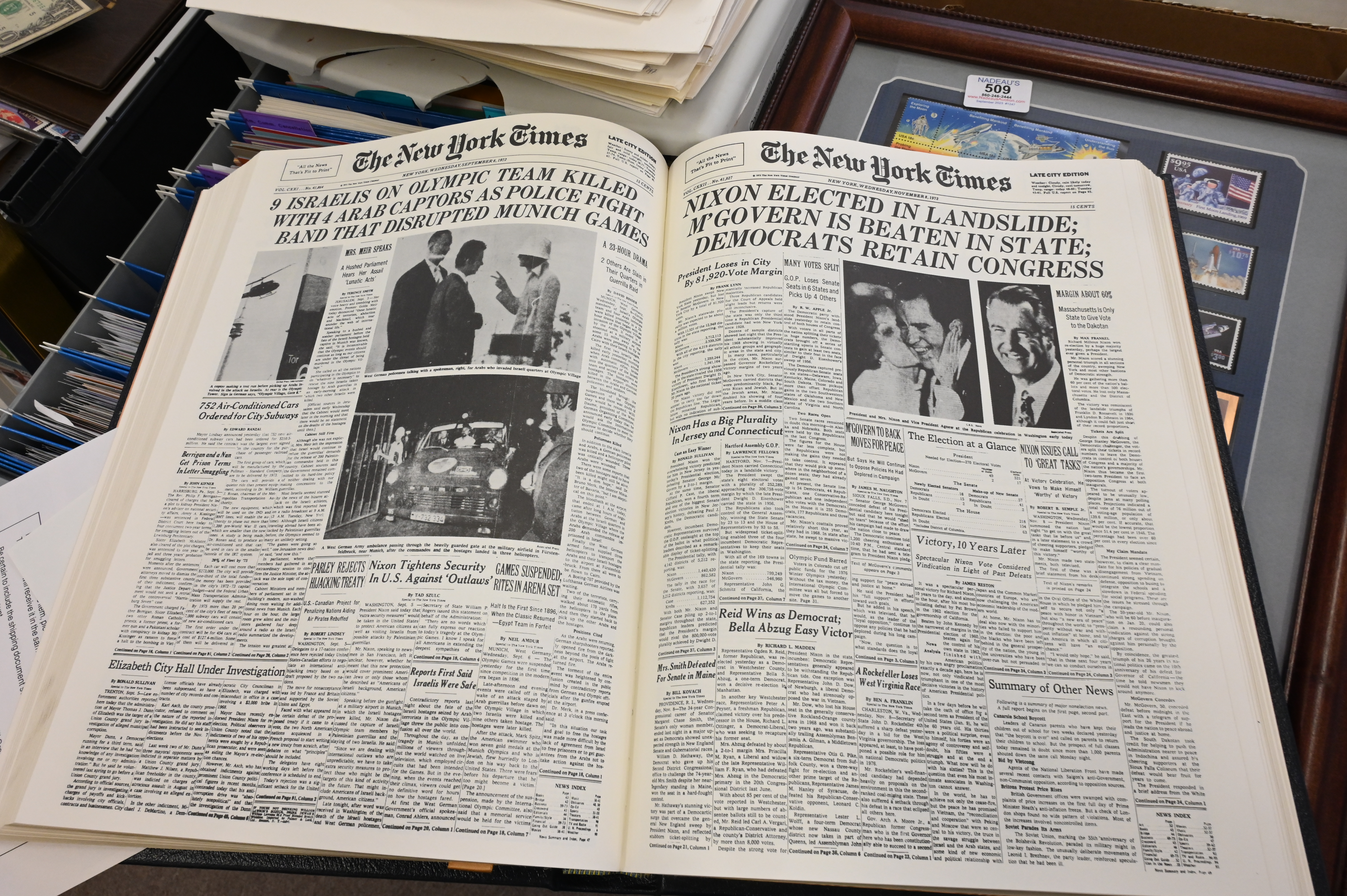 Large Lot of Stamps, from “Around the World Tour” to include Canada, Australia, Spain, U.S., Norway etc.. with a “Mint Stamps of the World” book and “The New York Times Page one 1851-2002” book.