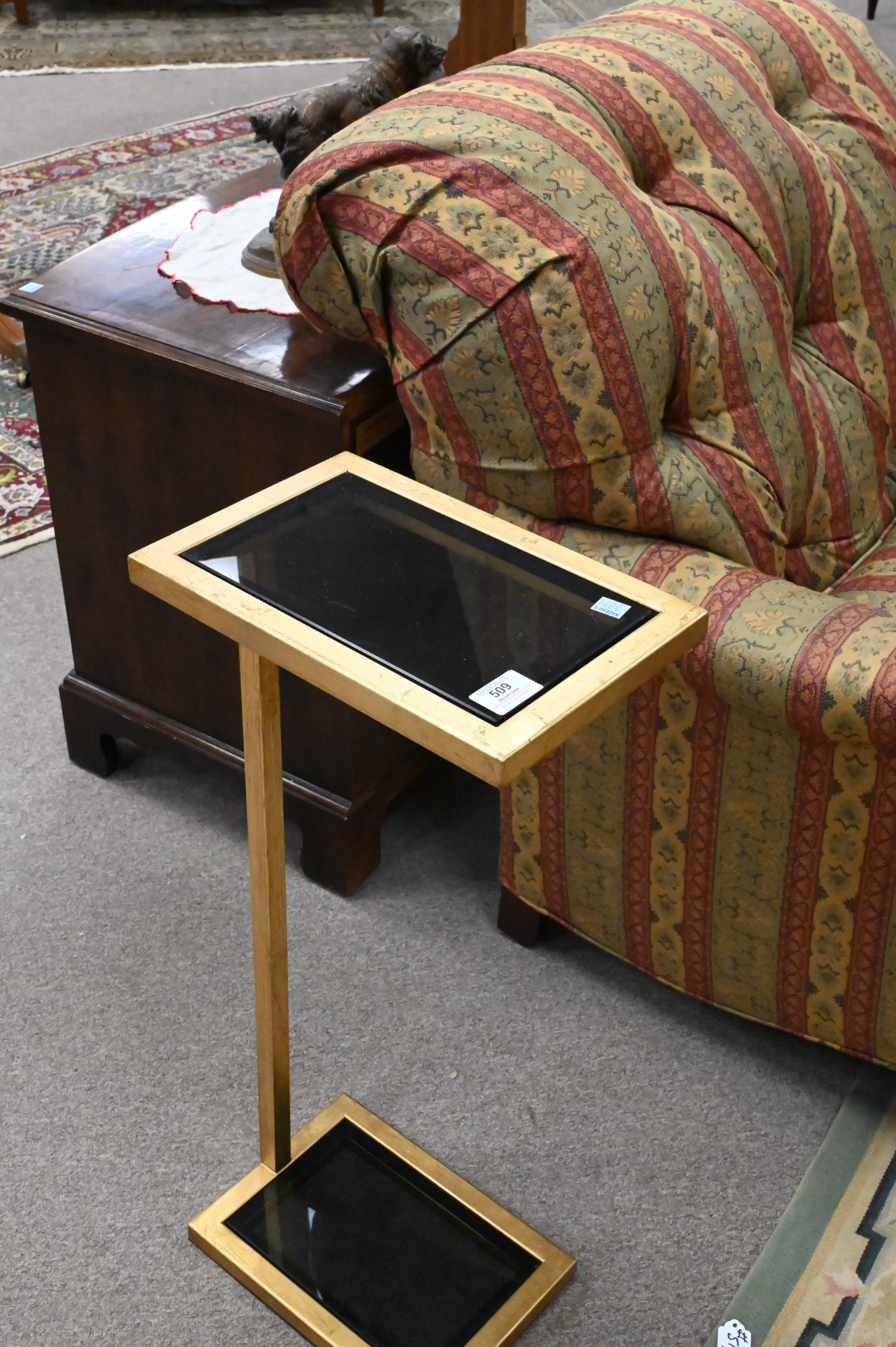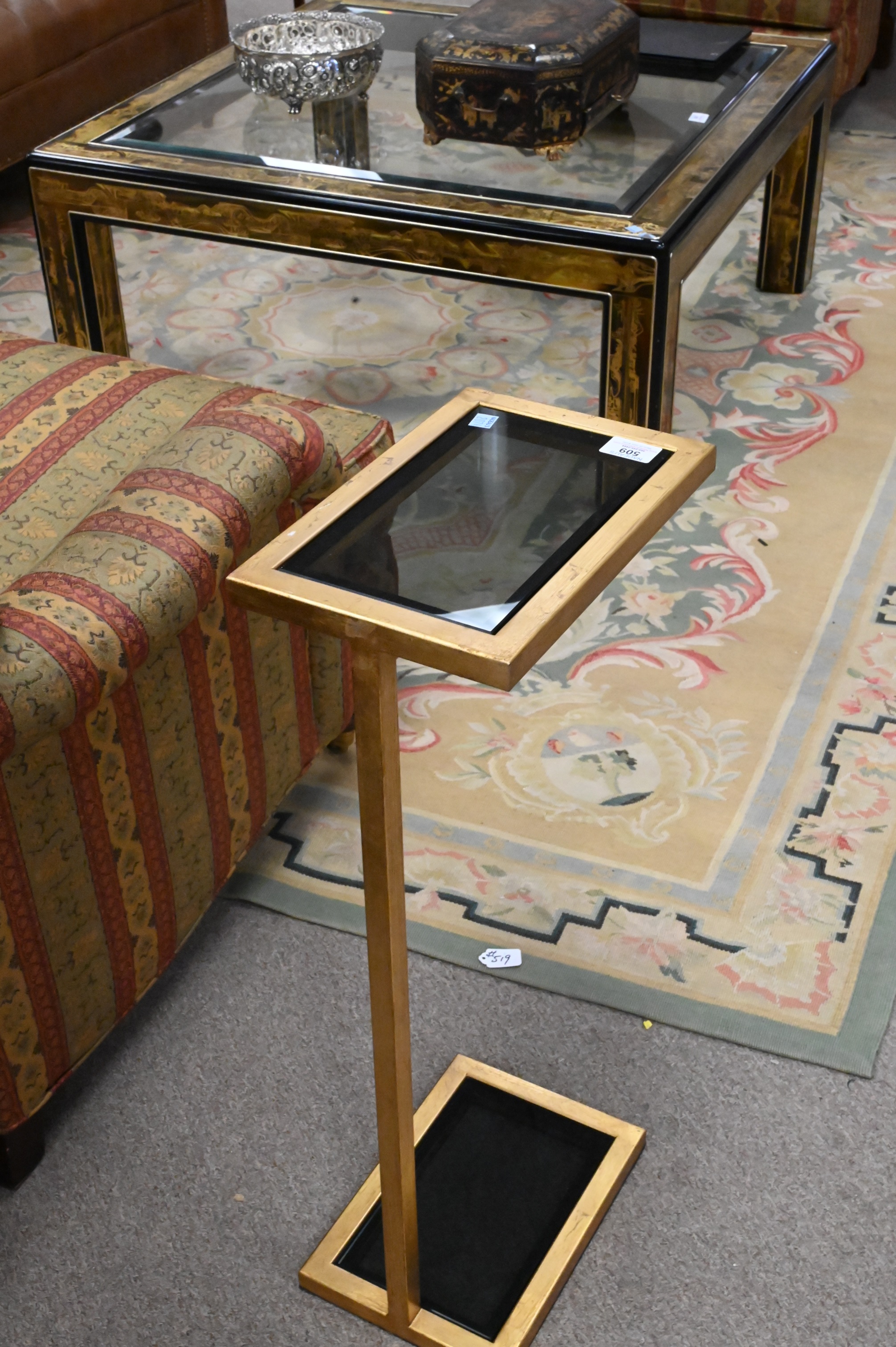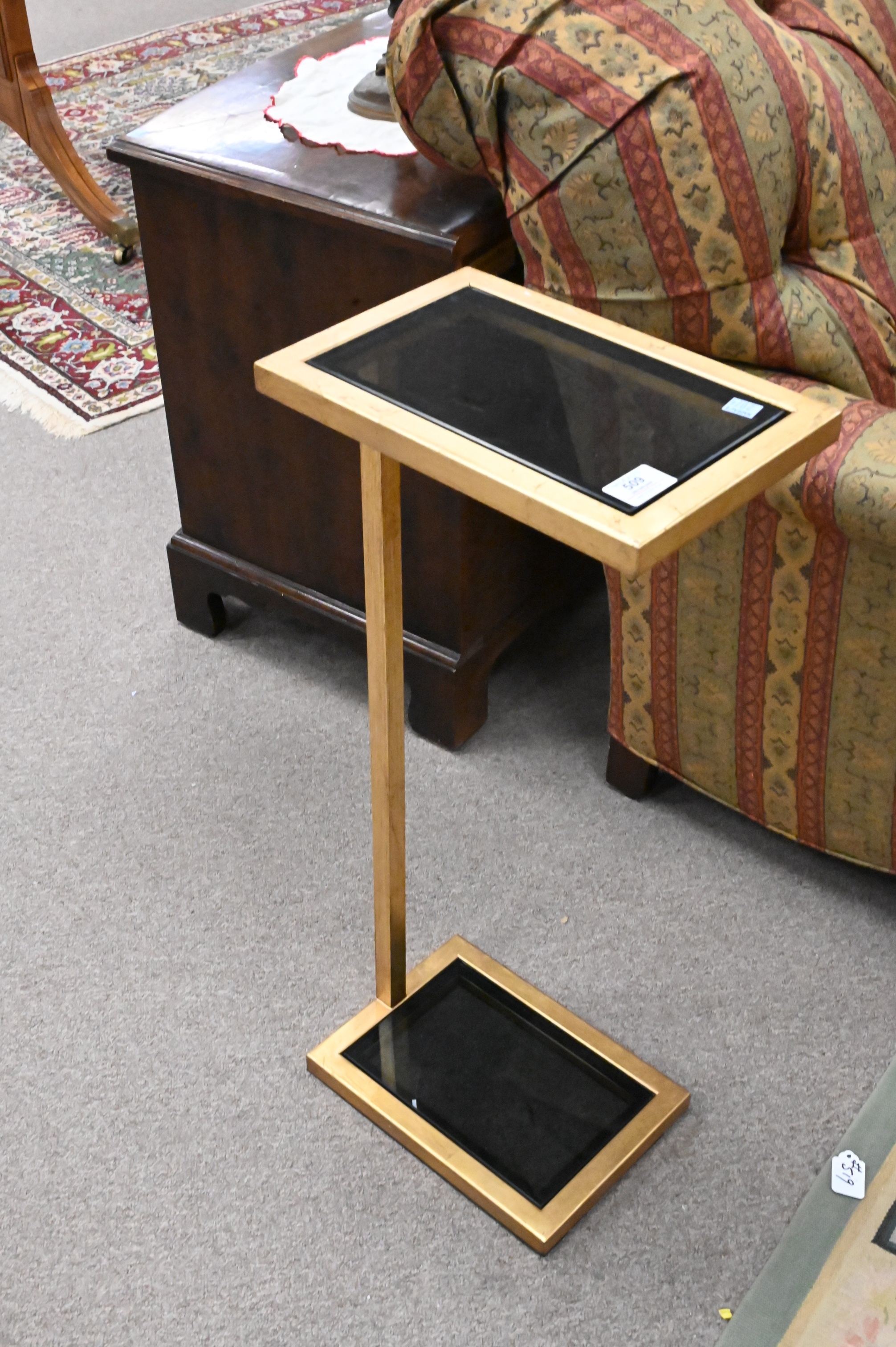 Regina Andrew Liam Drink Table, having contemporary gold color steel base and beveled glass, height 28 1/4 inches, width 12 1/4 inches.