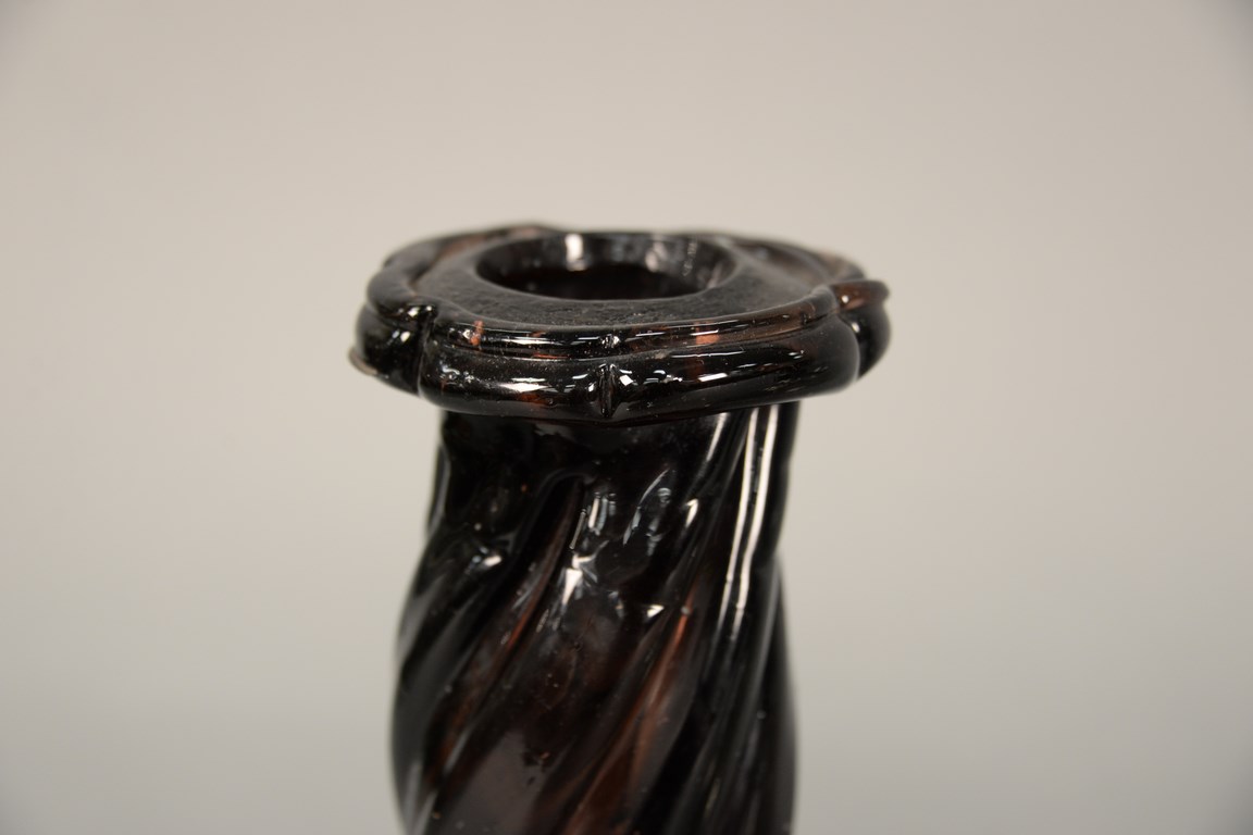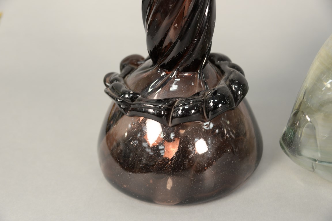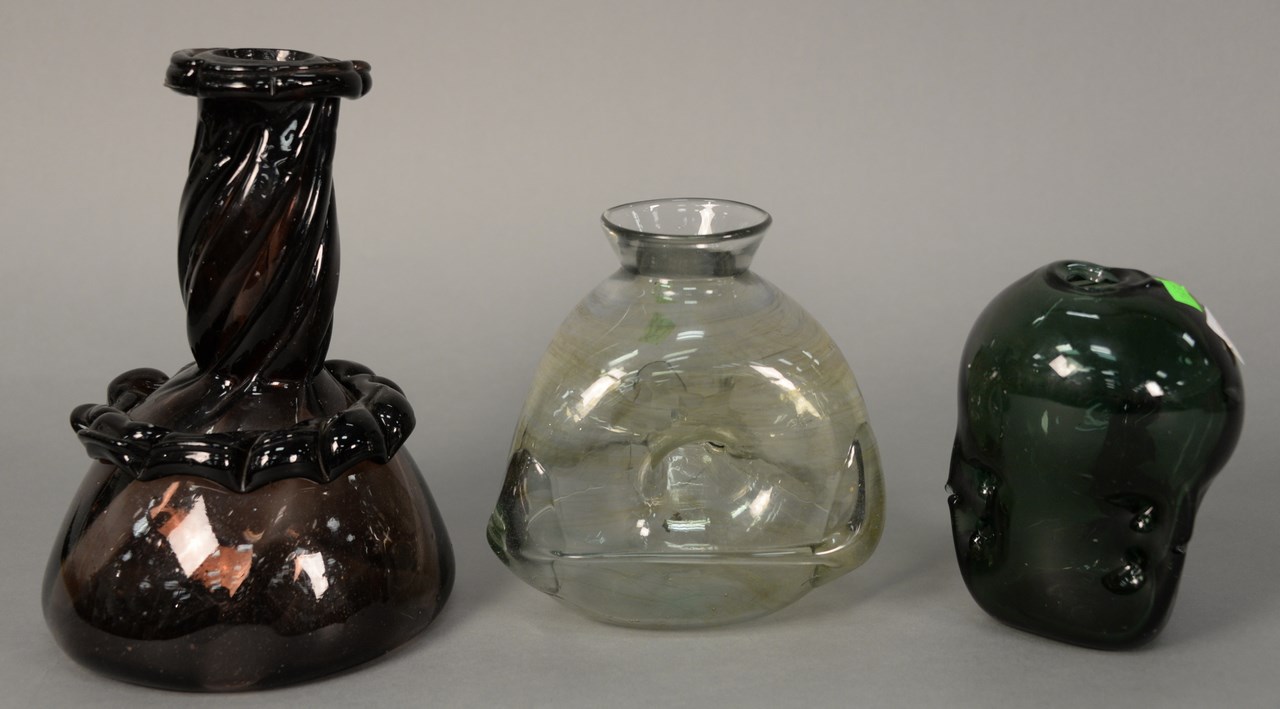 Three hand blown vases including Peter Bramhall pinch vase, green pinch blown vase and a large amethyst art glass bottle vase with applied collar and twisted neck.