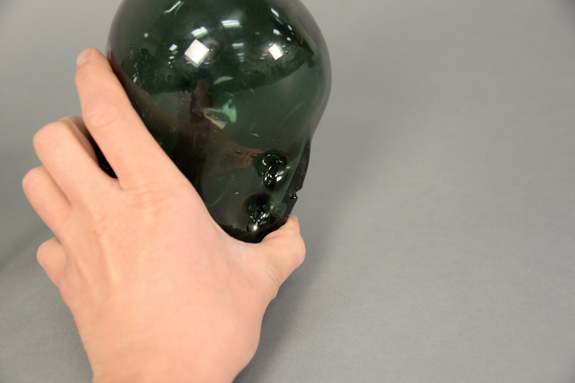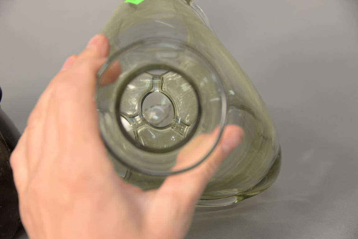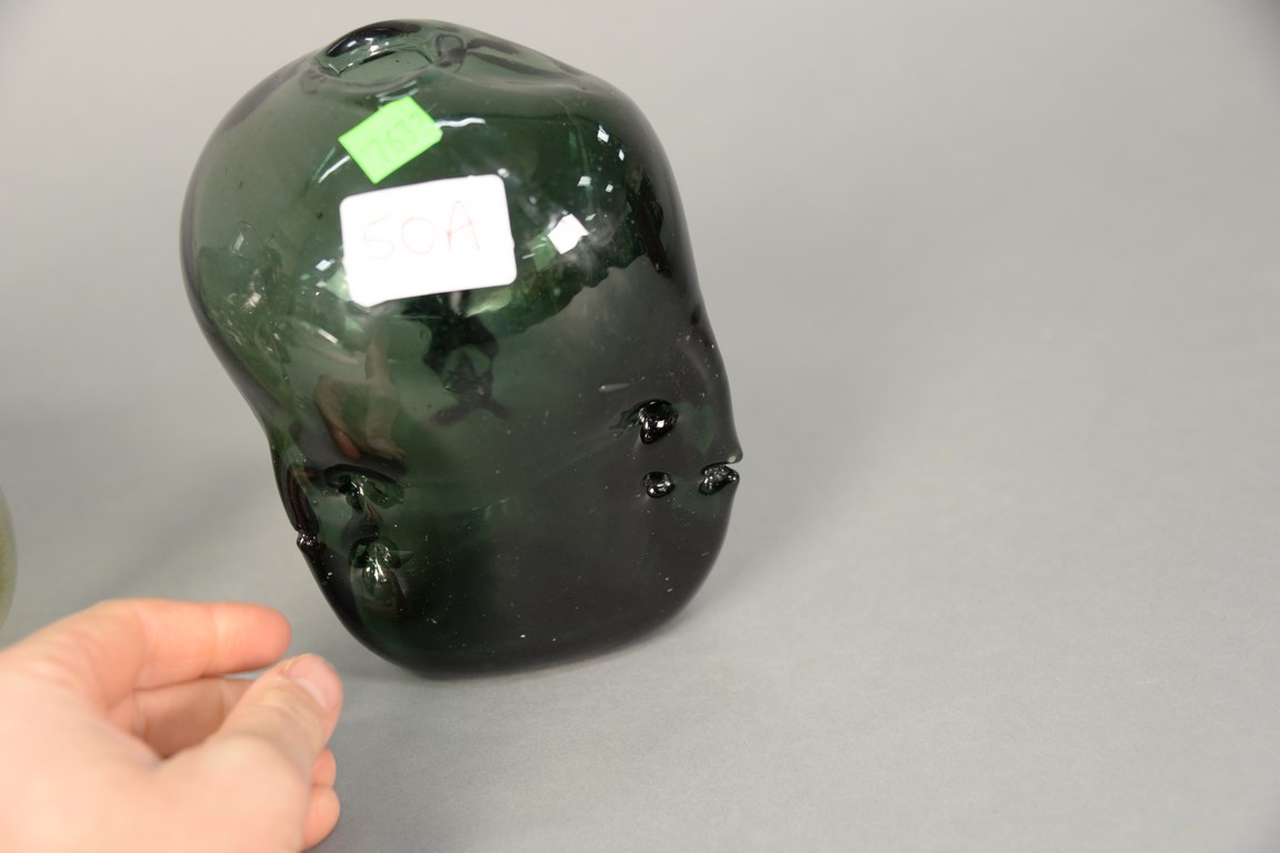 Lot 50A: Three hand blown vases including Peter Bramhall pinch vase, green pinch blown vase and a large amethyst art glass bottle vase with a…