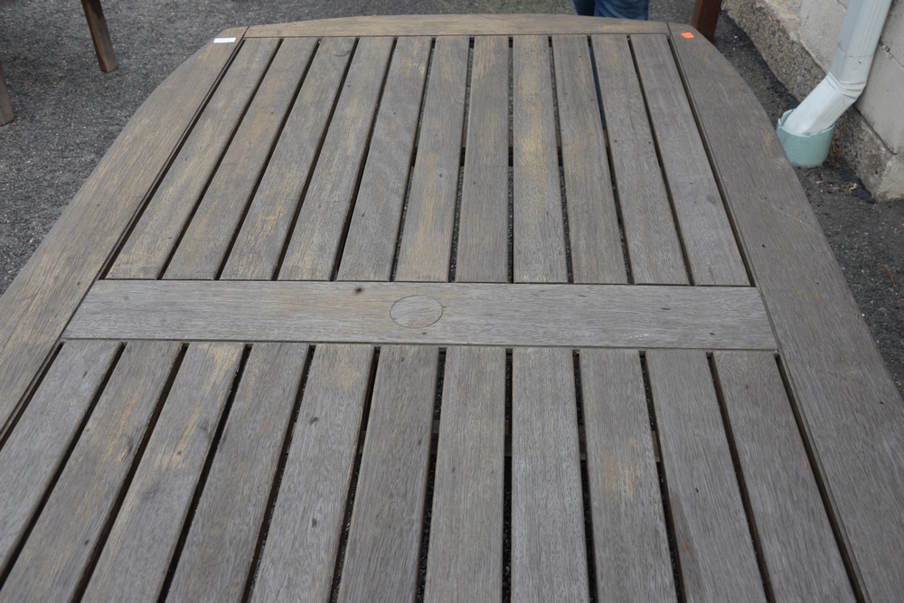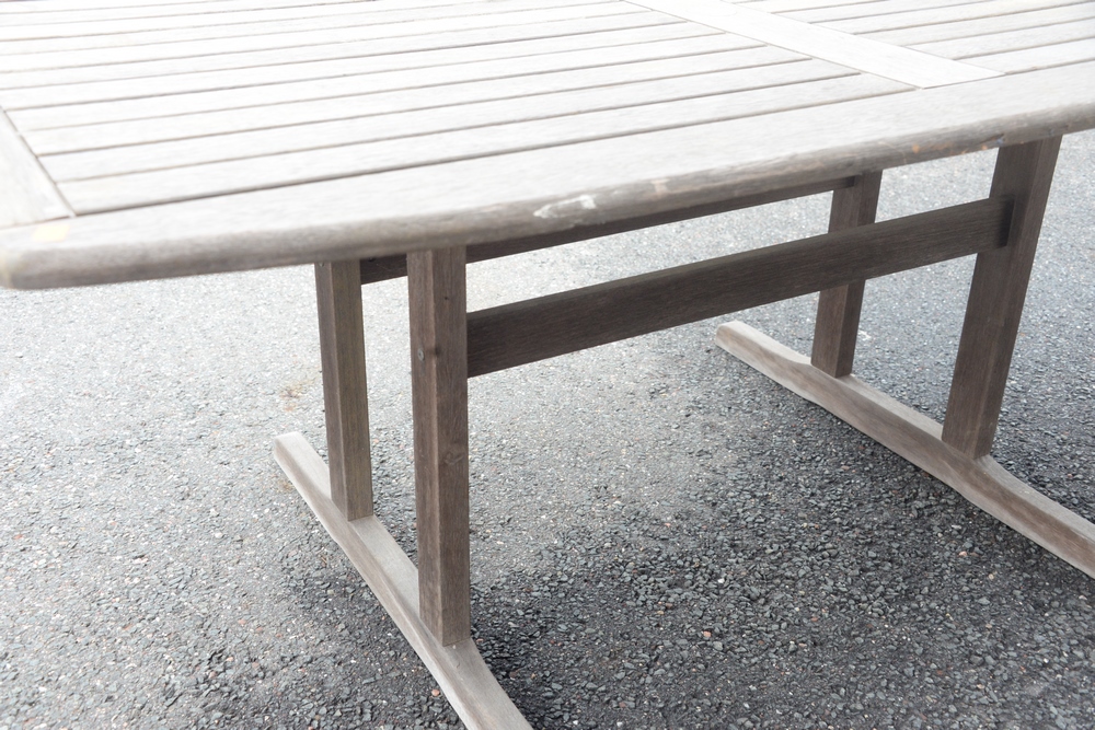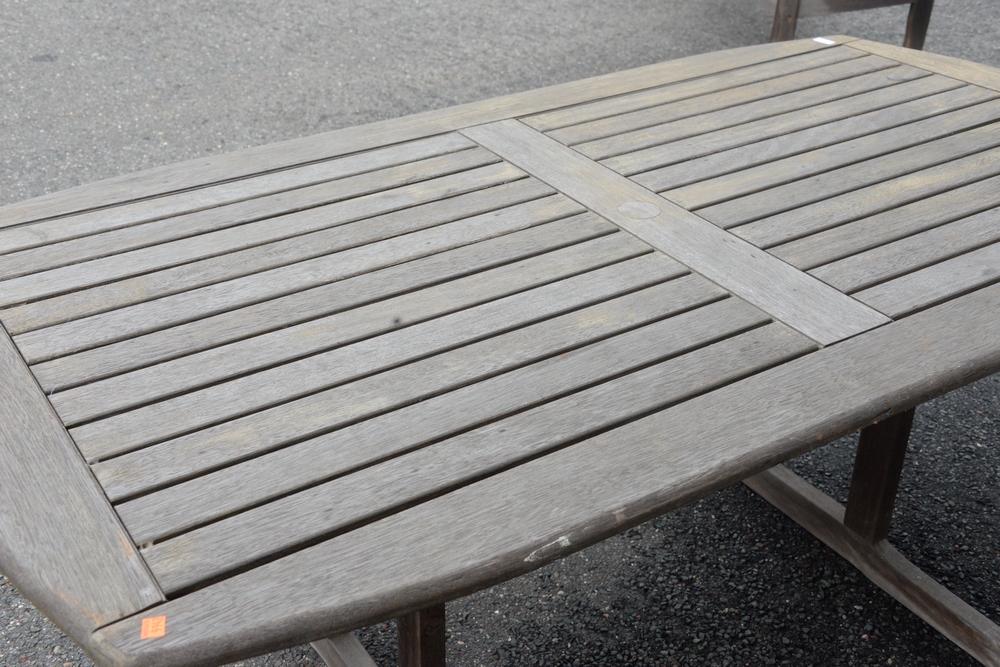 Teak Outdoor Table, having trestle base, height 28 inches, top 39″ x 71″.