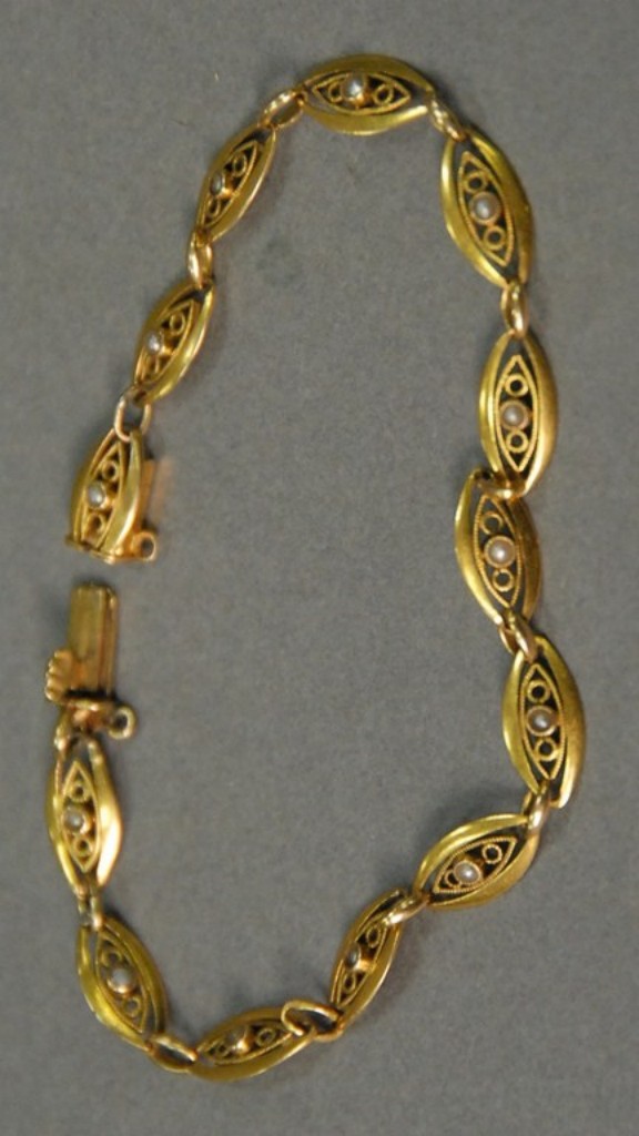 18kt gold Victorian bracelet set with small pearls. lg. 7 1/2 6.8 grams