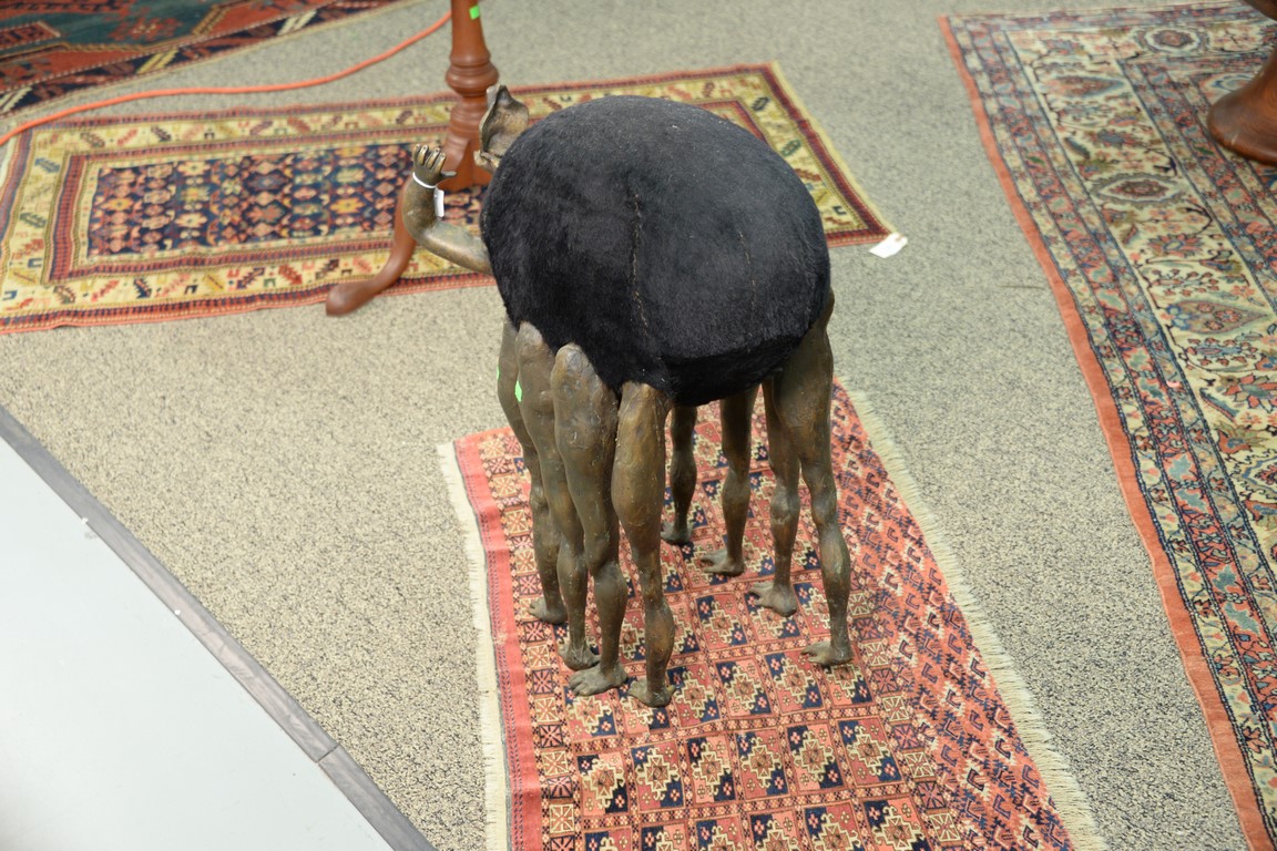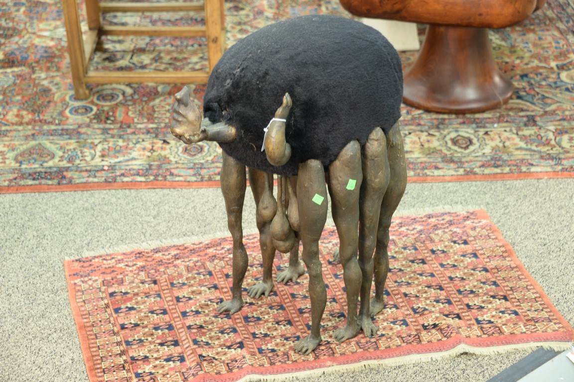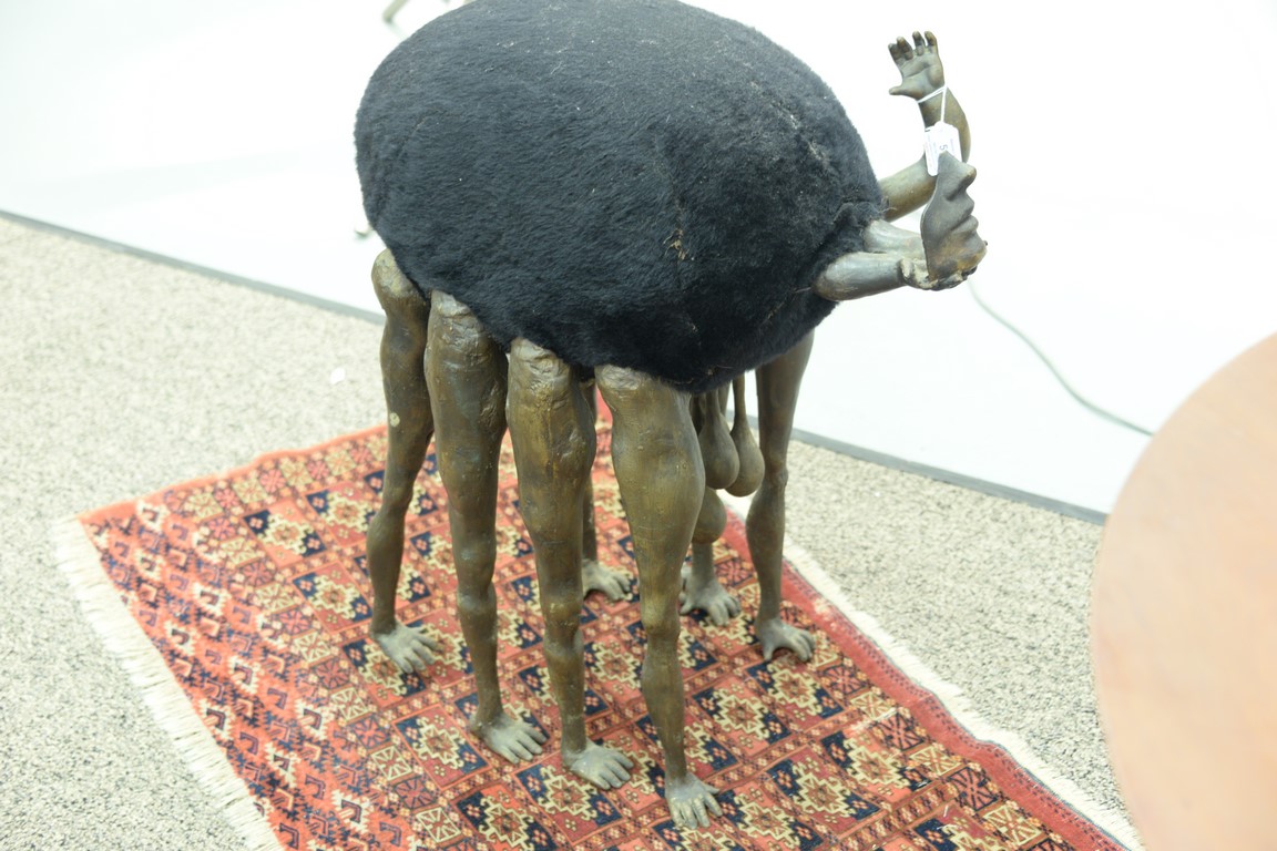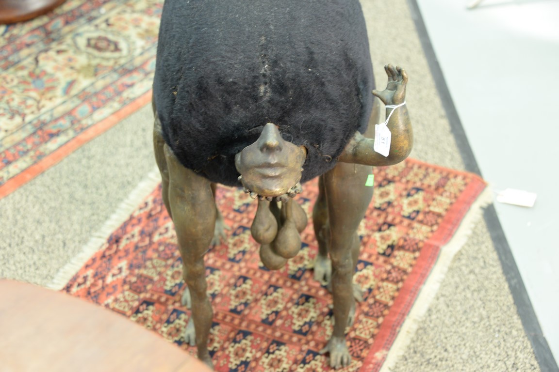 Lot 51: Bronze animal creature sculpture having short arms and hands holding partial mask face with round body over male anatomy, on eight a…
