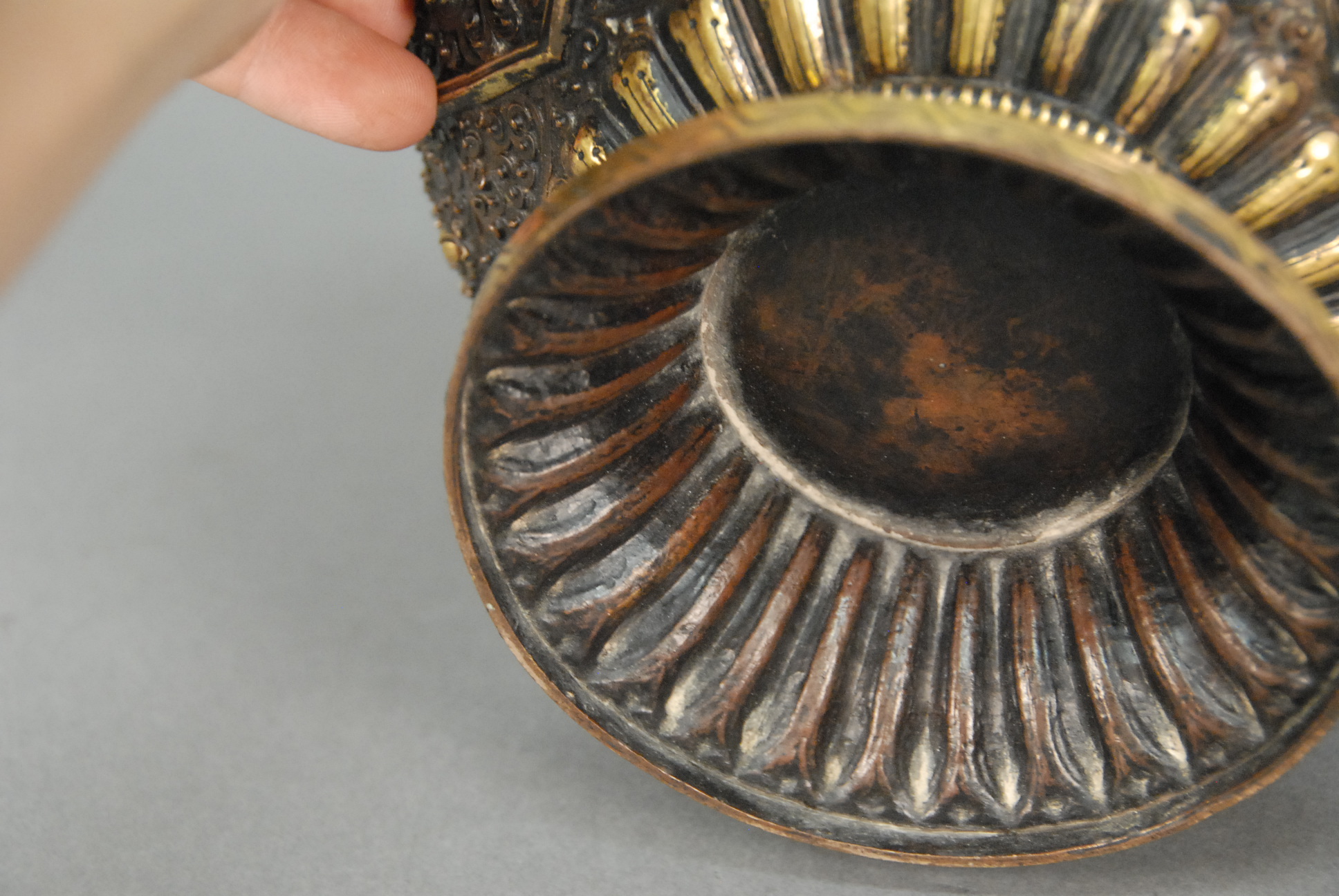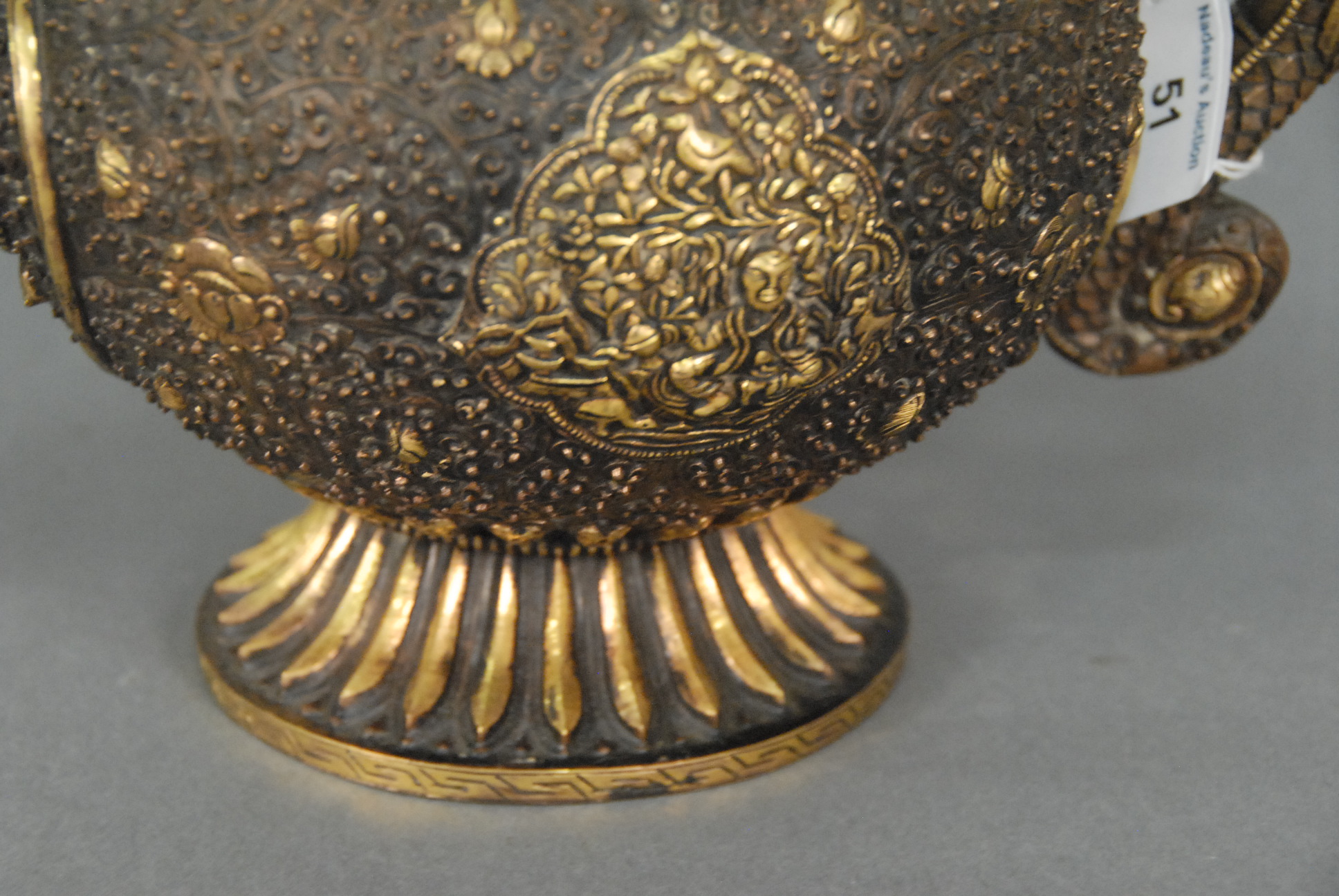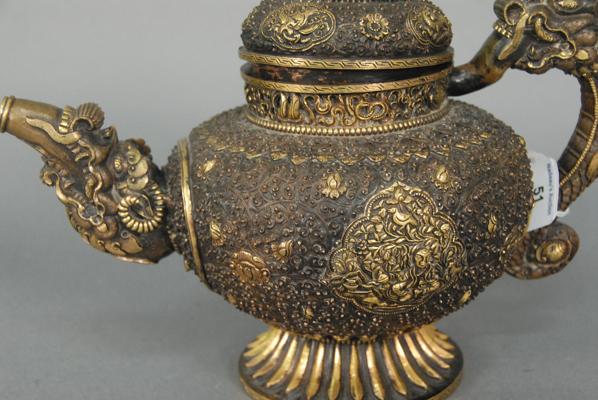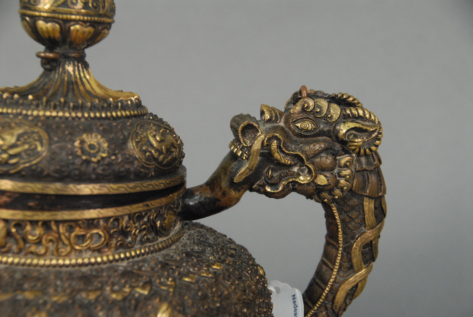 Lot 51: Bronze teapot with gold gilt carved scrolling flowers and panels having Buddha figure with bird handle and spout carved into a drago…
