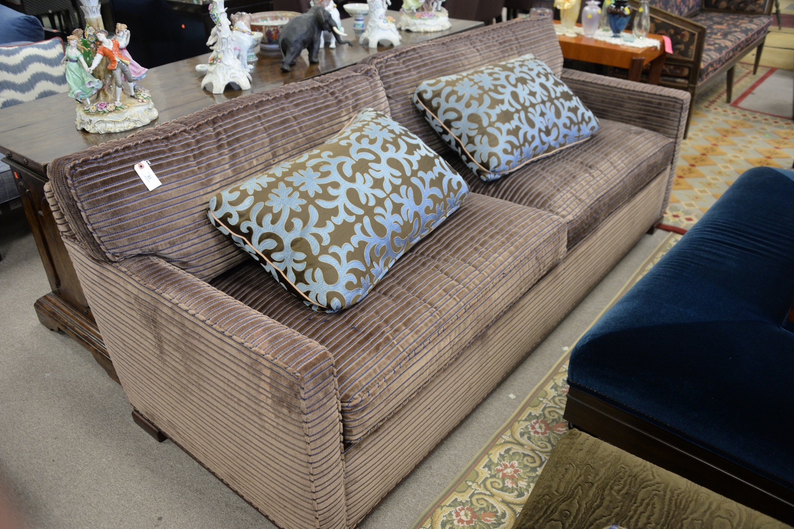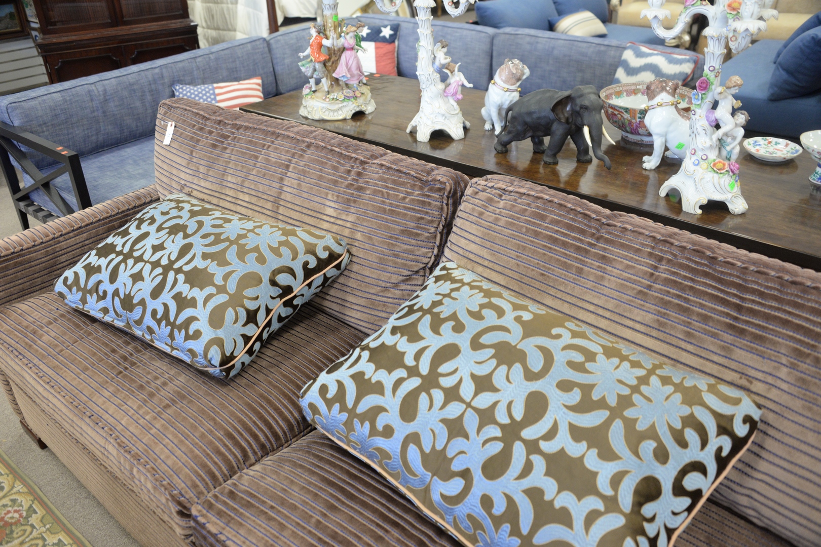 Lot 51: Charles Stewart and Custom Upholstered Sofa, having down pillows, length 89 inches. Provenance: David and Cynthia Kim, 22 Stoney Wylde Lane, Greenwich, Connecticut. View home by visiting: https://www.zillow.com/homedetails/22-Stoney-Wylde-Ln-Greenwich-CT-06830/177238281_zpid/