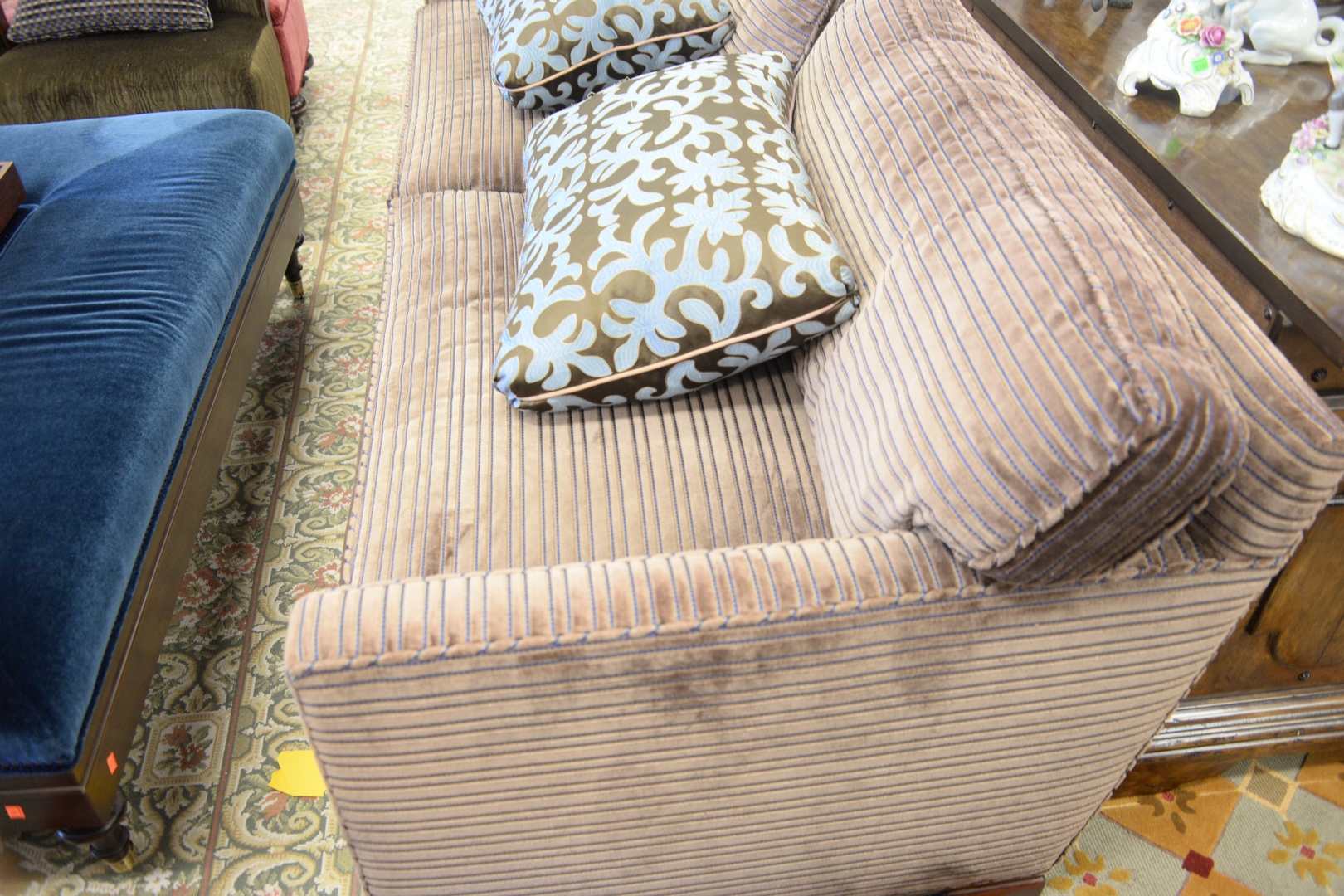 Charles Stewart and Custom Upholstered Sofa, having down pillows, length 89 inches. Provenance: David and Cynthia Kim, 22 Stoney Wylde Lane, Greenwich, Connecticut. View home by visiting: https://www.zillow.com/homedetails/22-Stoney-Wylde-Ln-Greenwich-CT-06830/177238281_zpid/