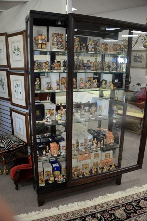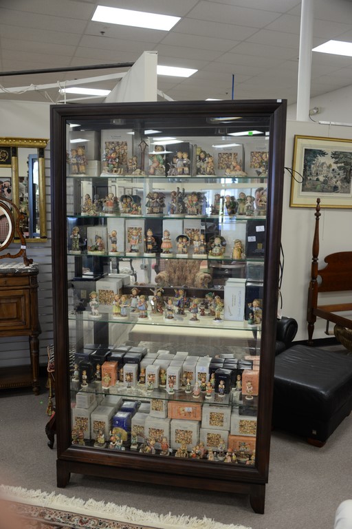 Contemporary lighted display cabinet having beveled glass sides and sliding door, interior fitted with five glass shelves. ht. 92in., wd. 46in., dp. 15in.