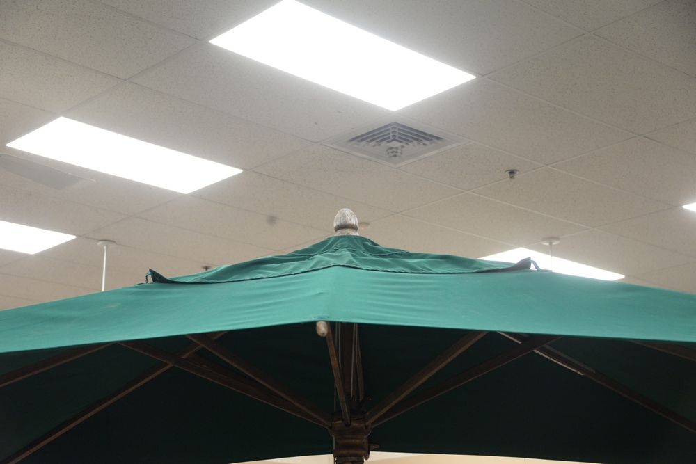 Country Casual Teak Outdoor Umbrella, top measuring 7′ x 11′, price when new $2,000, two small holes to top.