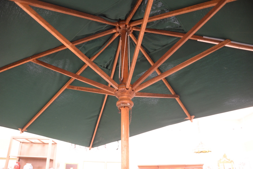 Lot 51: Country Casual Teak Outdoor Umbrella, top measuring 7′ x 11′, price when new $2,000, two small holes to top.