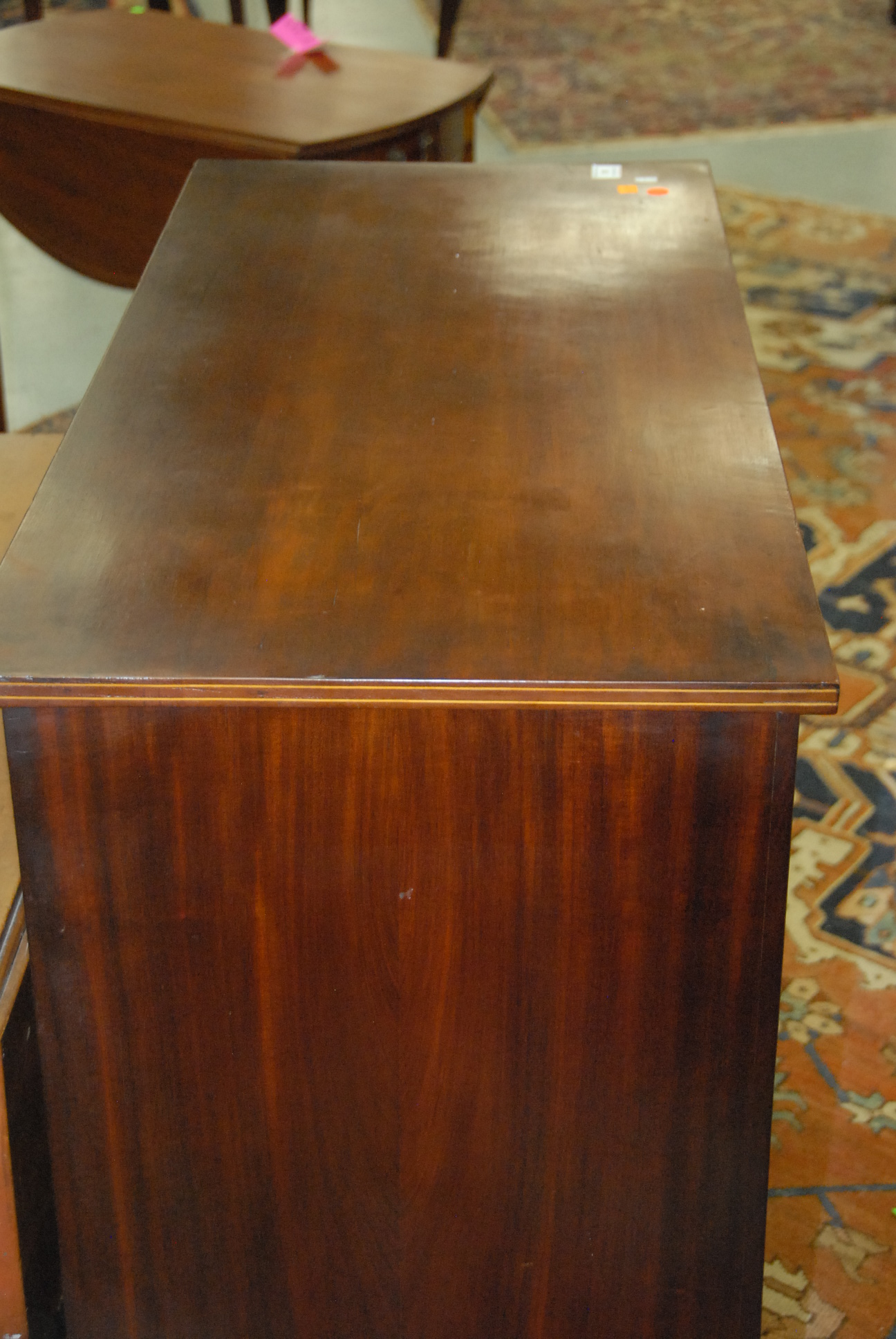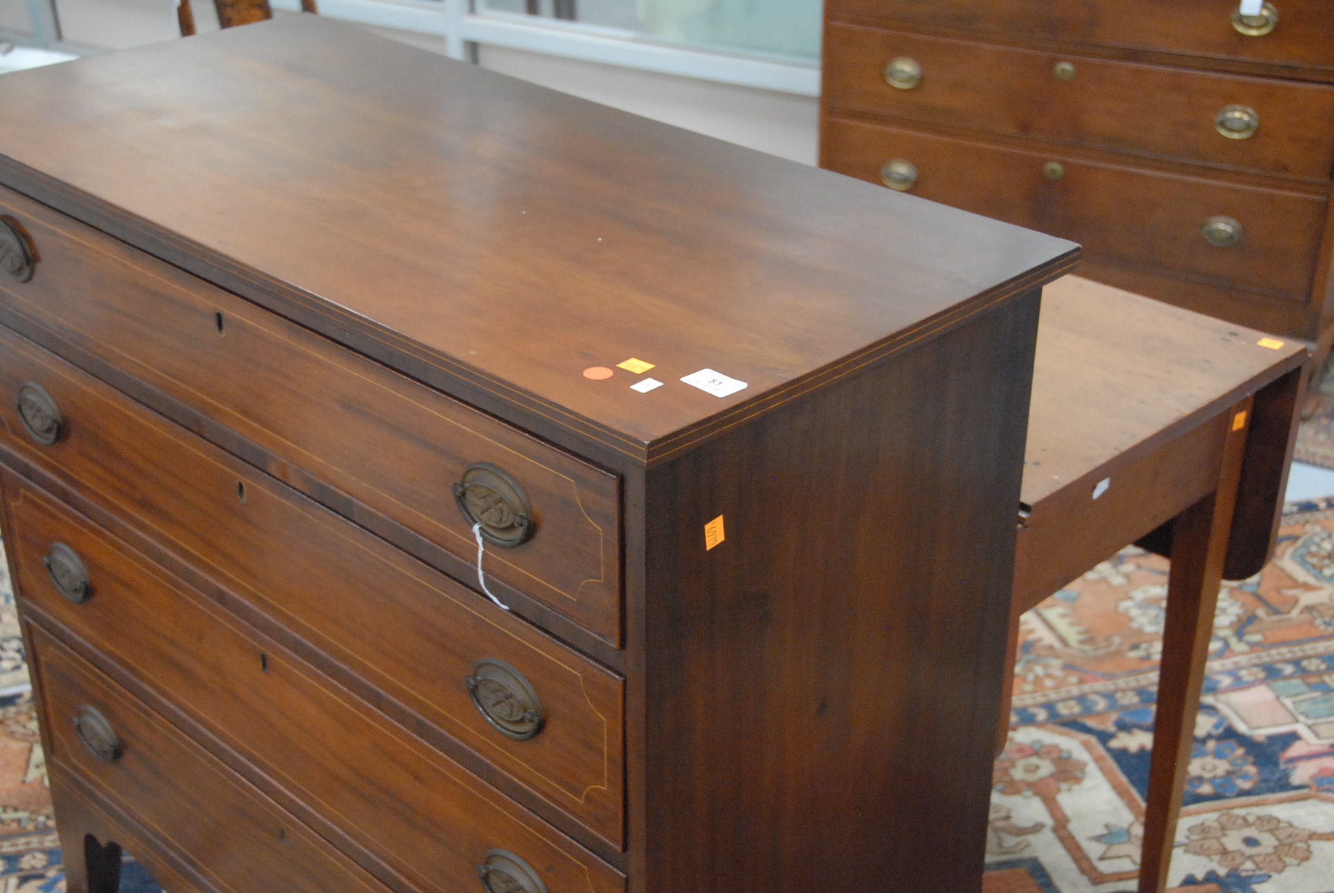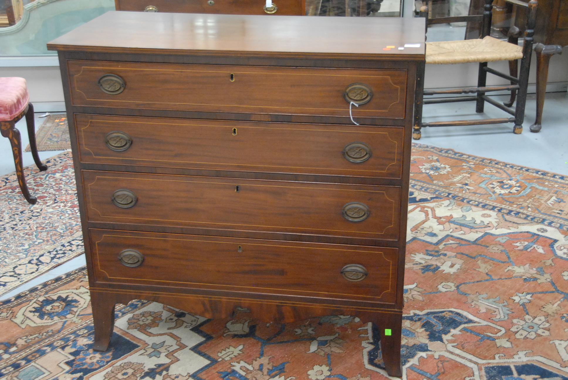 Lot 51: Federal four drawer chest having cherry top over four mahogany front drawers with line inlays all set on flared French feet, ht. 39in. wd. 39in.