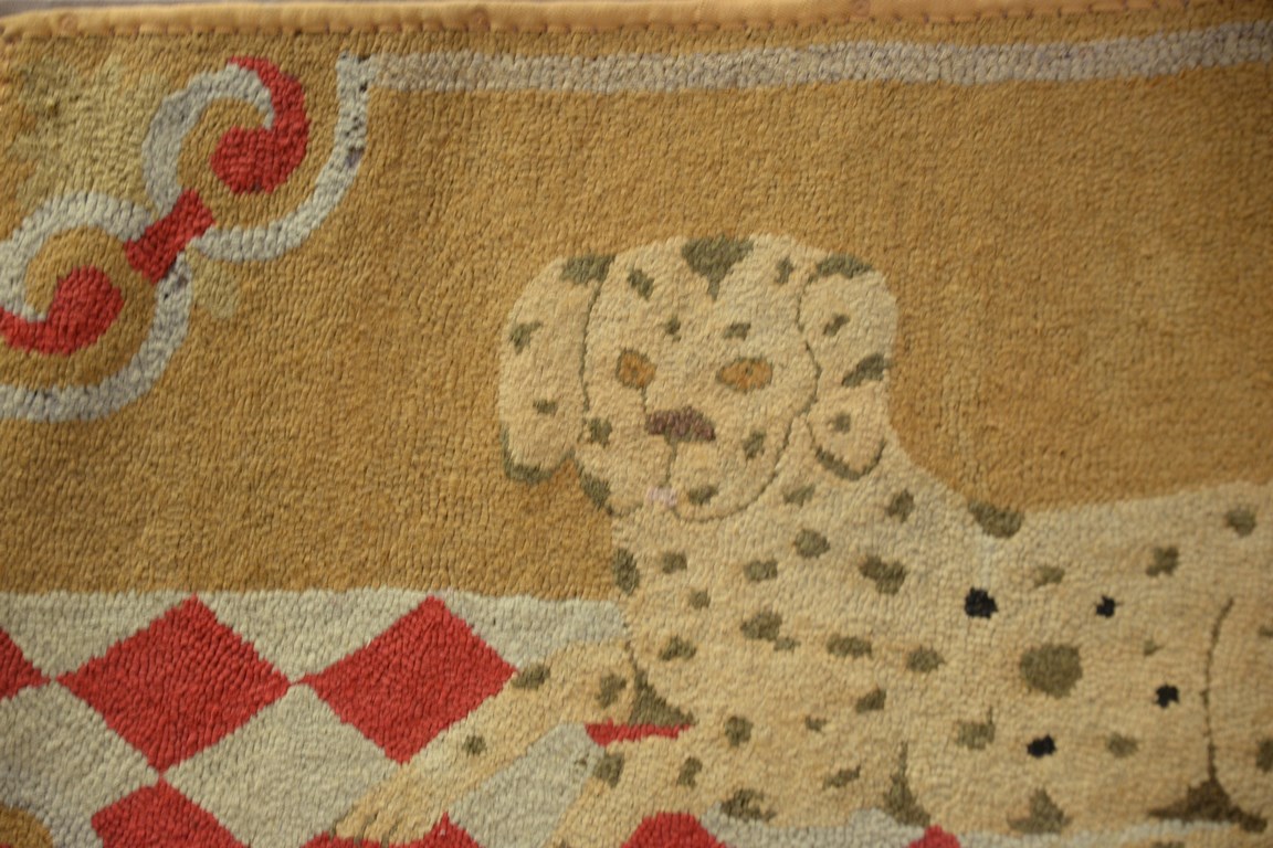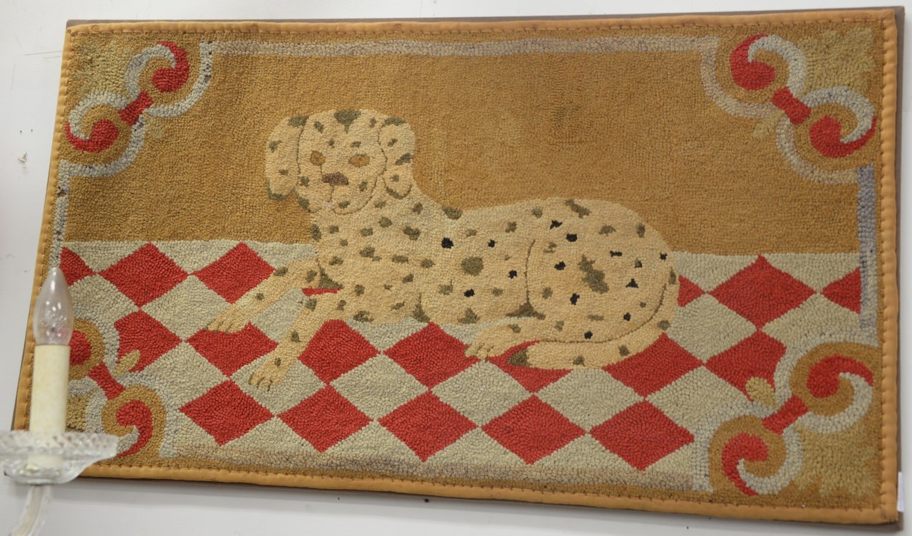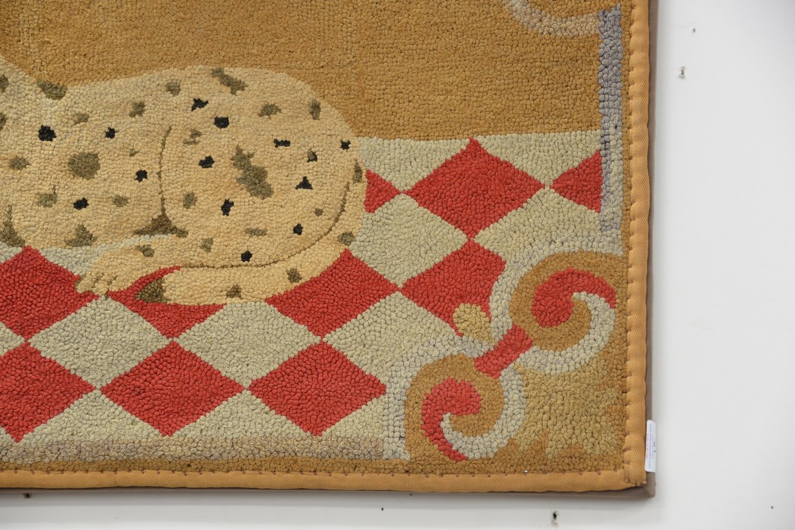 Folk Art hooked rug of dog on plaid floor. 22 x 39