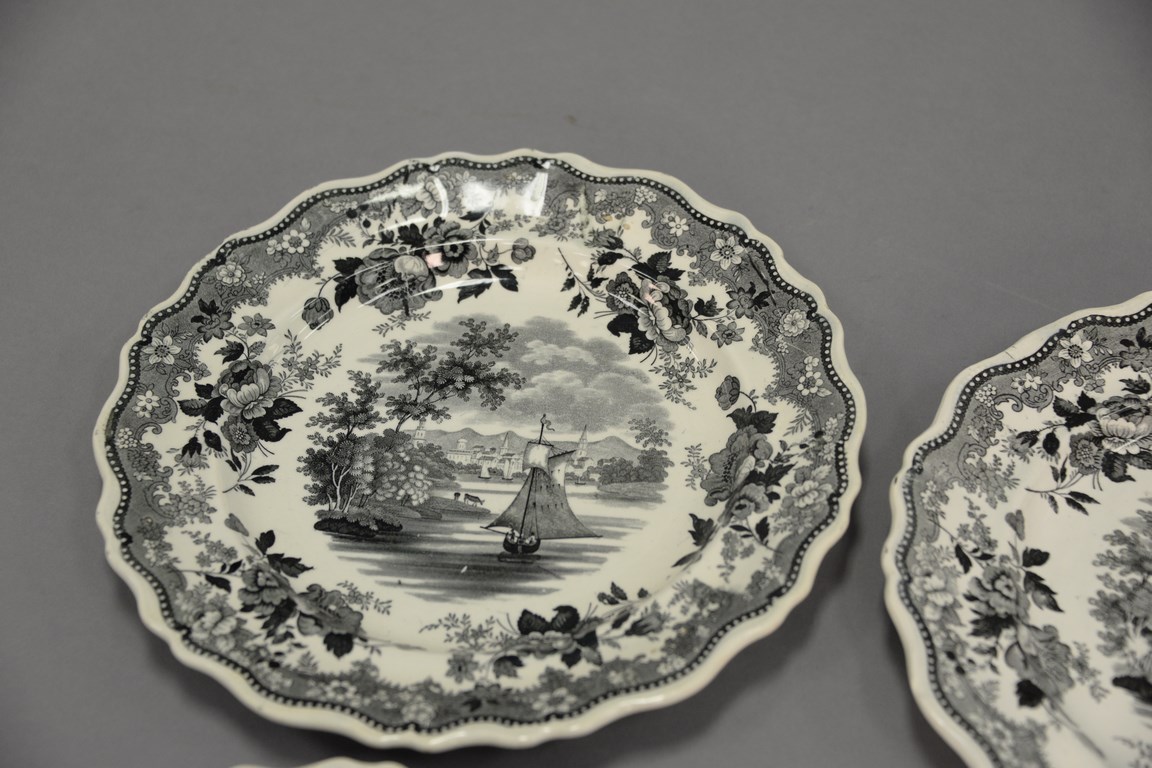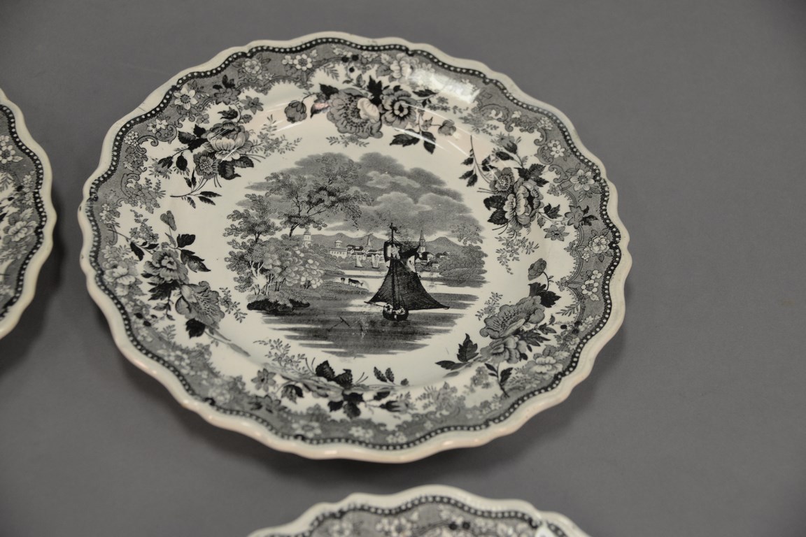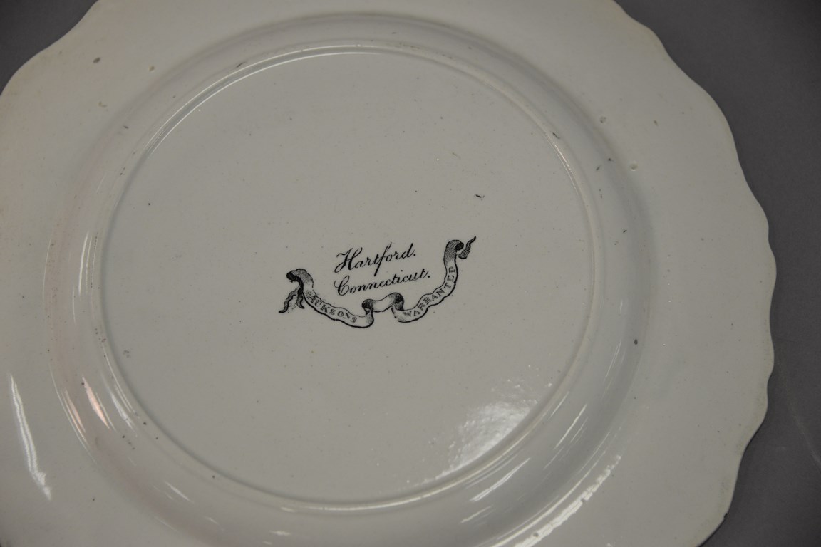 Four Staffordshire black and white plates with Hartford scenes, dia. 10 1/2 in.