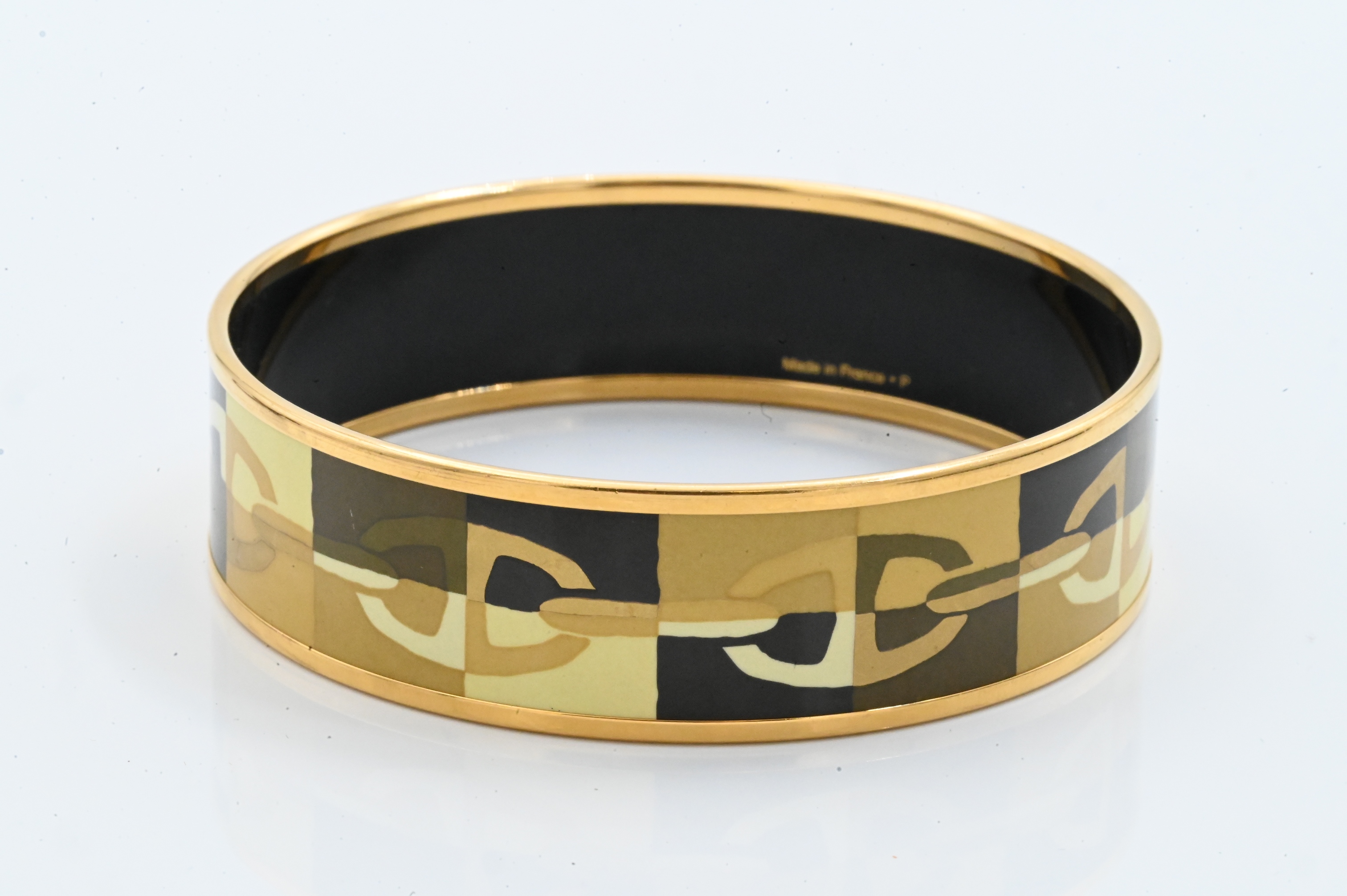 Stylish Hermès Paris bangle featuring a gold and brown chain-link equestrian motif on enamel, bordered by gilt metal rims. Marked Hermès Paris, Made in France. Includes original Hermès pouch.