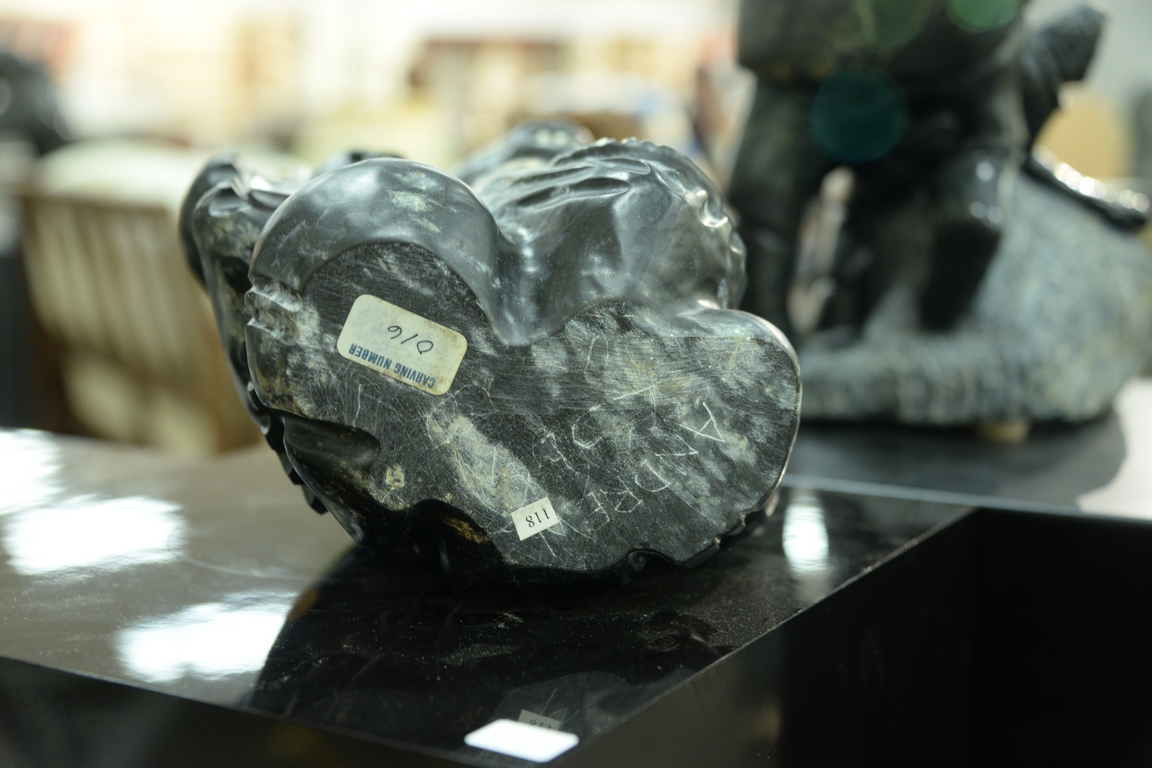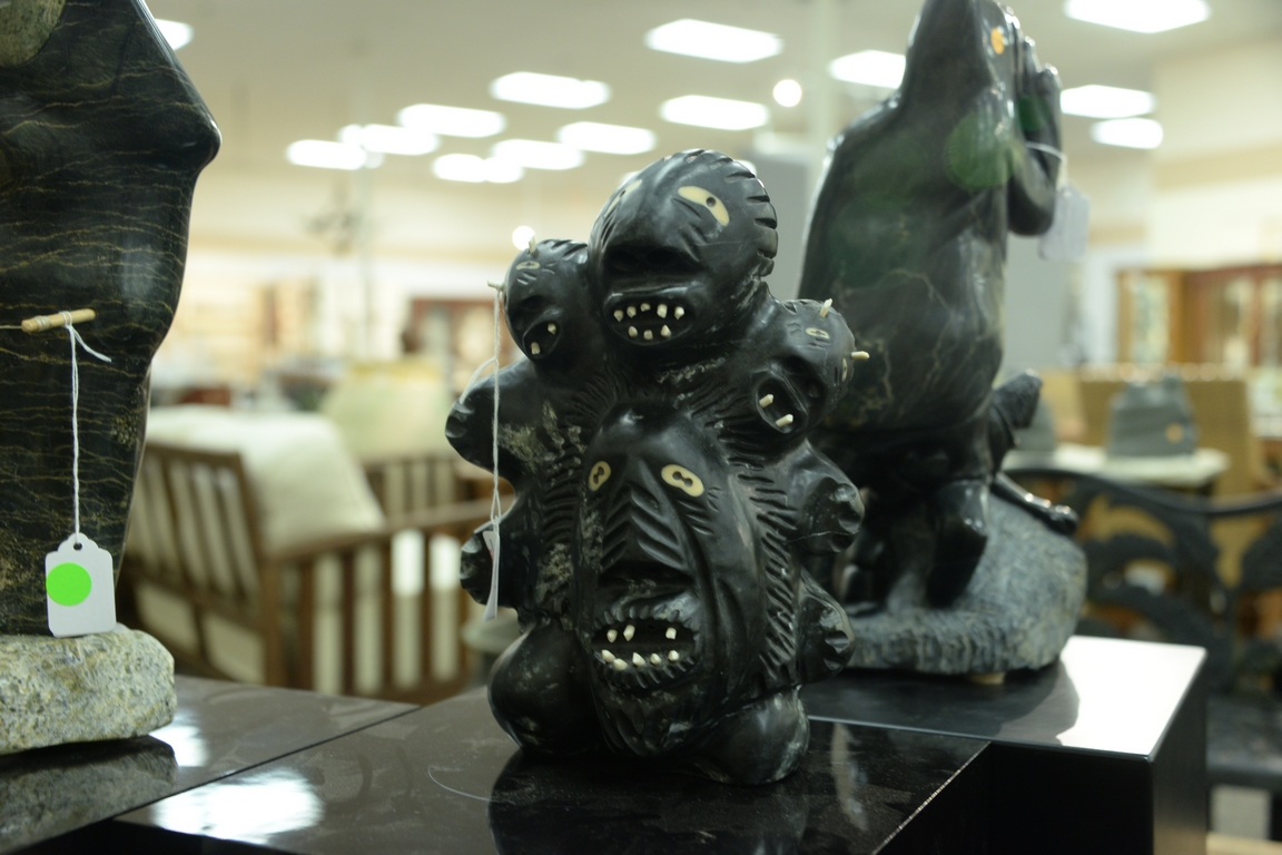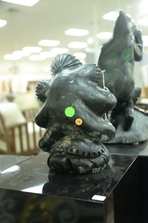Lot 51: Inuit Eskimo carving, Andy Palongayak, Gjoa Haven, Suicide Heads, basalt with eyes and teeth on pedestal. ht. 16in., pedestal ht. 30…