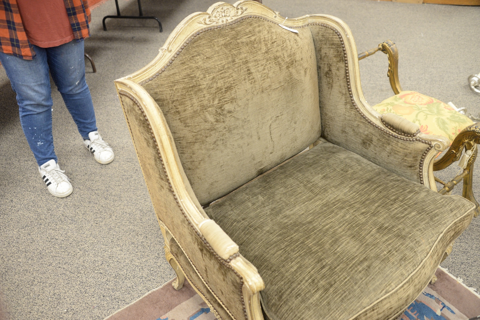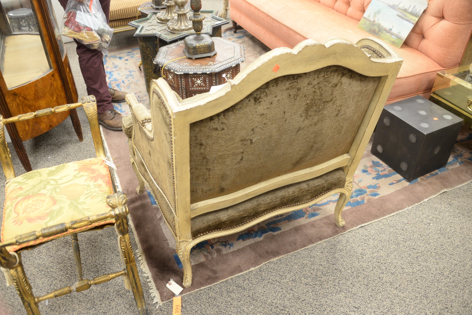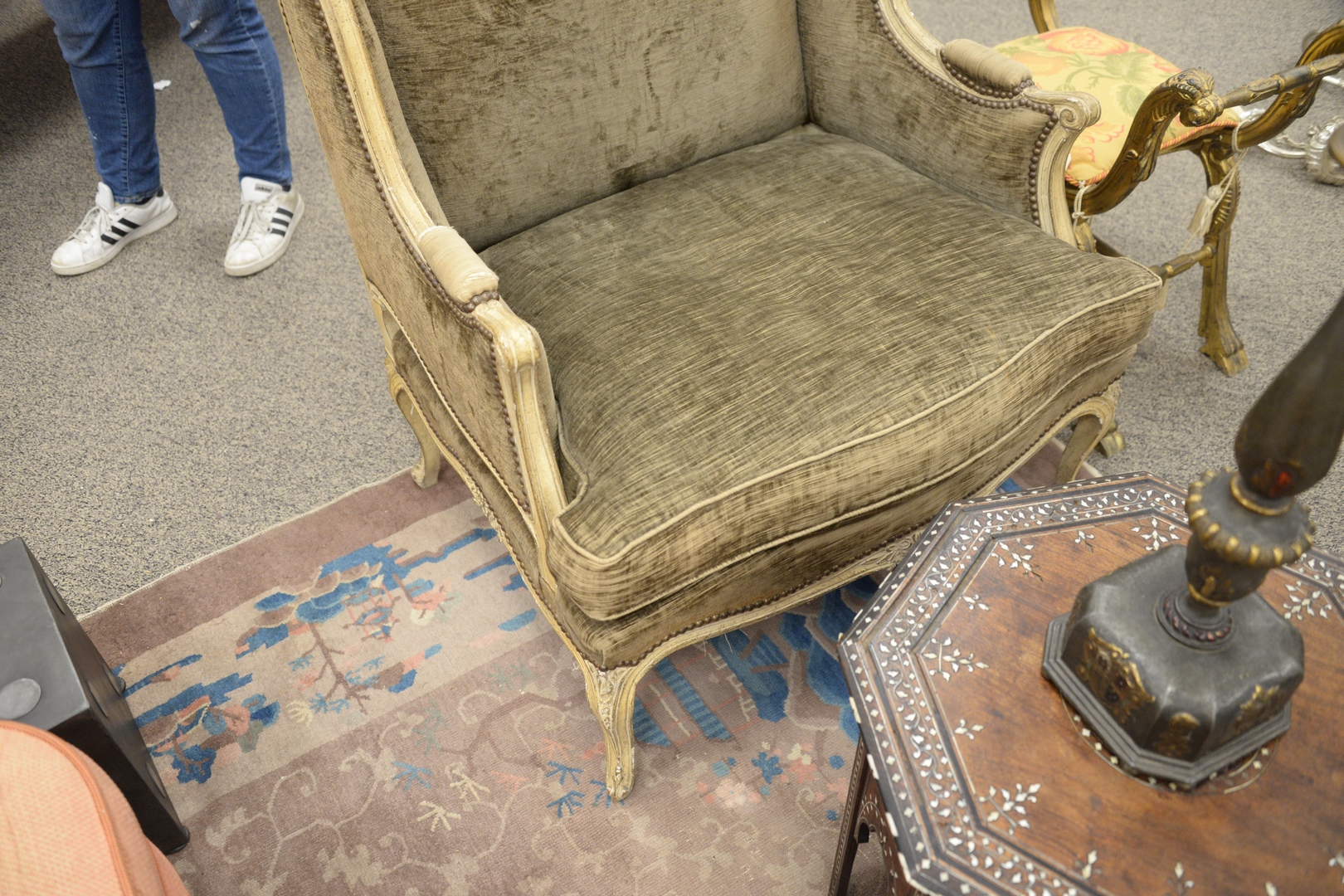 Lot 51: Louis XV Style Bergere, in old velvet upholstery, height 39 1/2 inches, width 31 inches, worn.