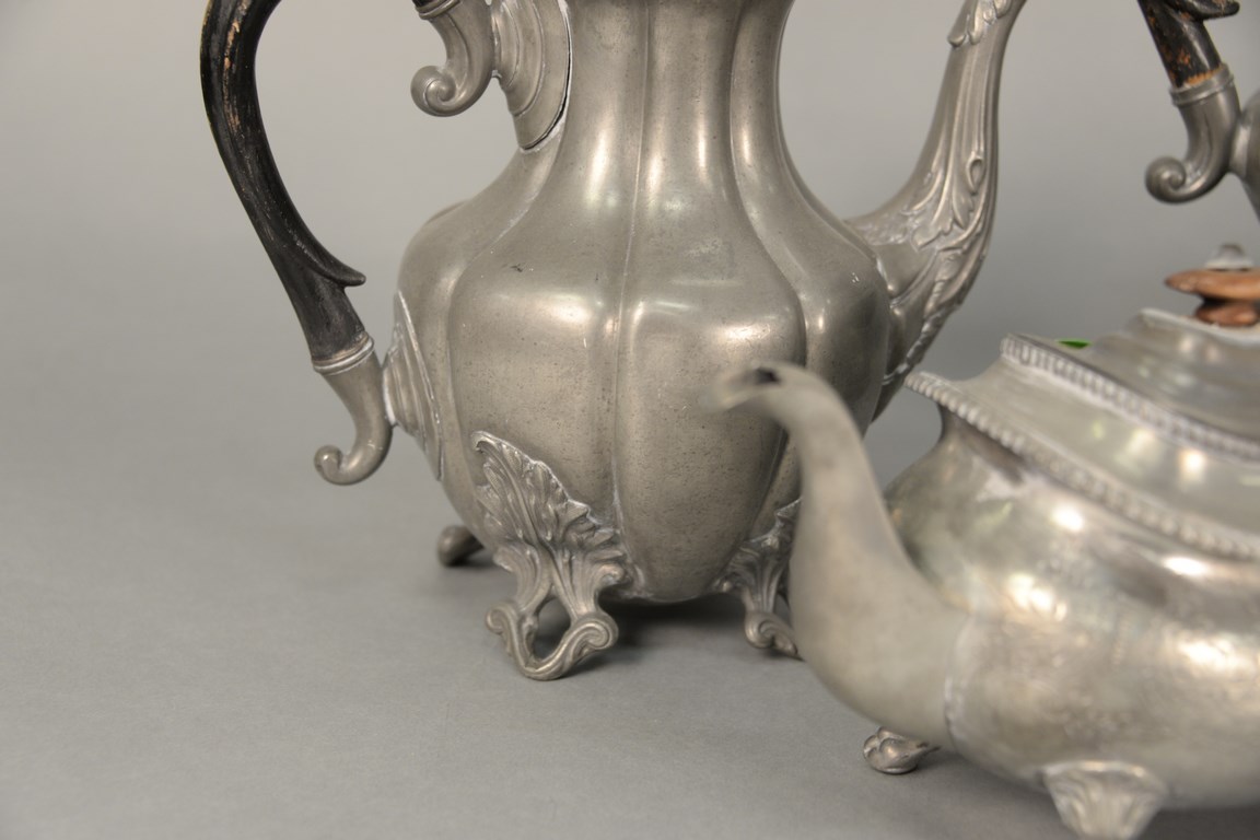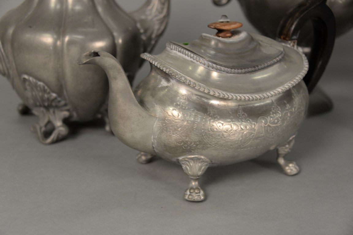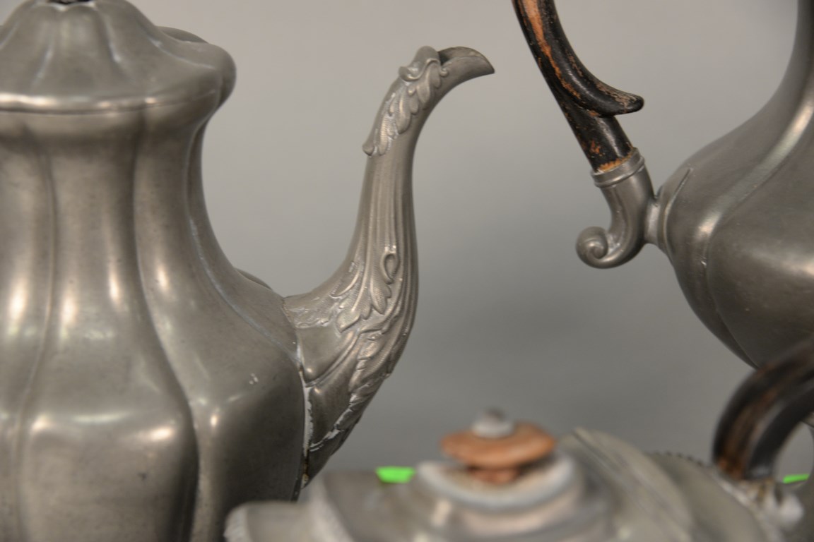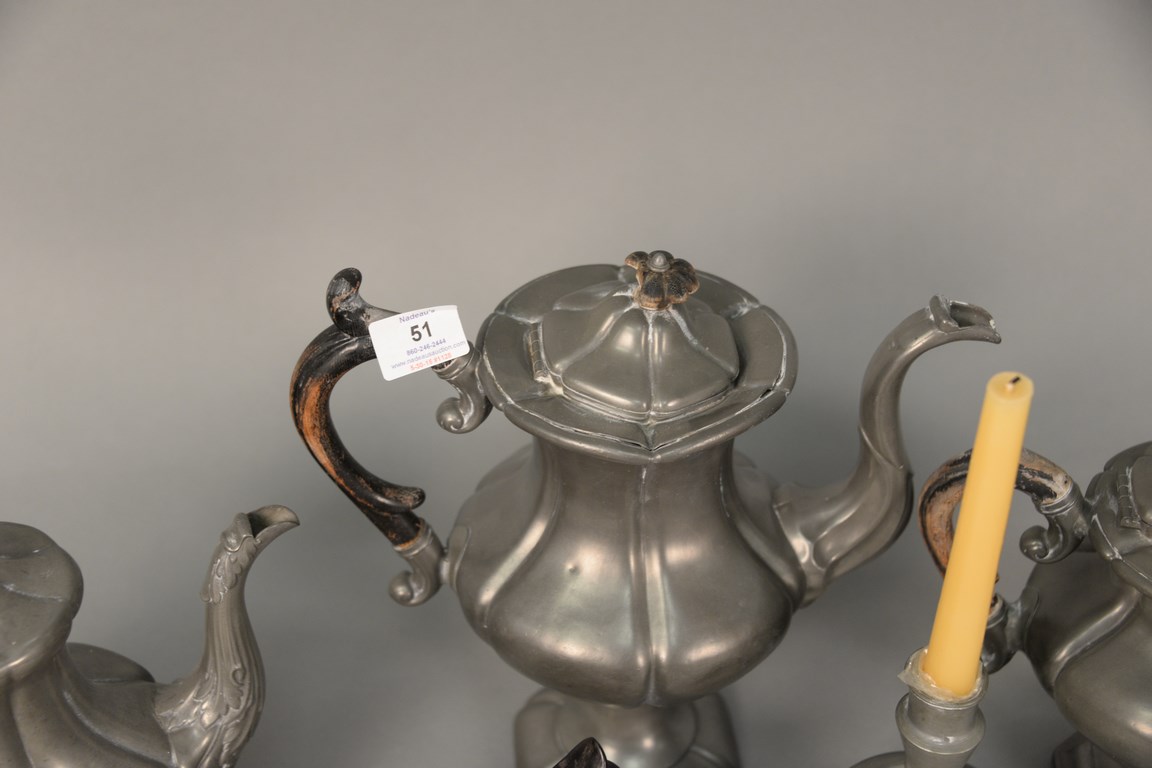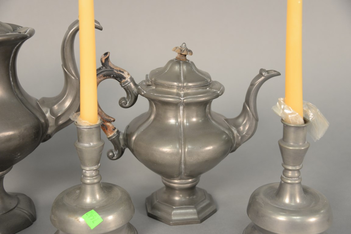 Pewter six piece lot including four coffee and teapots, and pair of candlesticks ht. 7 in.