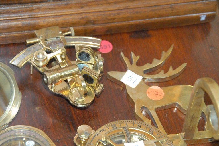 Lot 51: Seven piece lot of reproduction brass compasses, two sextant engines, telegraph, and brass hook with deer.