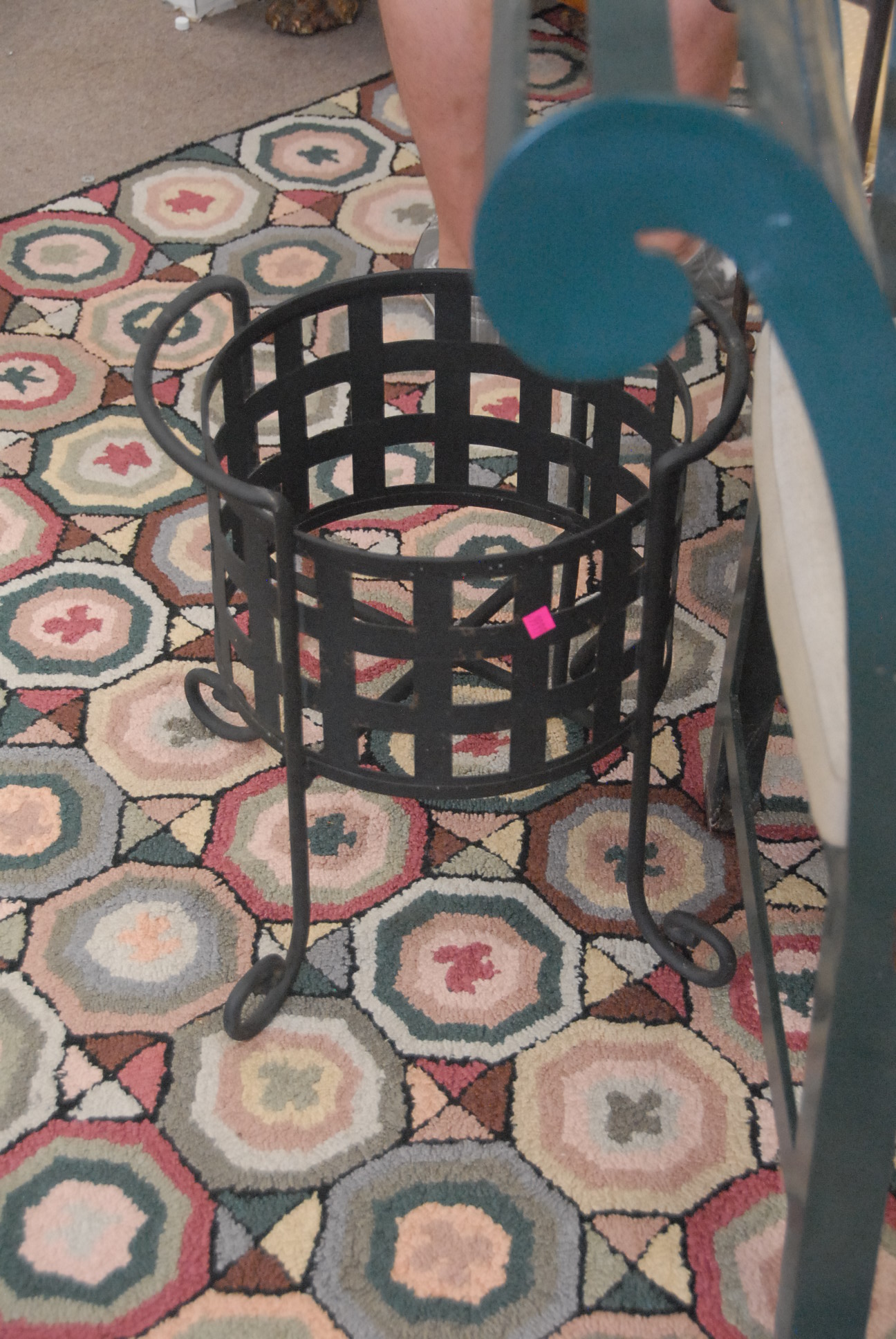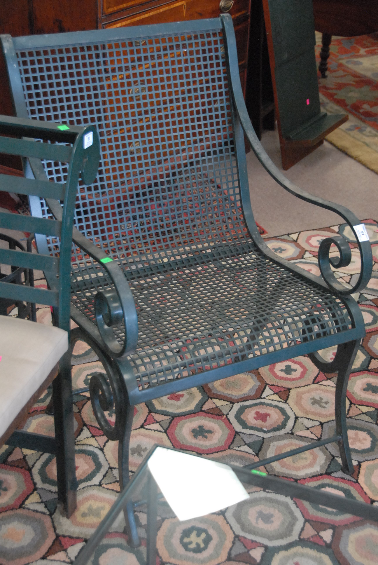 Lot 51: Six piece lot including two armchairs, two glass top iron tables with paw feet, and pair of iron urns.