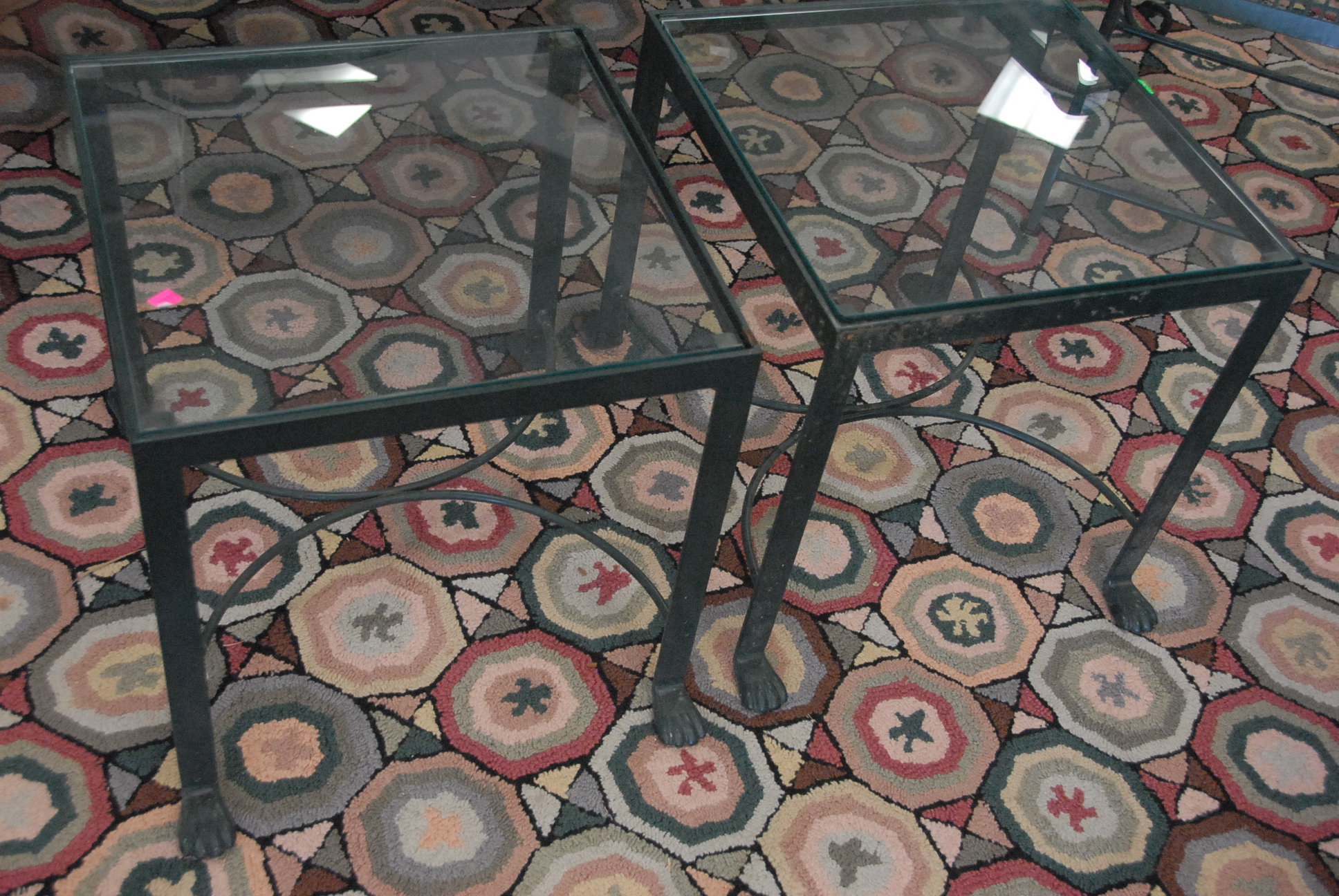 Six piece lot including two armchairs, two glass top iron tables with paw feet, and pair of iron urns.