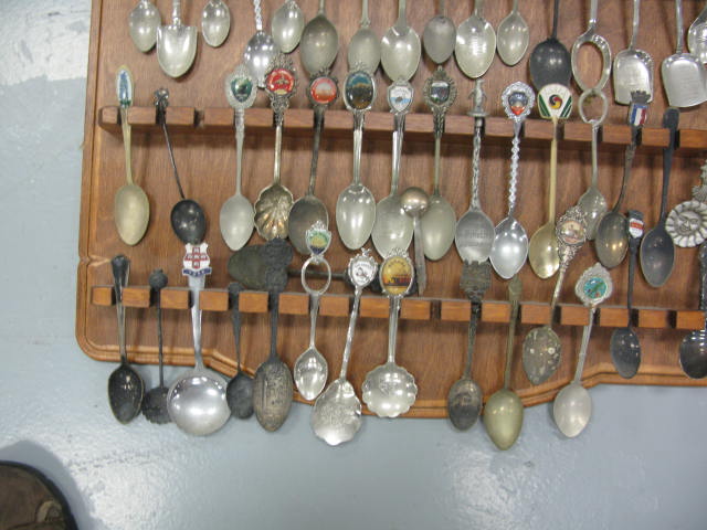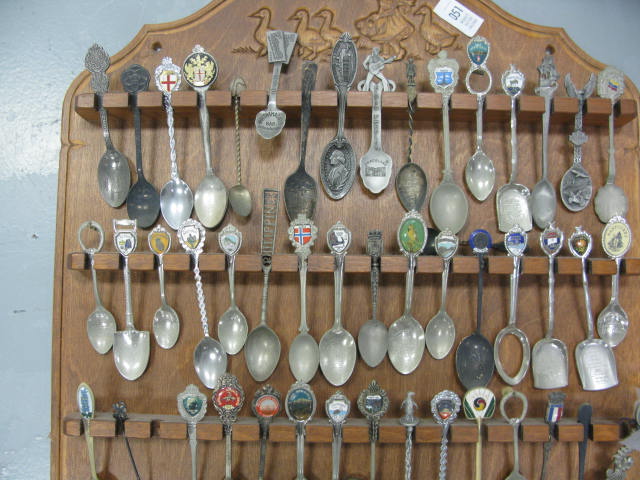 Spoon rack of souvenir spoons with silver and silver plated spoons
