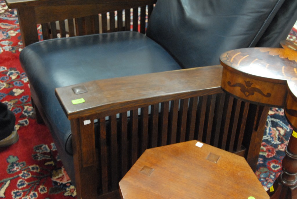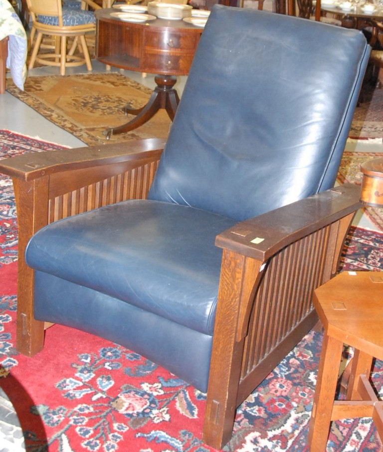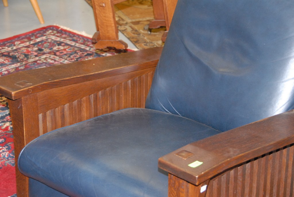 Stickley oak Morris chair with navy blue cushions, late 20th century.