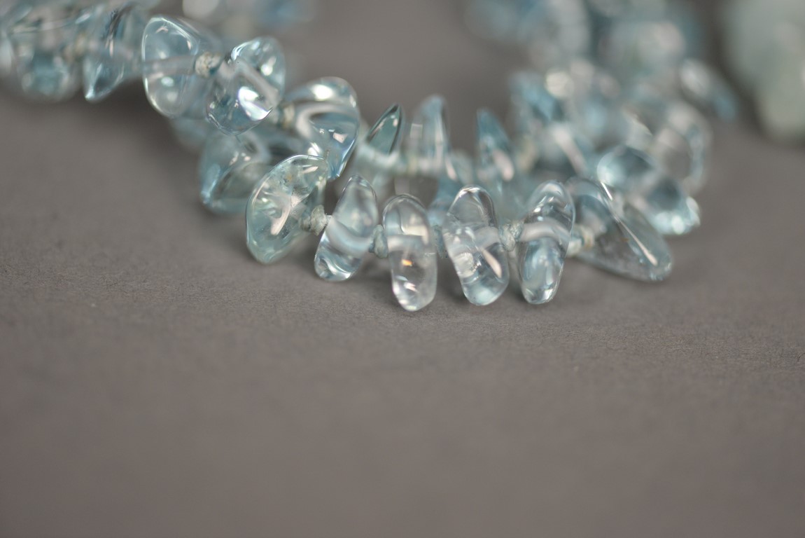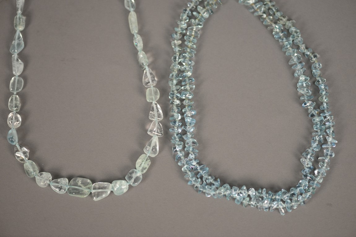 Lot 51: Three aquamarine bead necklaces, two with 14K gold clasps and one with sterling silver. lg. 32 in. lg. 17 1/2 in. lg. 20 in.